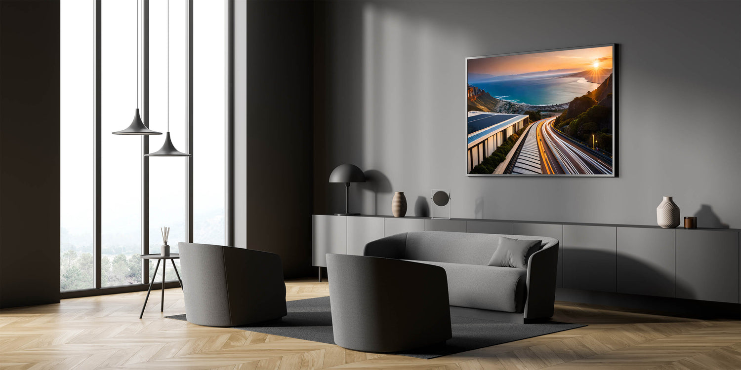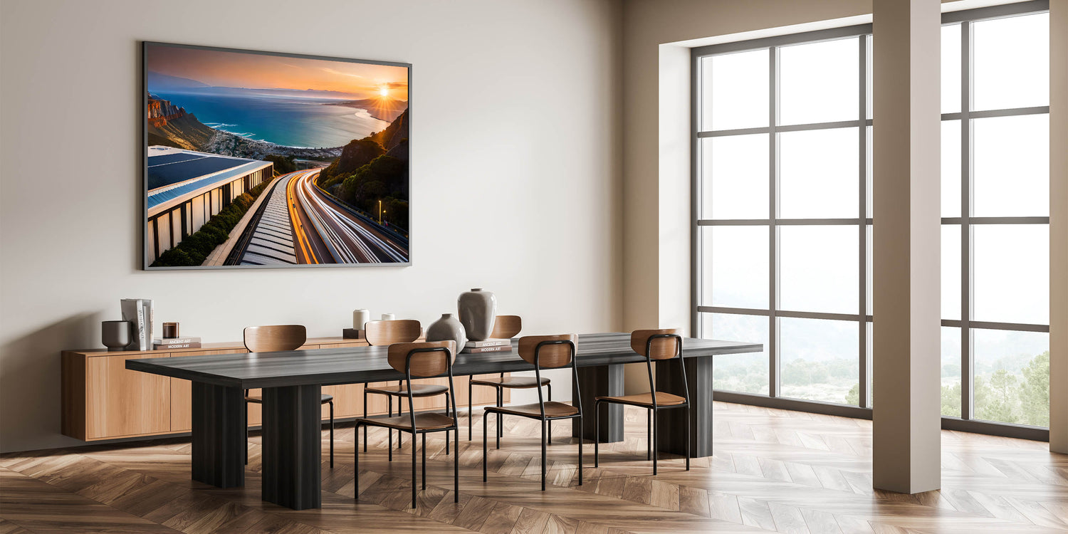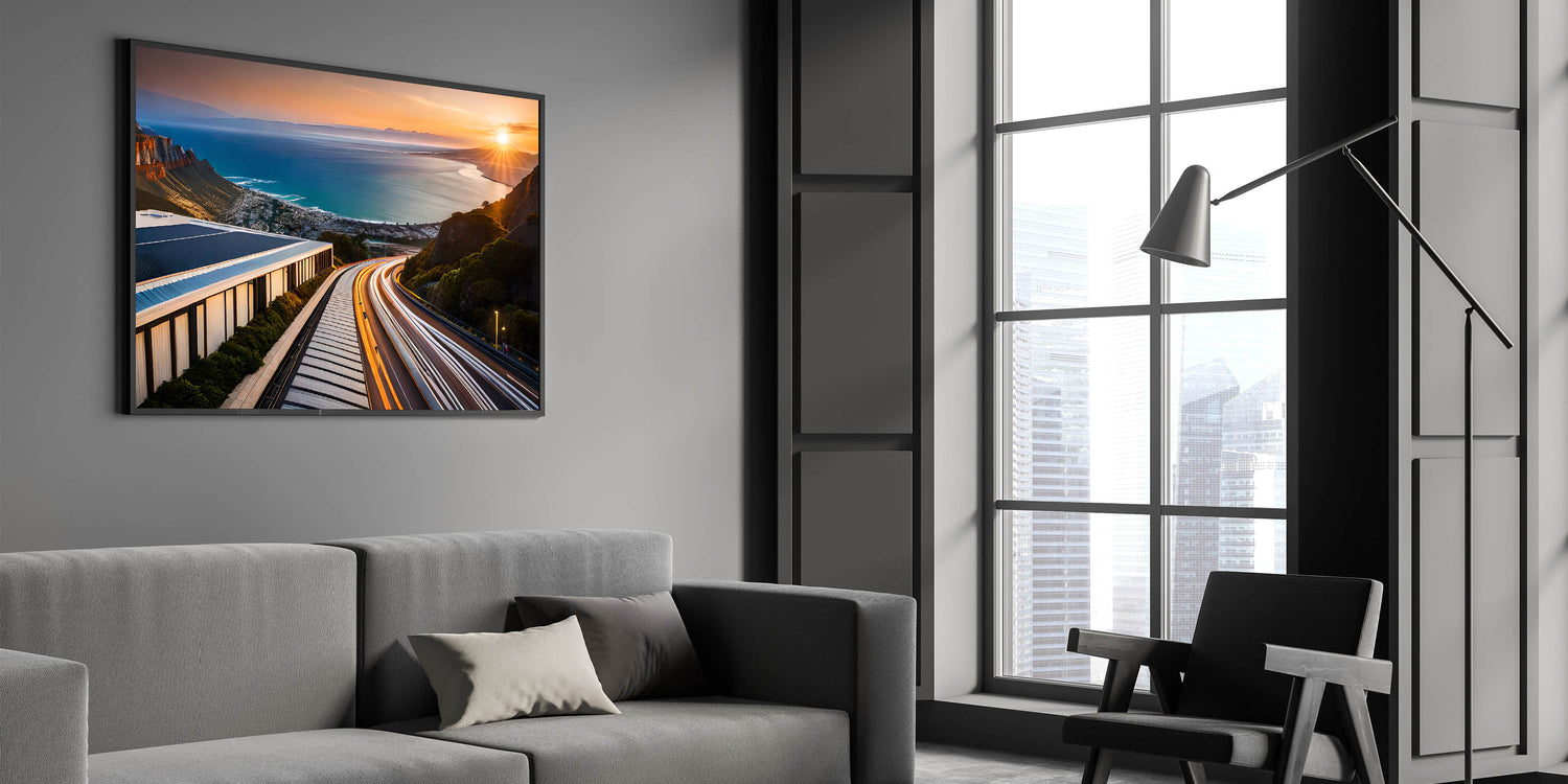 Experience the breathtaking beauty of South Africa’s coastline with this striking wall art featuring a stunning sunset over a winding coastal road. The vibrant streaks of light from the road’s traffic blend seamlessly with the warm colors of the setting sun, while the expansive view of the ocean stretches into the horizon. This artwork captures the dynamic contrast between the tranquility of the ocean and the vibrant energy of the road, making it a perfect piece for lovers of travel, adventure, and scenic beauty.