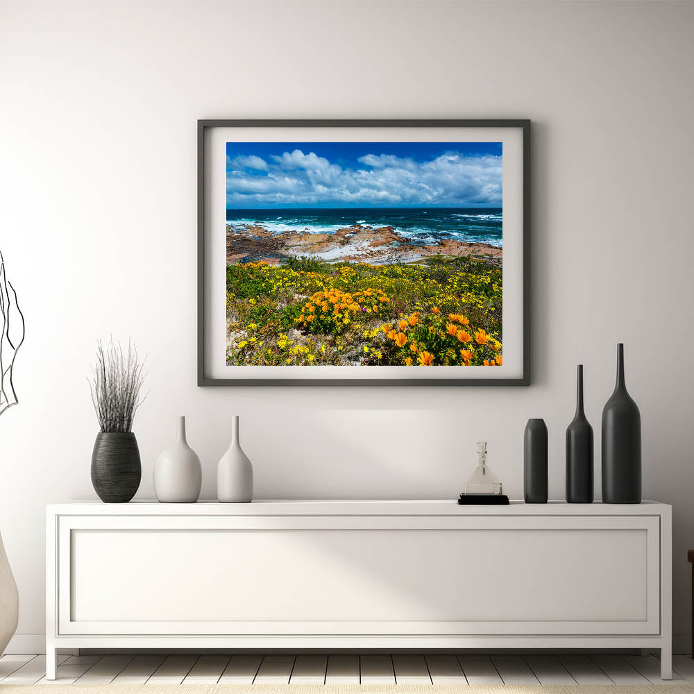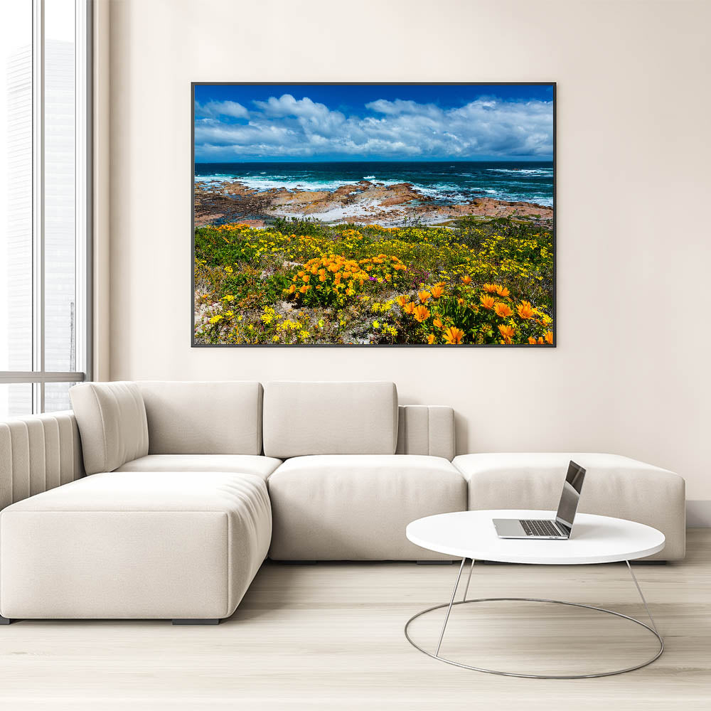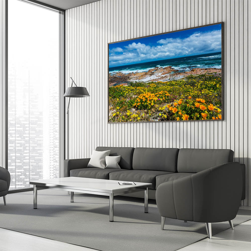 Celebrate the vibrant beauty of South Africa’s coastline with this breathtaking wall art that combines bright wildflowers with the striking blues of the ocean. This artwork captures the essence of South Africa’s rugged coastlines and colorful flora, offering a perfect balance of land and sea. The rich contrast between the blooming flowers and the deep ocean waves evokes feelings of peace and inspiration, making it an ideal addition to any space.