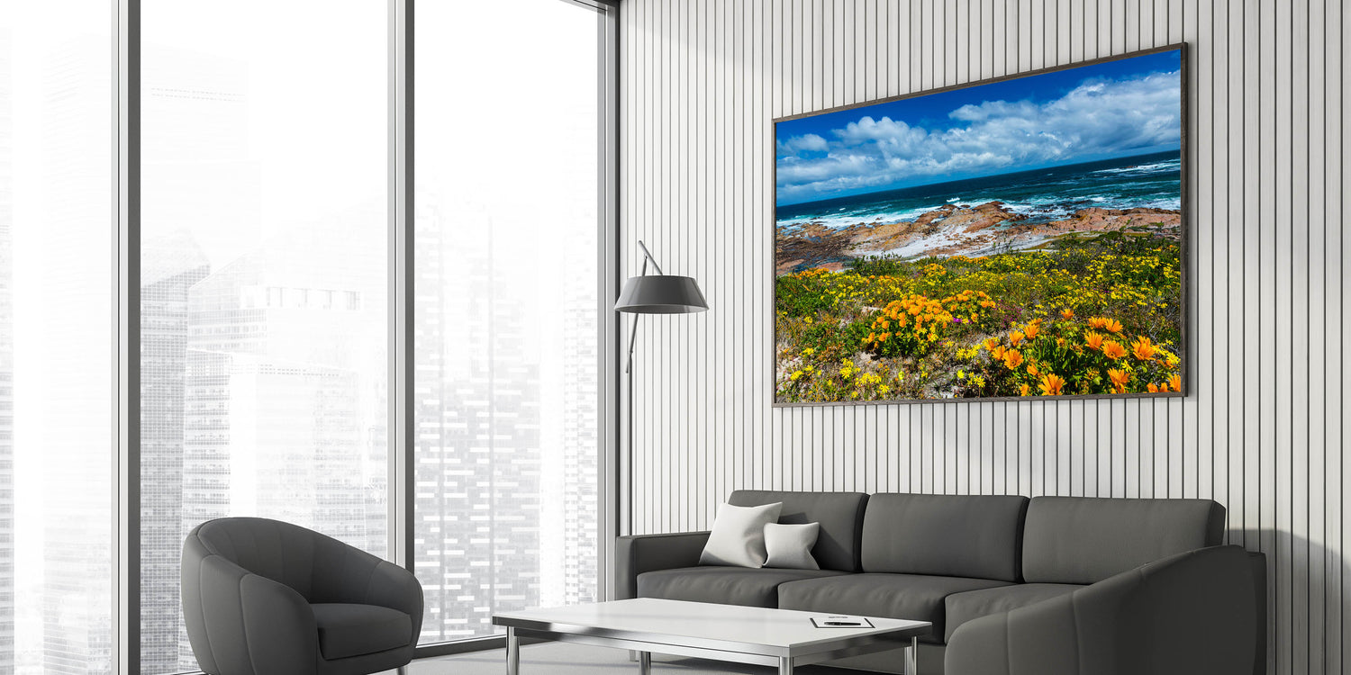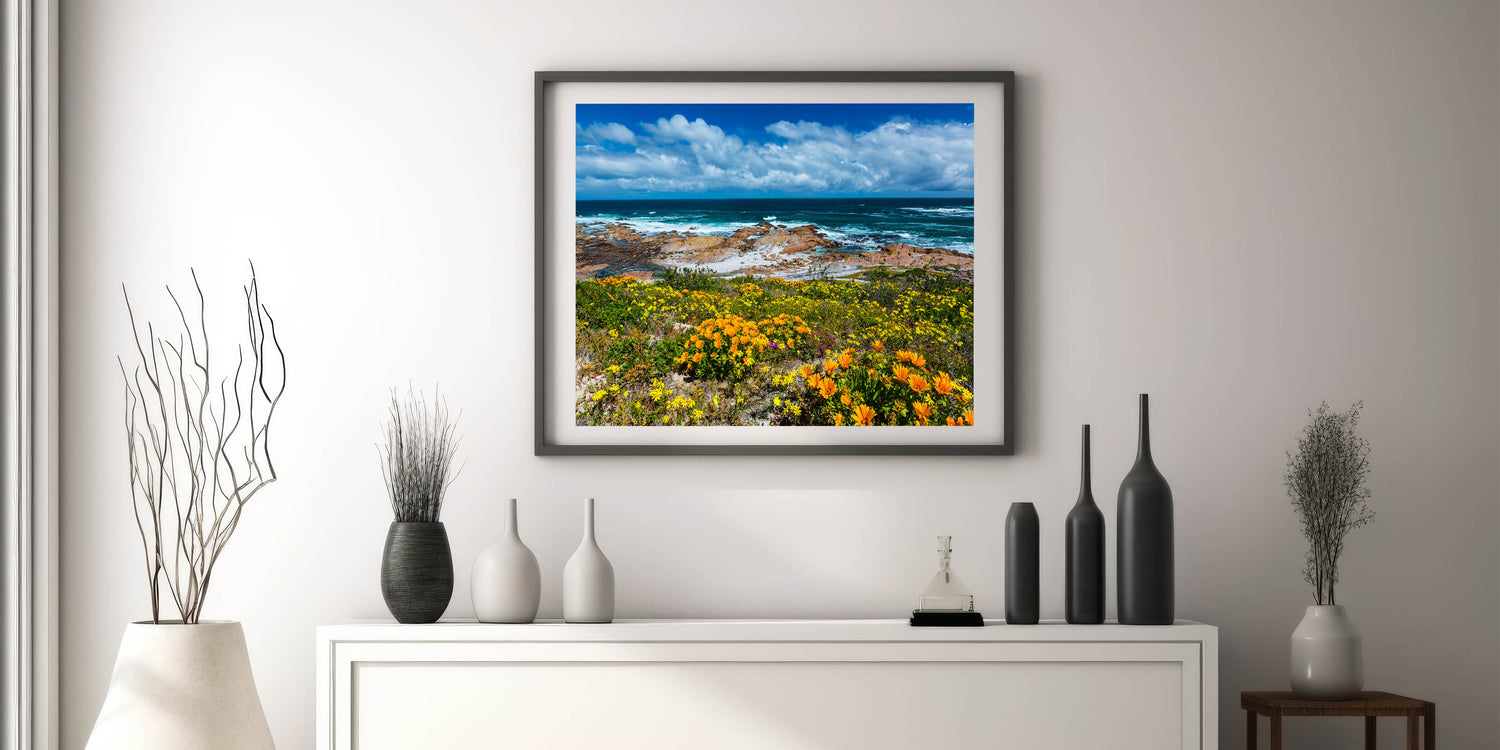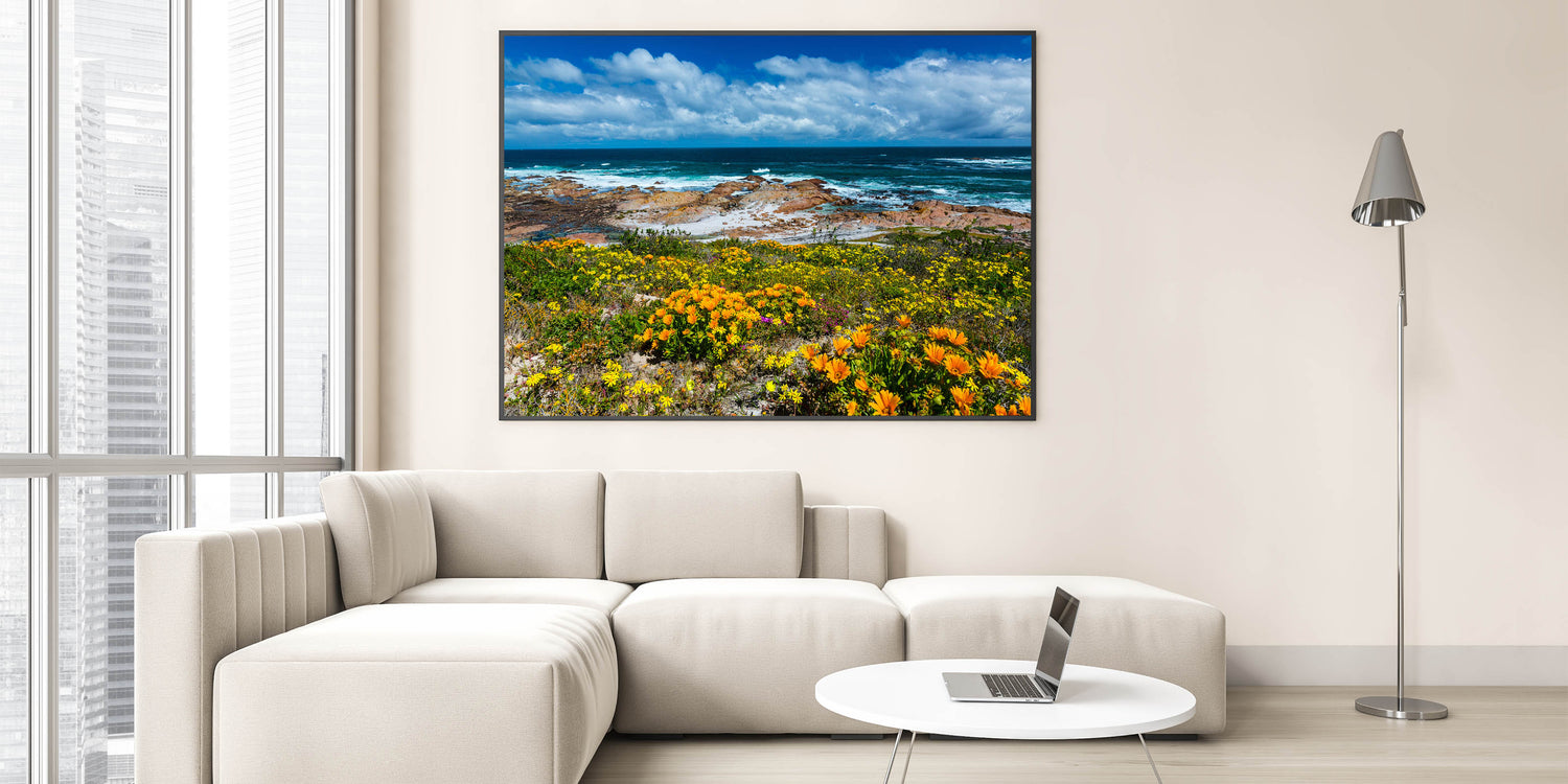 Celebrate the vibrant beauty of South Africa’s coastline with this breathtaking wall art that combines bright wildflowers with the striking blues of the ocean. This artwork captures the essence of South Africa’s rugged coastlines and colorful flora, offering a perfect balance of land and sea. The rich contrast between the blooming flowers and the deep ocean waves evokes feelings of peace and inspiration, making it an ideal addition to any space.