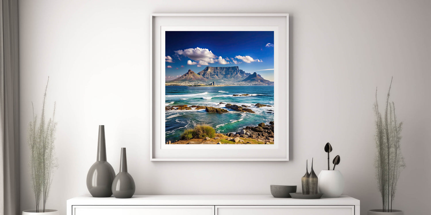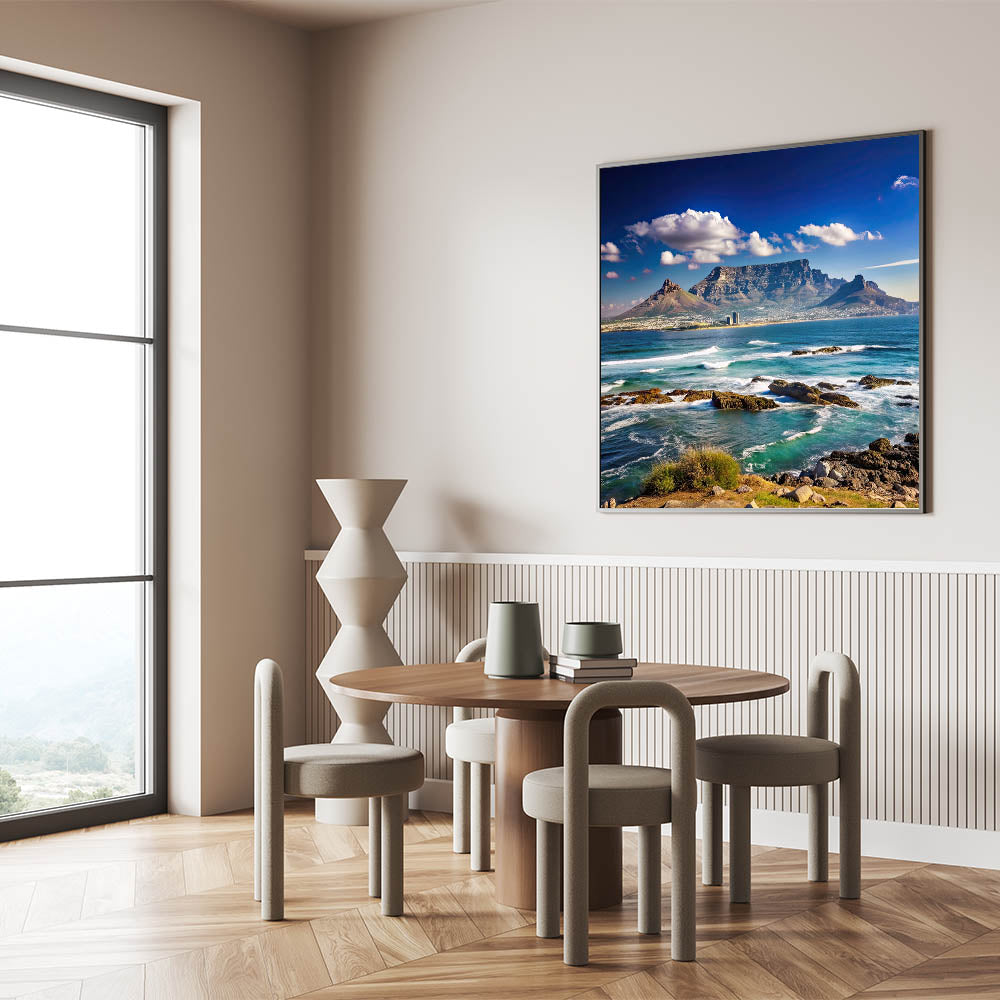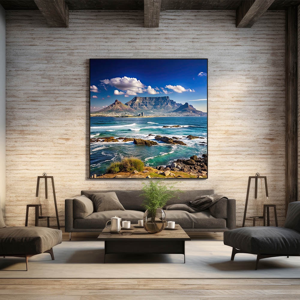 Experience the majesty of South Africa’s coastline with this beautiful wall art, featuring the iconic Table Mountain towering over the blue waters of Cape Town’s shoreline. The dynamic waves crashing against the rocks, set against a backdrop of clear skies and rugged mountains, bring a sense of calm and grandeur to any space. This artwork captures the natural beauty of South Africa and is perfect for anyone looking to add a touch of nature to their decor.