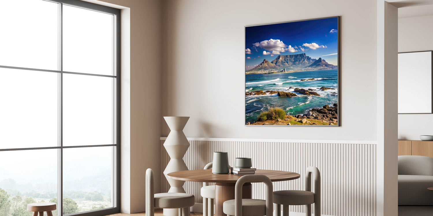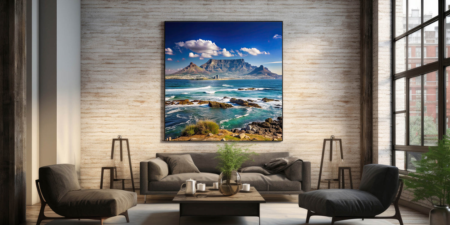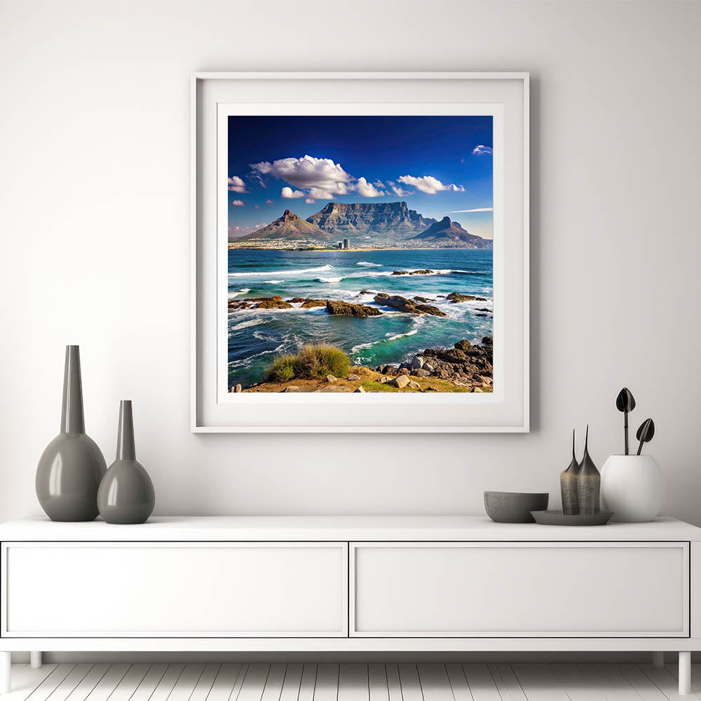 Experience the majesty of South Africa’s coastline with this beautiful wall art, featuring the iconic Table Mountain towering over the blue waters of Cape Town’s shoreline. The dynamic waves crashing against the rocks, set against a backdrop of clear skies and rugged mountains, bring a sense of calm and grandeur to any space. This artwork captures the natural beauty of South Africa and is perfect for anyone looking to add a touch of nature to their decor.