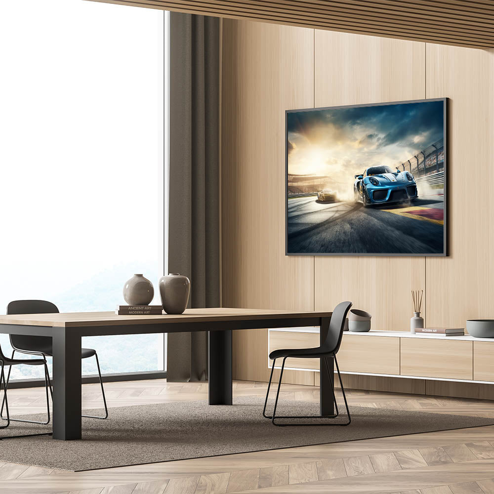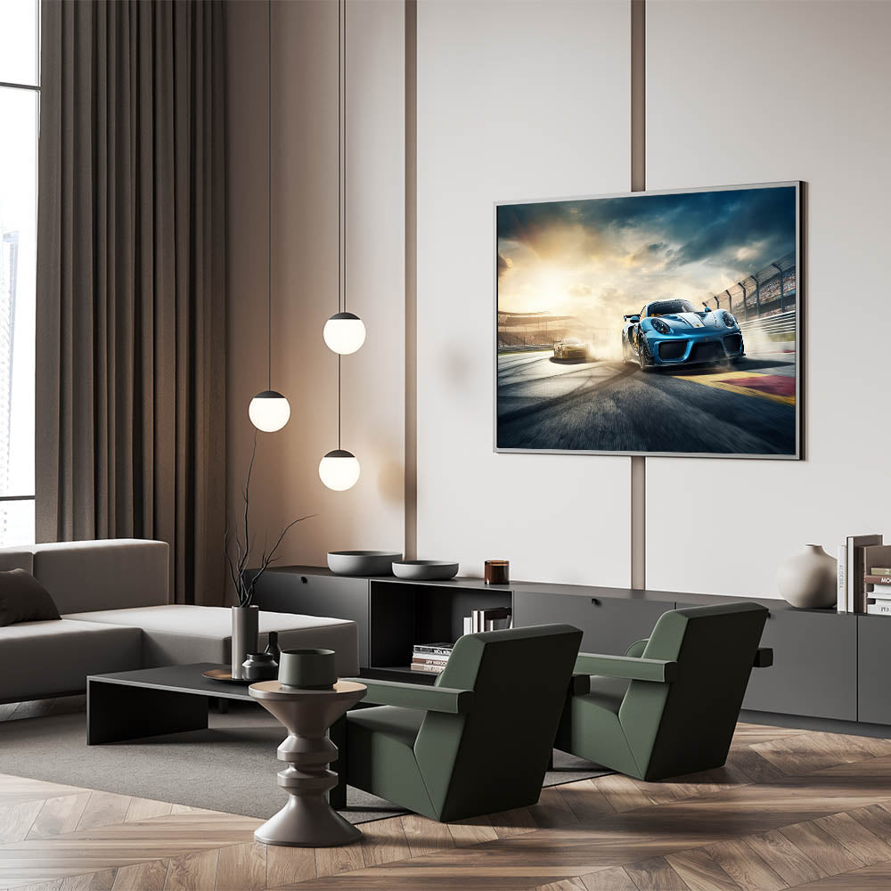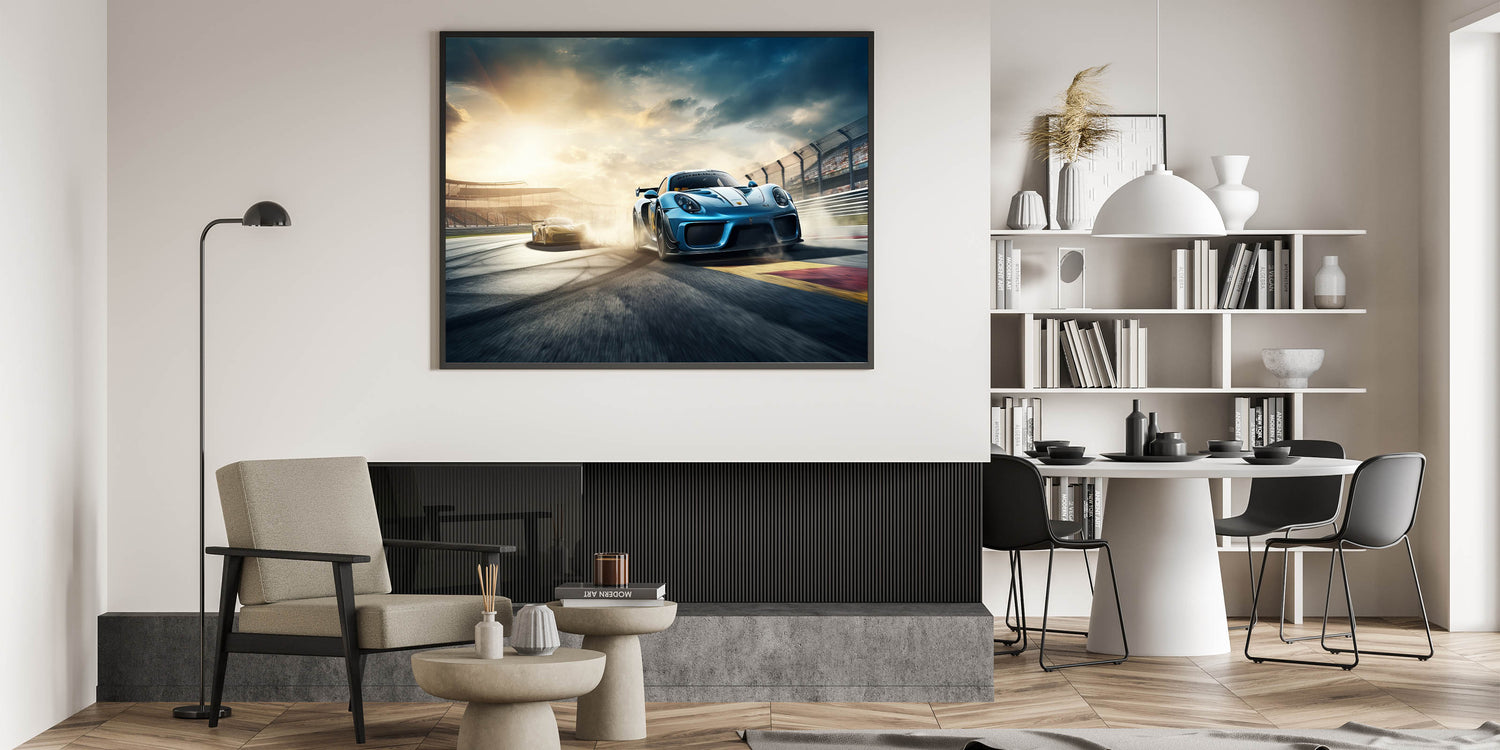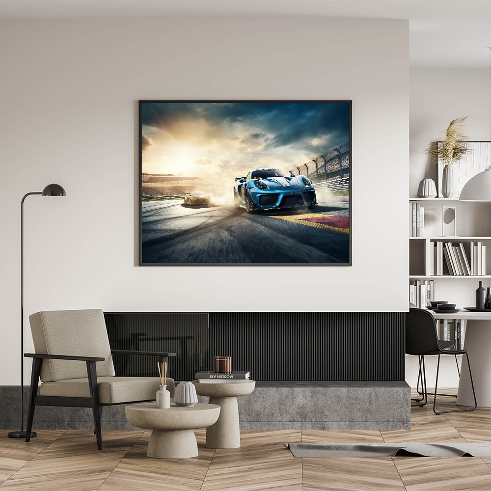 Bring the thrill of the racetrack into your space with this dynamic sports car racing wall art. This speedway canvas print captures the energy and precision of high-performance cars in action, making it a perfect addition to any modern living space, office, or garage. The striking blue sports car and detailed background create a sense of movement and excitement, ideal for motorsport enthusiasts.