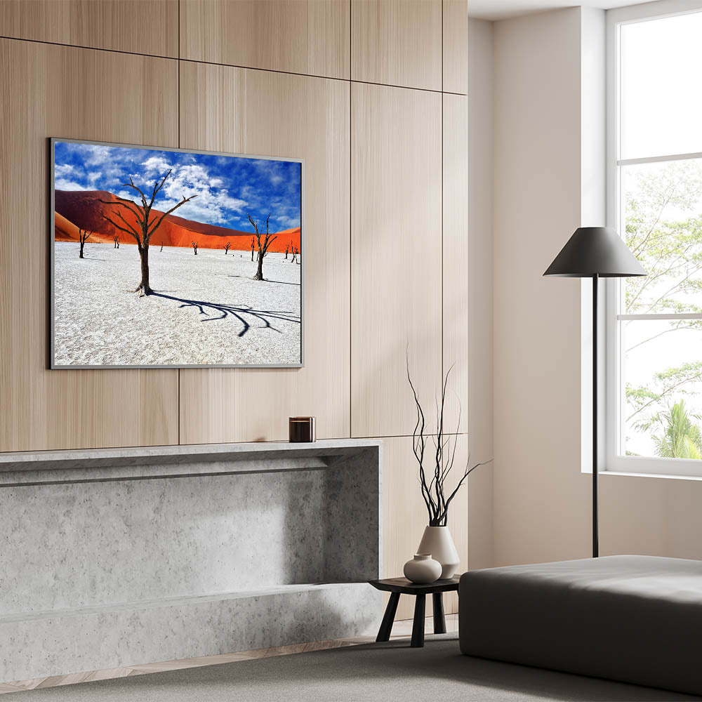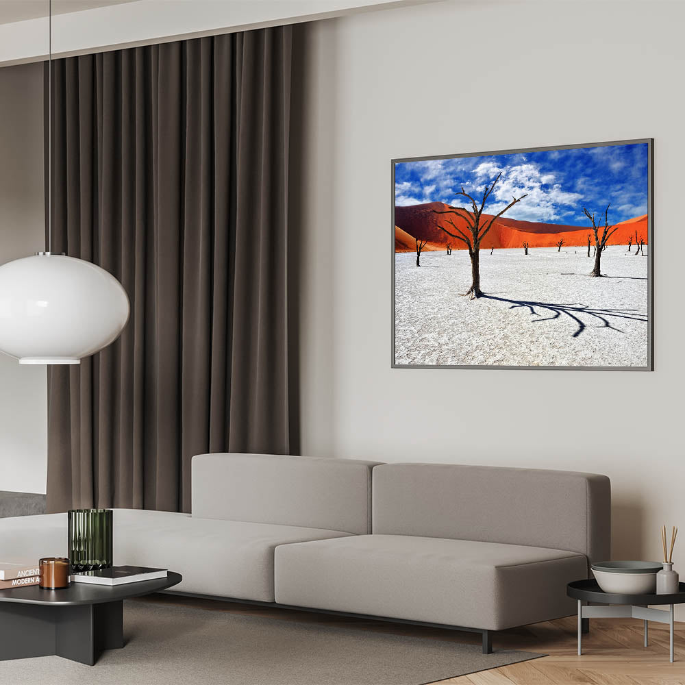 Bring the raw beauty of Namibia into your space with this striking wall art, showcasing the hauntingly beautiful landscape of dead trees set against the vivid orange dunes and a crisp blue sky. This Namibian landscape photography captures the stark contrasts and surreal beauty of one of Africa's most iconic deserts, making it a perfect piece for those who appreciate the rugged and untamed aspects of nature.