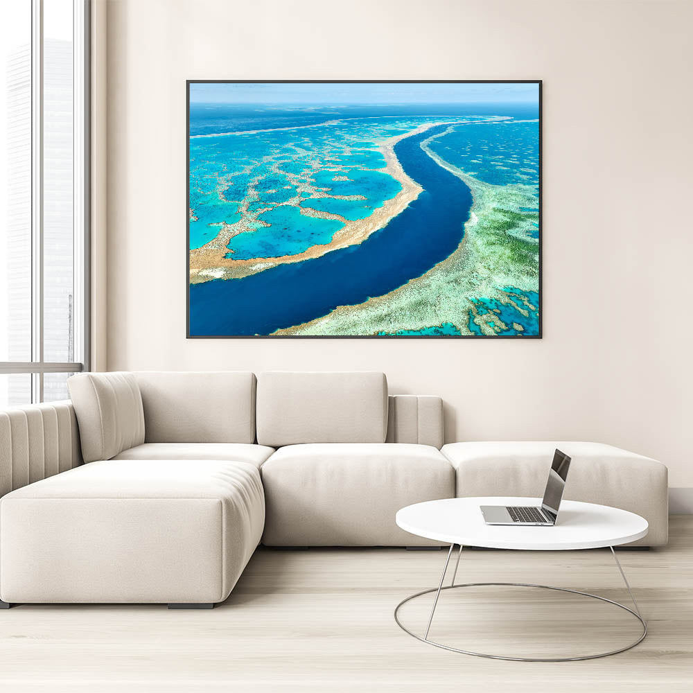 Enhance your décor with this stunning aerial view of the Great Barrier Reef. Available in multiple formats including canvas, acrylic glass, and framed prints, this artwork is perfect for adding a serene and vibrant coastal touch to any room. Order today and bring the beauty of Australia’s natural wonder into your home!