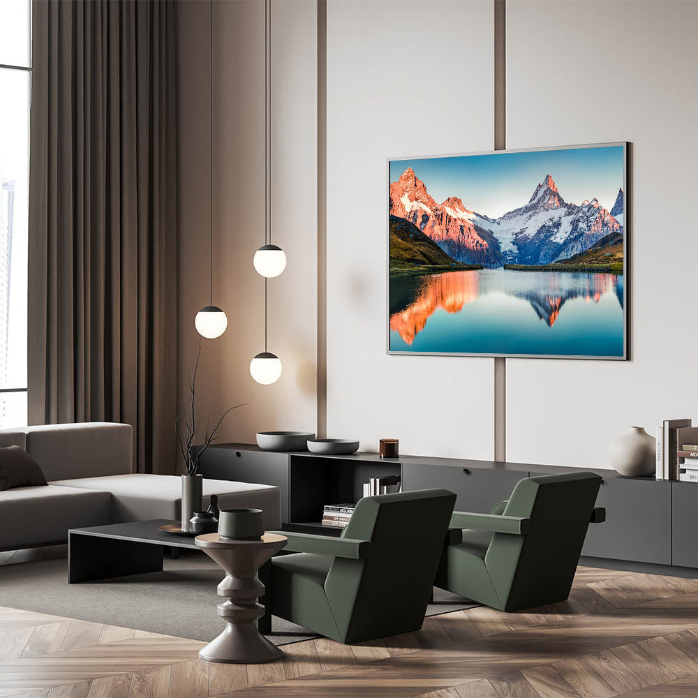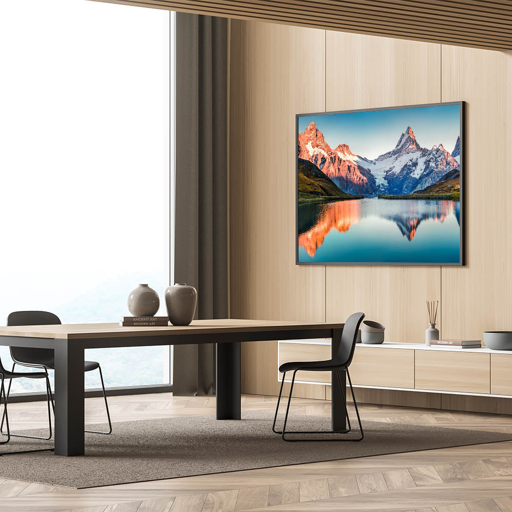 Transform your home decor with this beautiful mountain artwork. The sunlit peaks and their reflection in the calm waters bring a peaceful and radiant atmosphere to any space. Order today to bring this stunning landscape into your home.