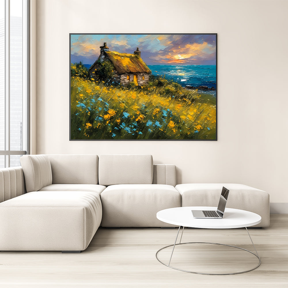 Sunset Coastal Cottage Wall Art - Vibrant Framed Canvas Print