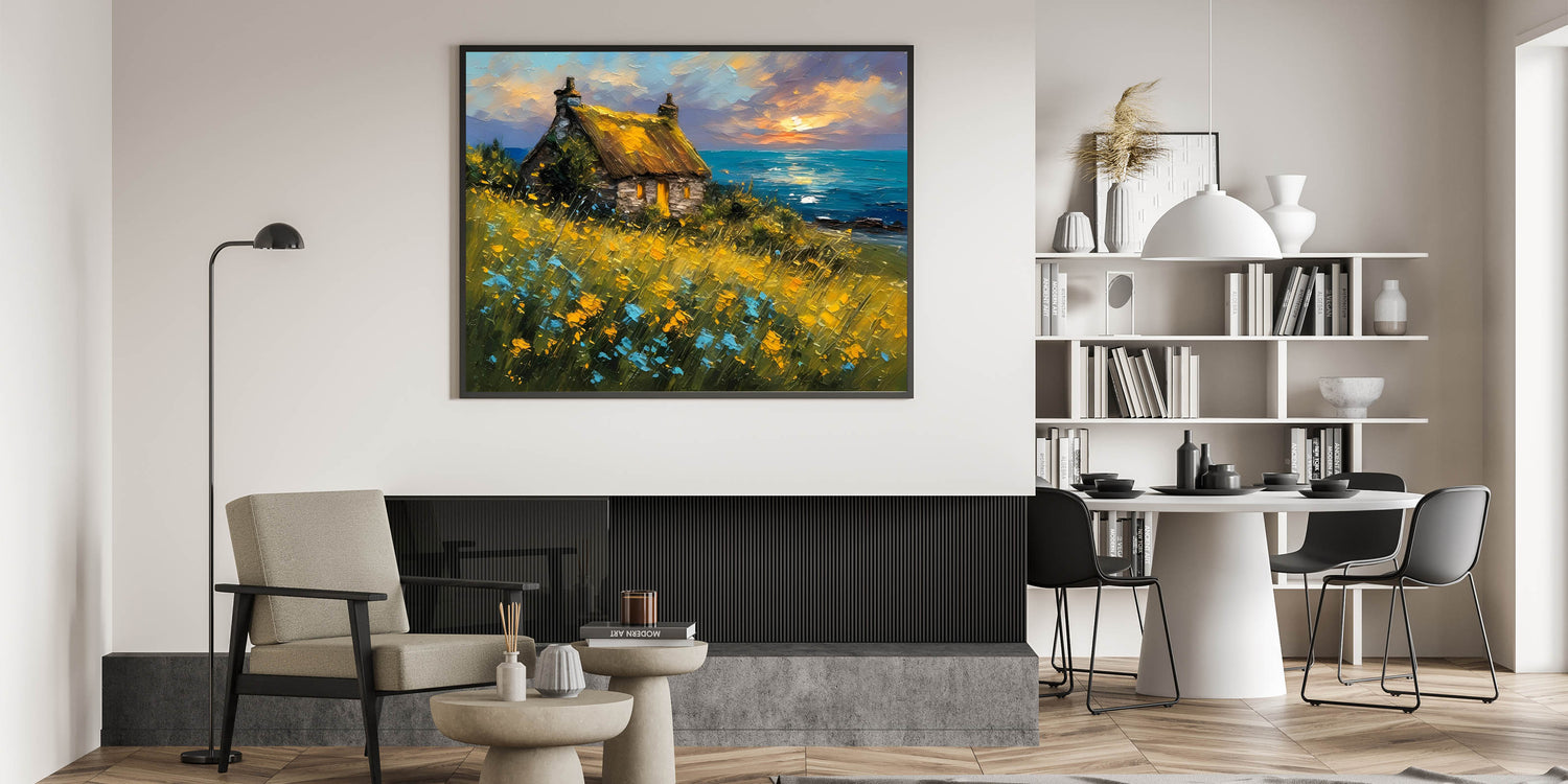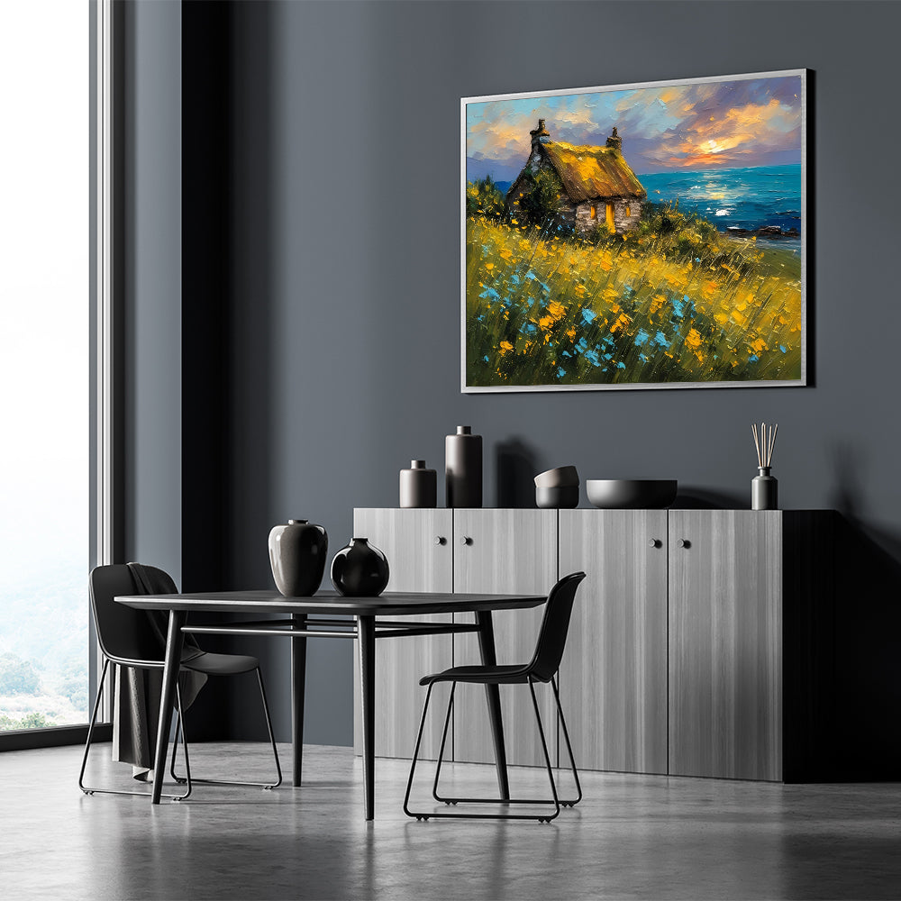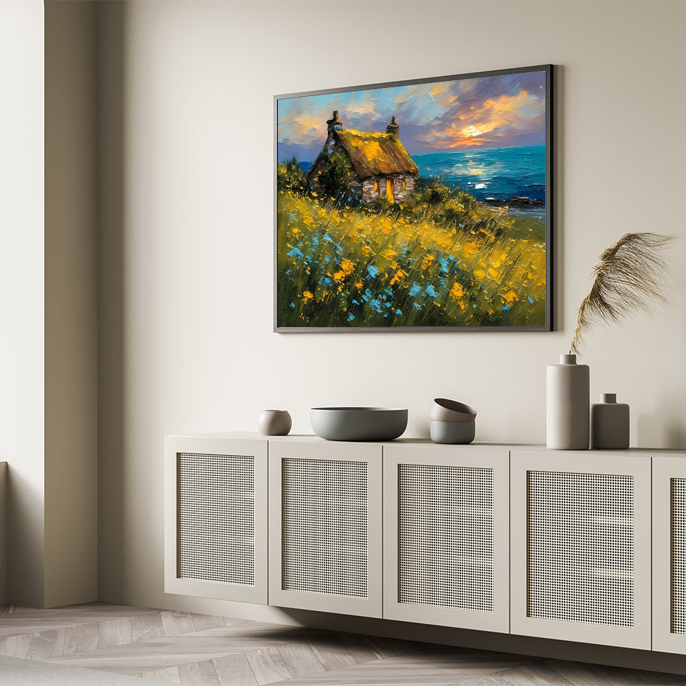 Capture the breathtaking beauty of a coastal sunset with this stunning Sunset Coastal Cottage Wall Art. This artwork features a quaint stone cottage overlooking the ocean, bathed in the warm, golden hues of a setting sun. The vibrant colors of the flowers and the glowing sky create a captivating scene that brings warmth and tranquility to any space.