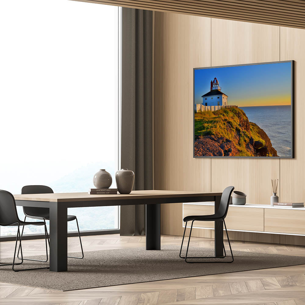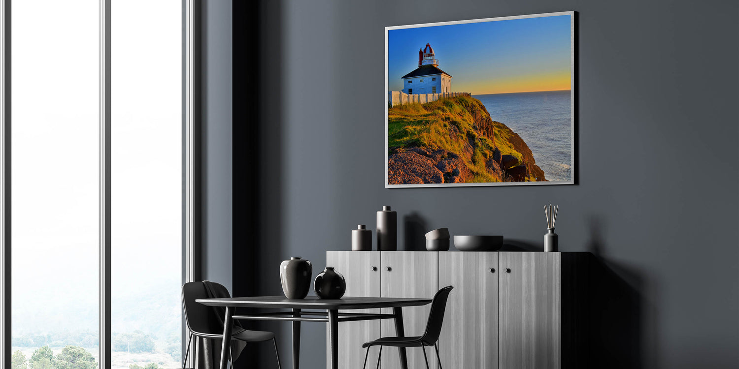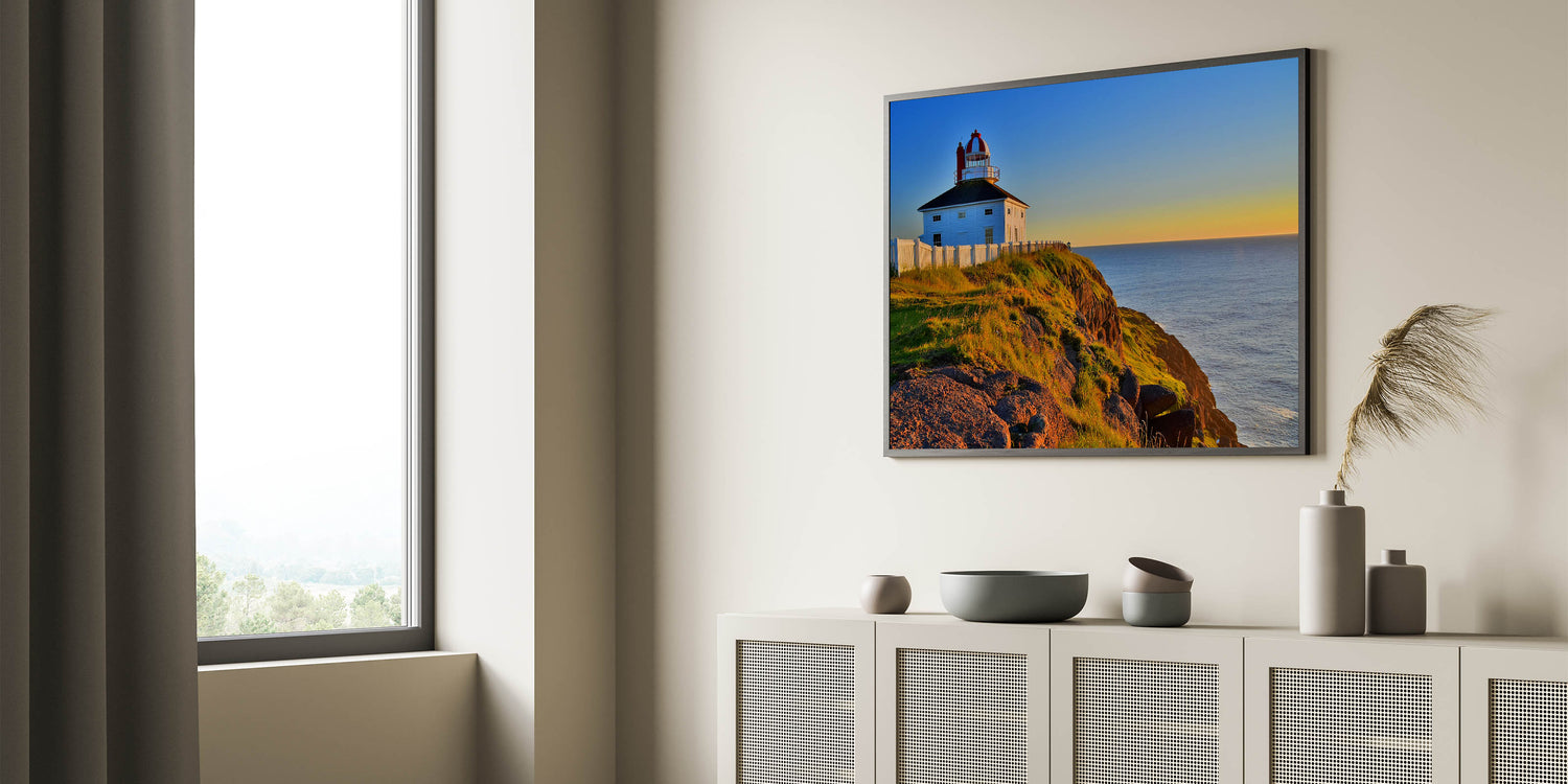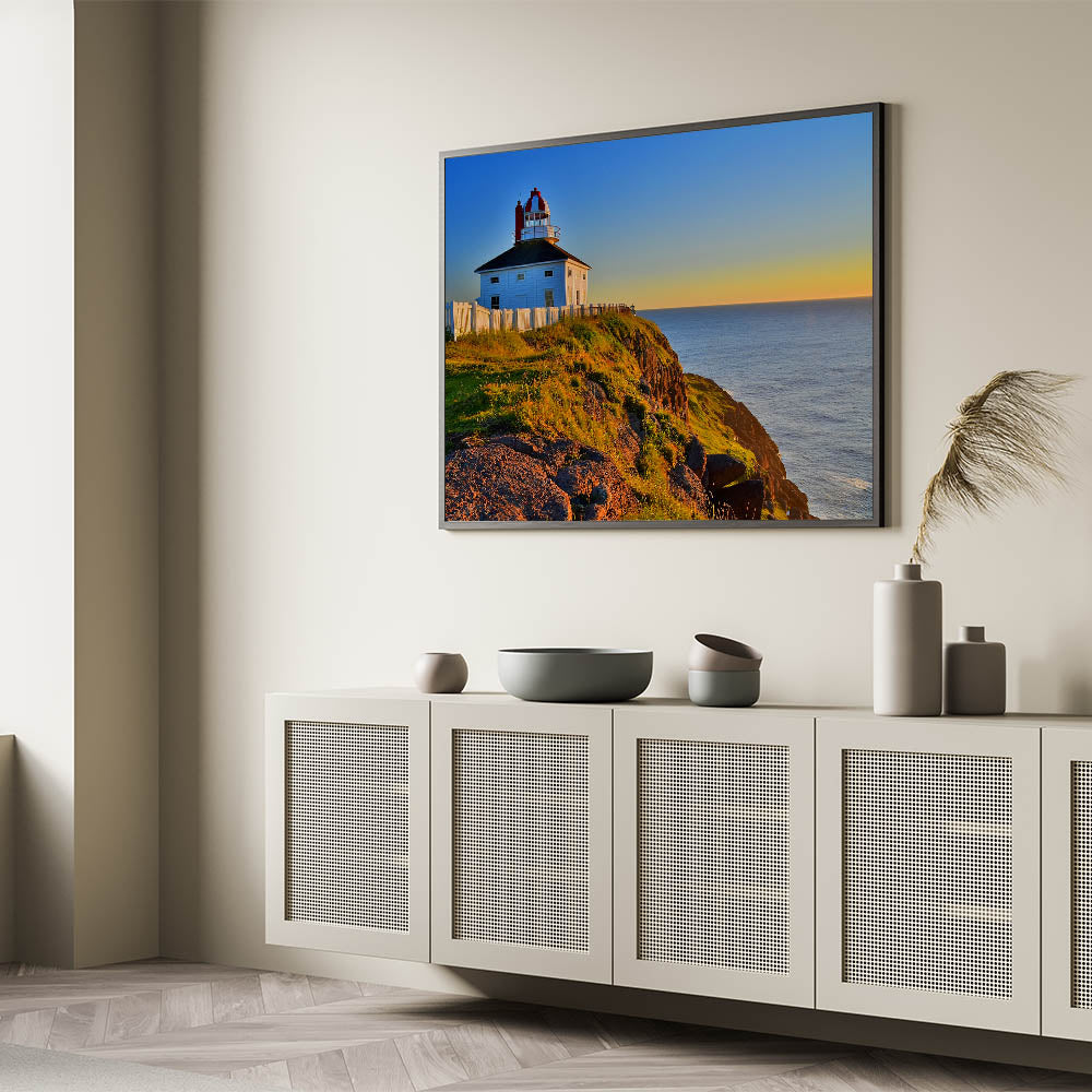 Capture the timeless beauty of Newfoundland’s coast with this stunning sunset lighthouse wall art. The image features a picturesque lighthouse perched atop a grassy cliff, with the warm hues of sunset casting a golden glow across the scene. The deep blue of the Atlantic Ocean provides a striking contrast, making this artwork perfect for those who appreciate coastal landscapes and tranquil seascapes.