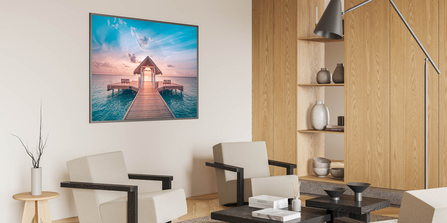 - Material Options: Available in acrylic glass, rolled print, and framed canvas.