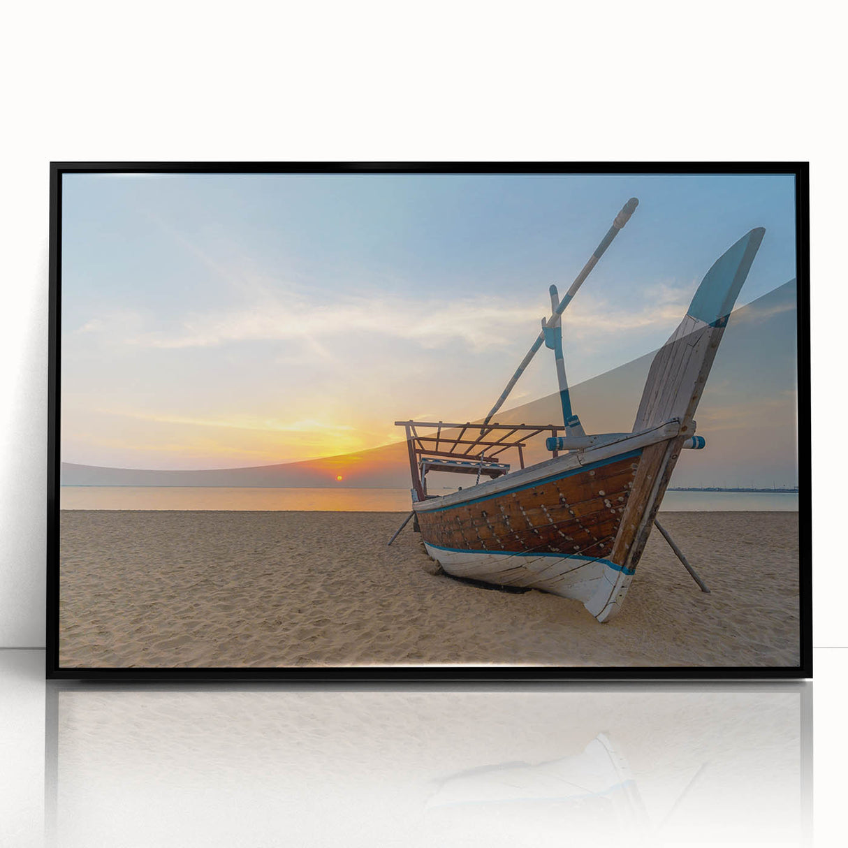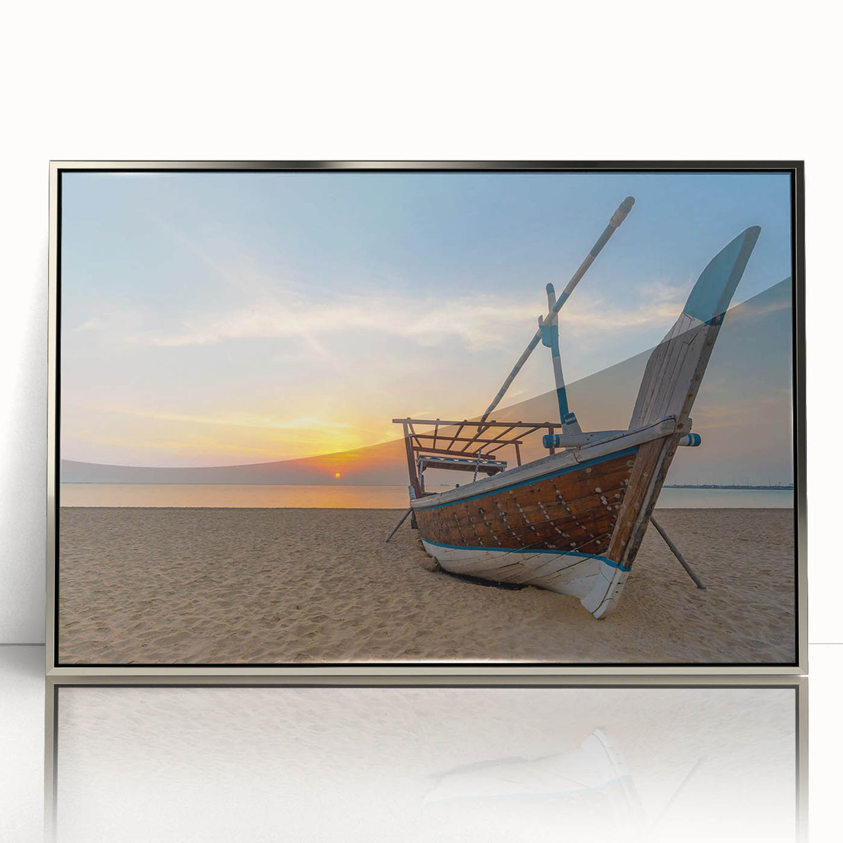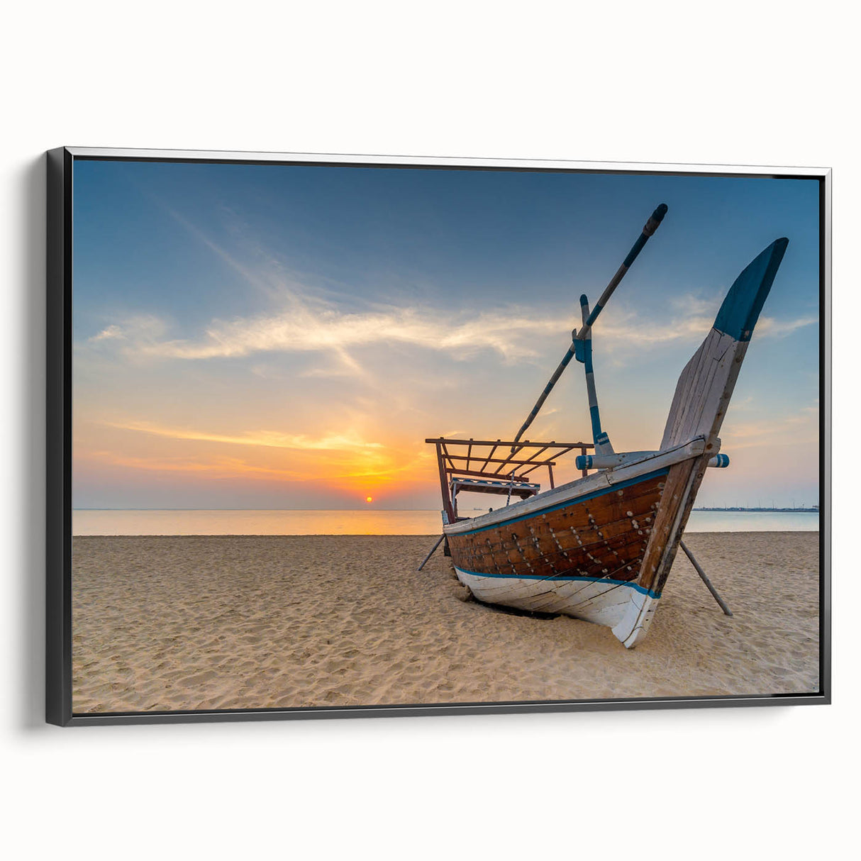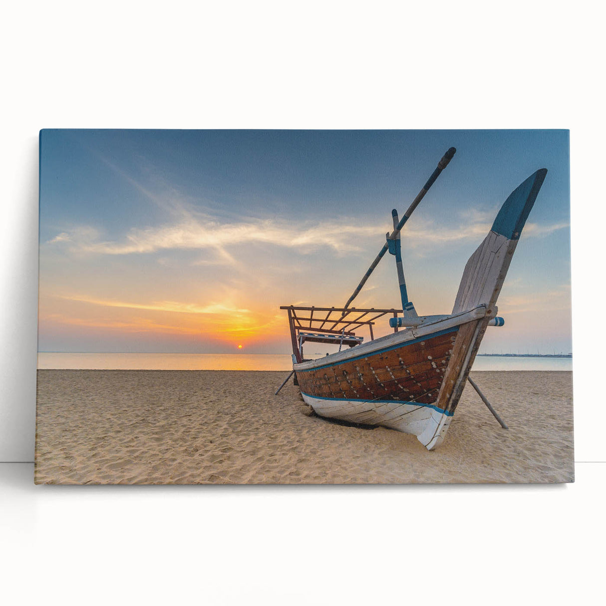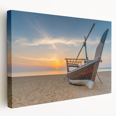 Embrace the calm and beauty of the Arabian Gulf with our "Sunset Serenity in Doha - Traditional Boat Canvas Print." This captivating artwork depicts a traditional Qatari boat, known as a dhow, resting peacefully on the shore as the sun sets in the background, painting the sky in warm hues.