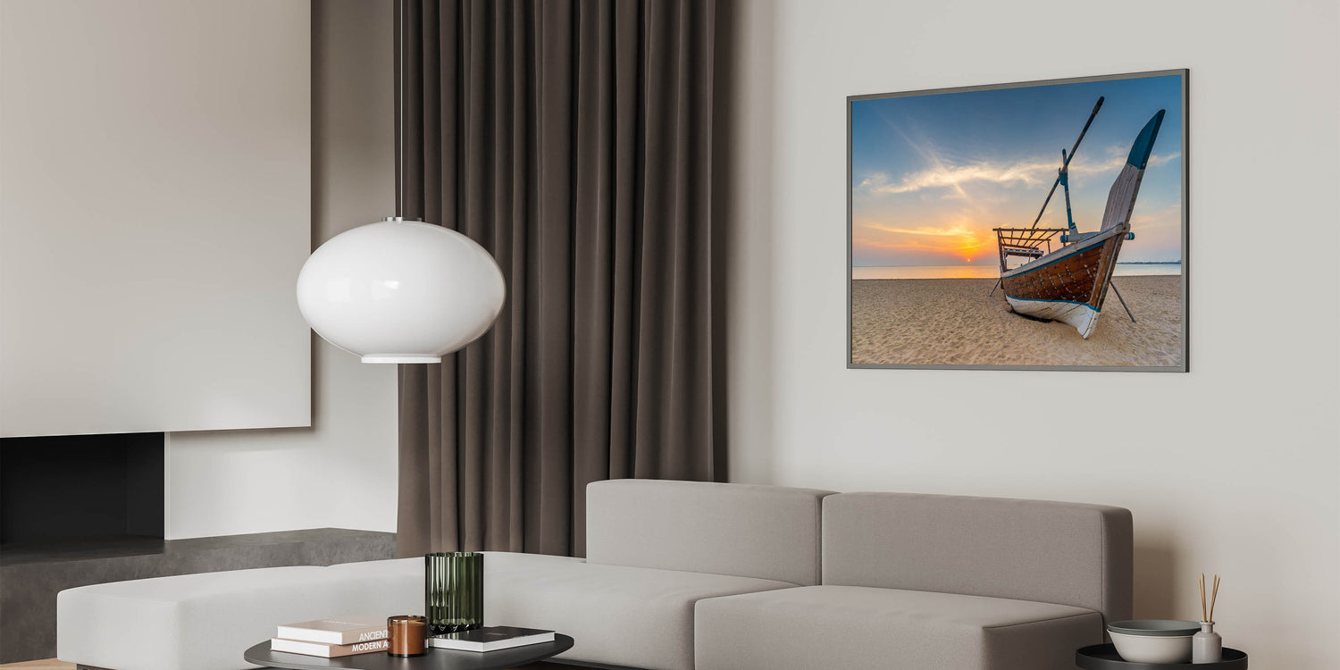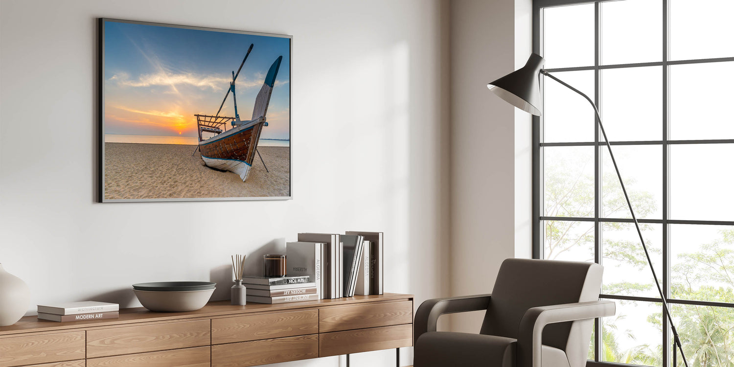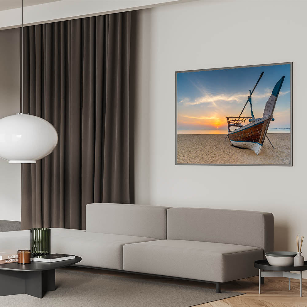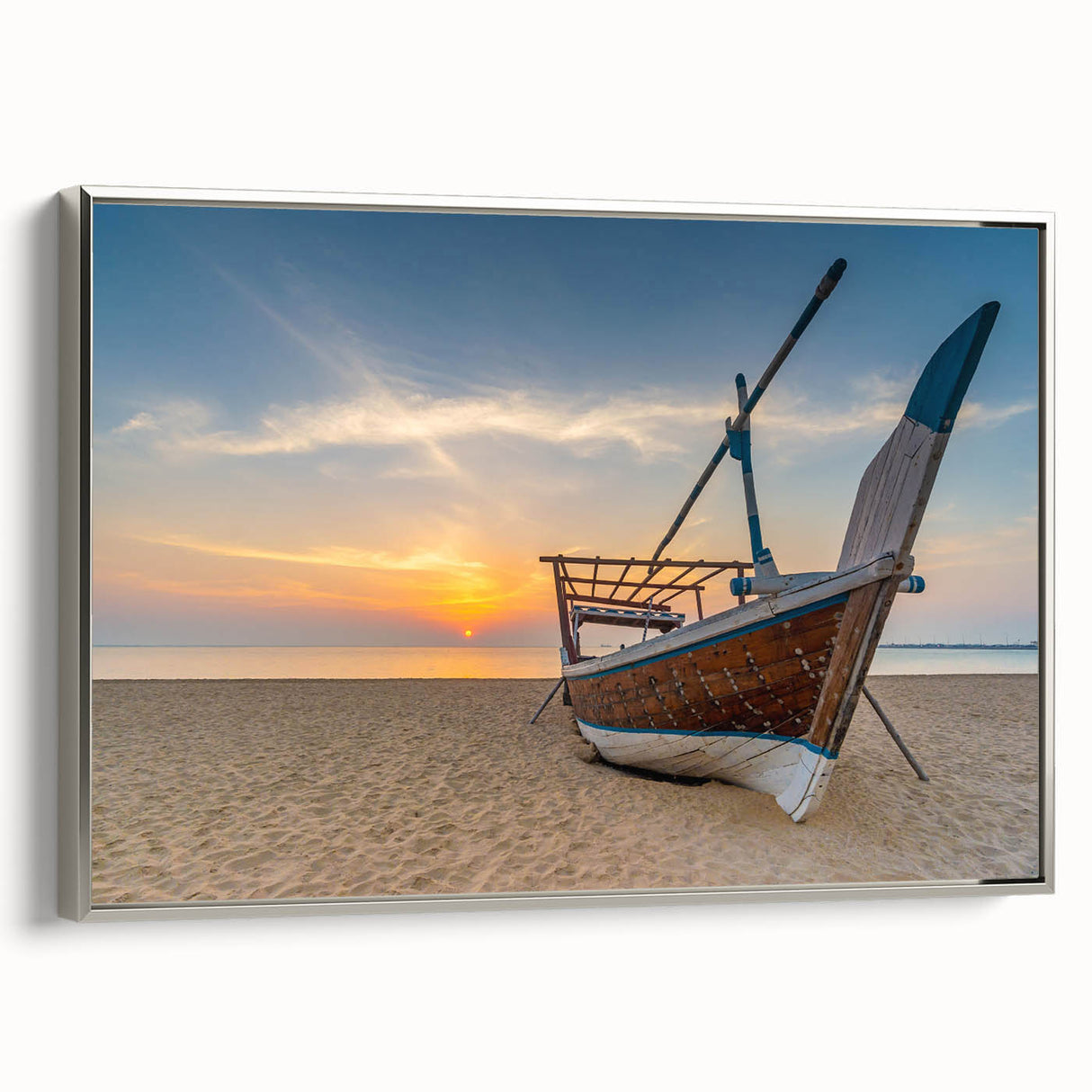 Embrace the calm and beauty of the Arabian Gulf with our "Sunset Serenity in Doha - Traditional Boat Canvas Print." This captivating artwork depicts a traditional Qatari boat, known as a dhow, resting peacefully on the shore as the sun sets in the background, painting the sky in warm hues.