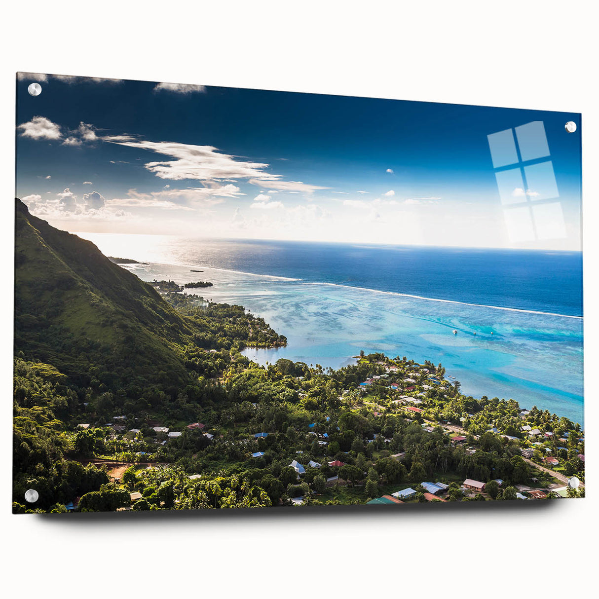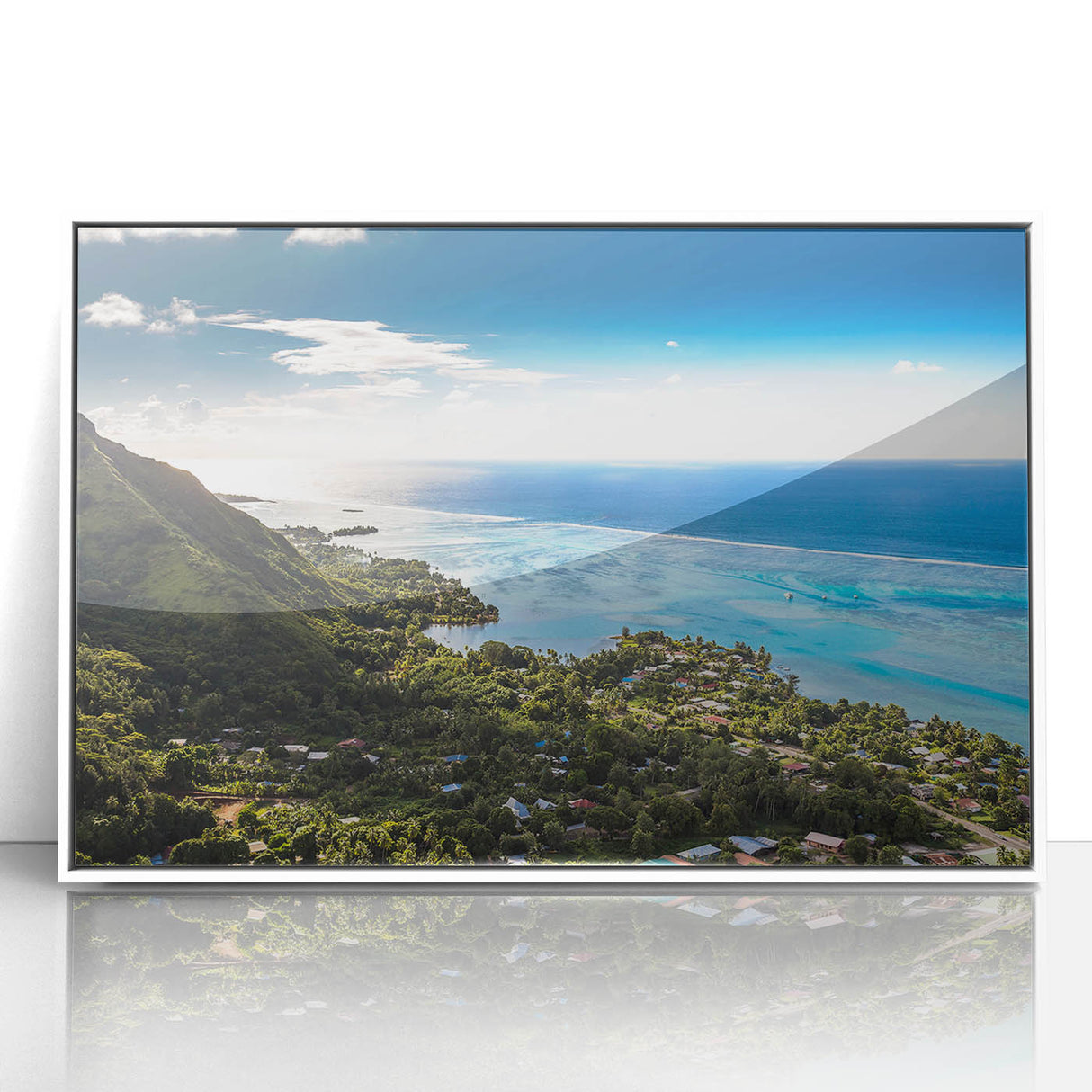 Discover the untouched beauty of Tahiti with our "Tahiti Coastal Village - Aerial Ocean View Canvas Print." This remarkable artwork captures an expansive aerial view of a lush coastal village nestled against the stunning backdrop of Tahiti’s vibrant blue seas and rich greenery.