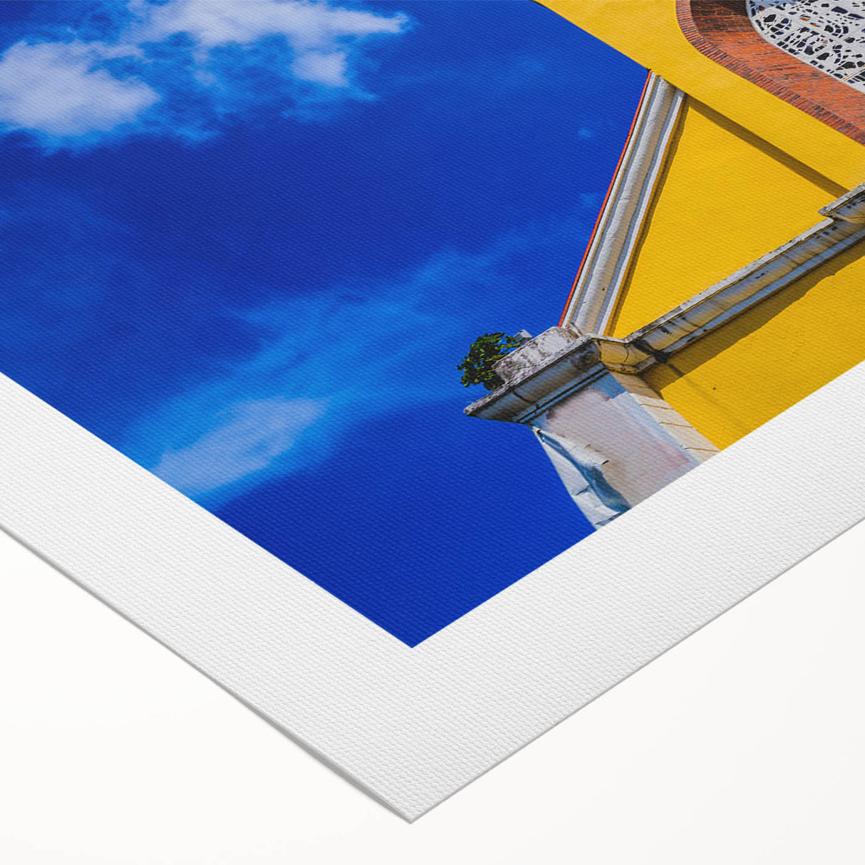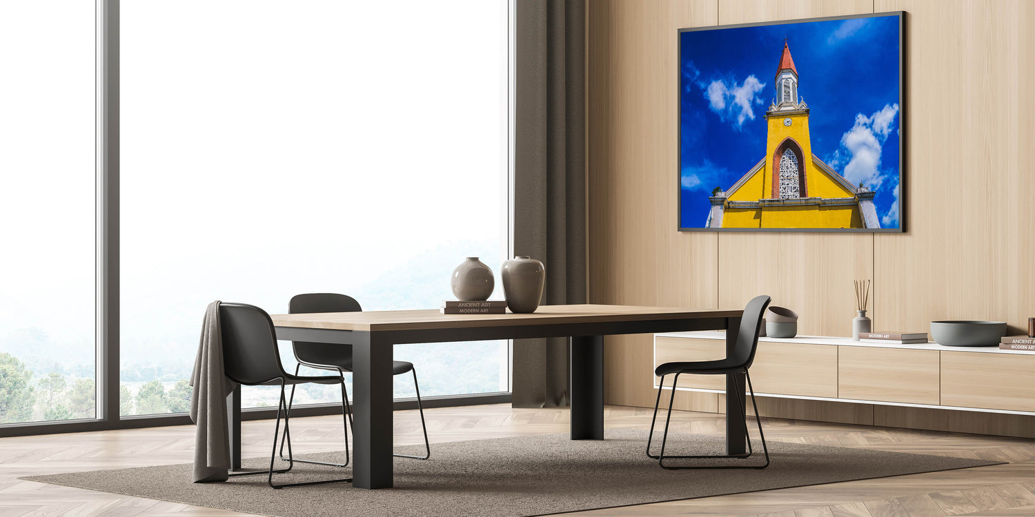 - Vibrant Display: Features a striking yellow church set against a deep blue sky.
