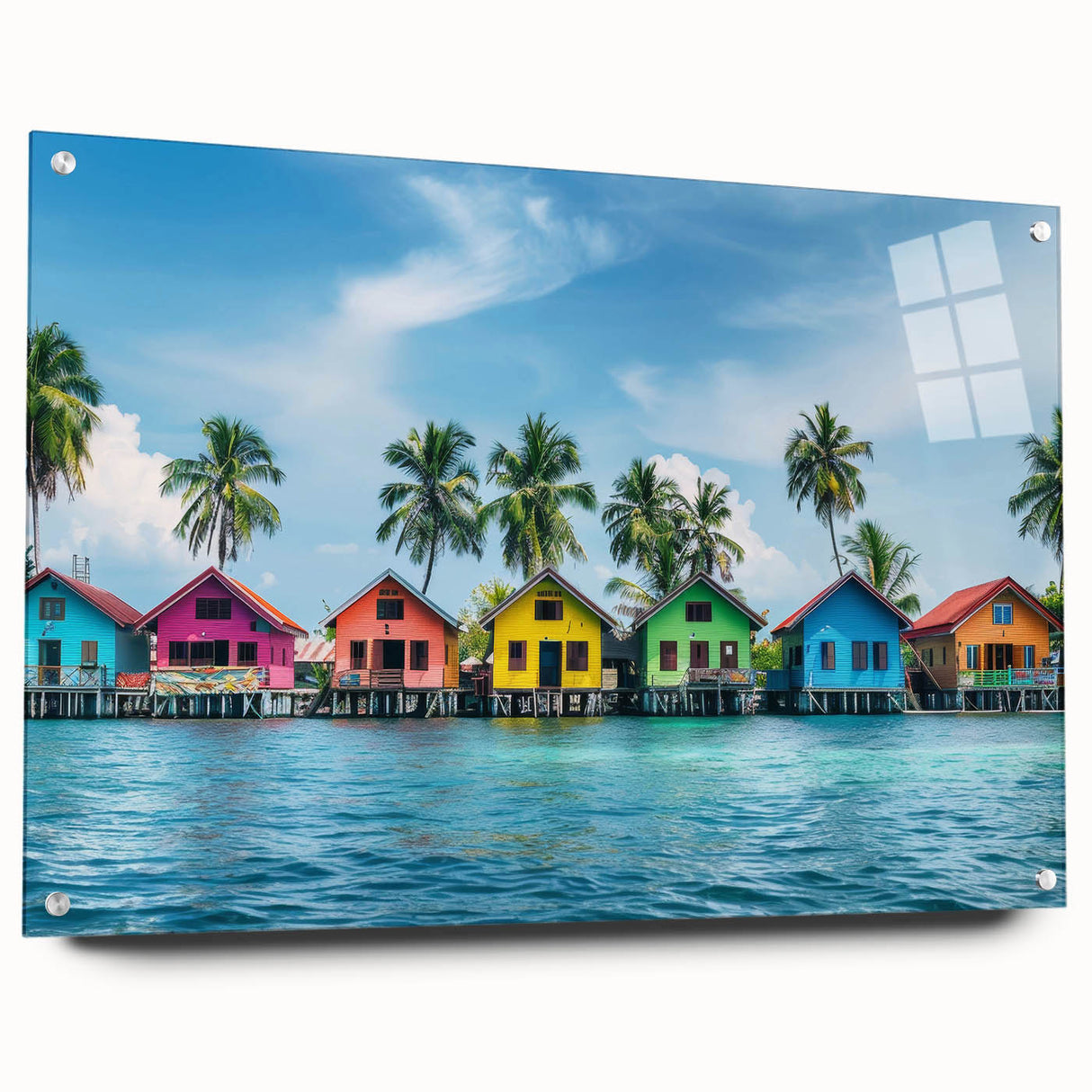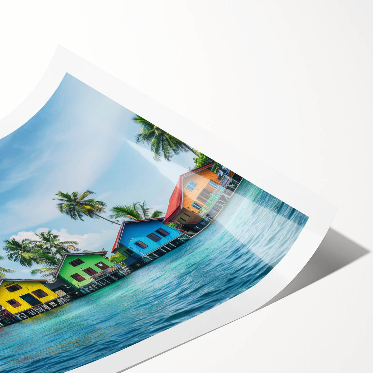 Introducing our "Tahiti Island Photography - Tropical Wall Decor" canvas, featuring a row of vibrant, multicolored waterfront cottages. This unique piece captures the essence of French Polynesia's charming island lifestyle with its bright and cheerful architecture set against the backdrop of a serene tropical beach.