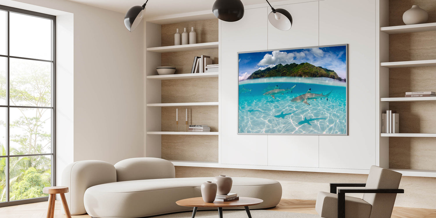Dive into the deep blue with our "Tahiti Shark Waters - Underwater Adventure Canvas Print." This stunning piece captures the thrilling sight of sharks gracefully gliding through the crystal-clear waters of Tahiti, set against the lush, green mountainous landscape above.