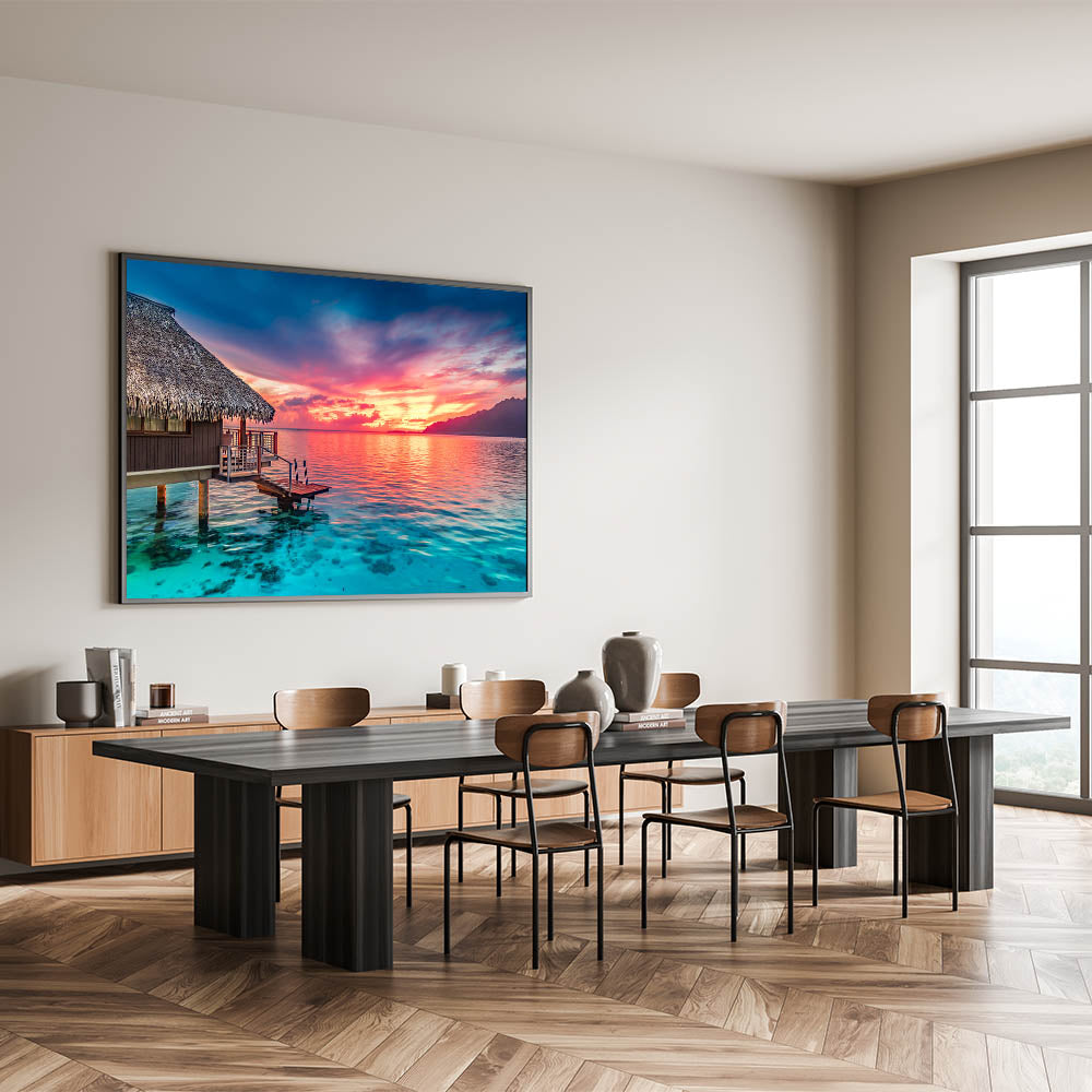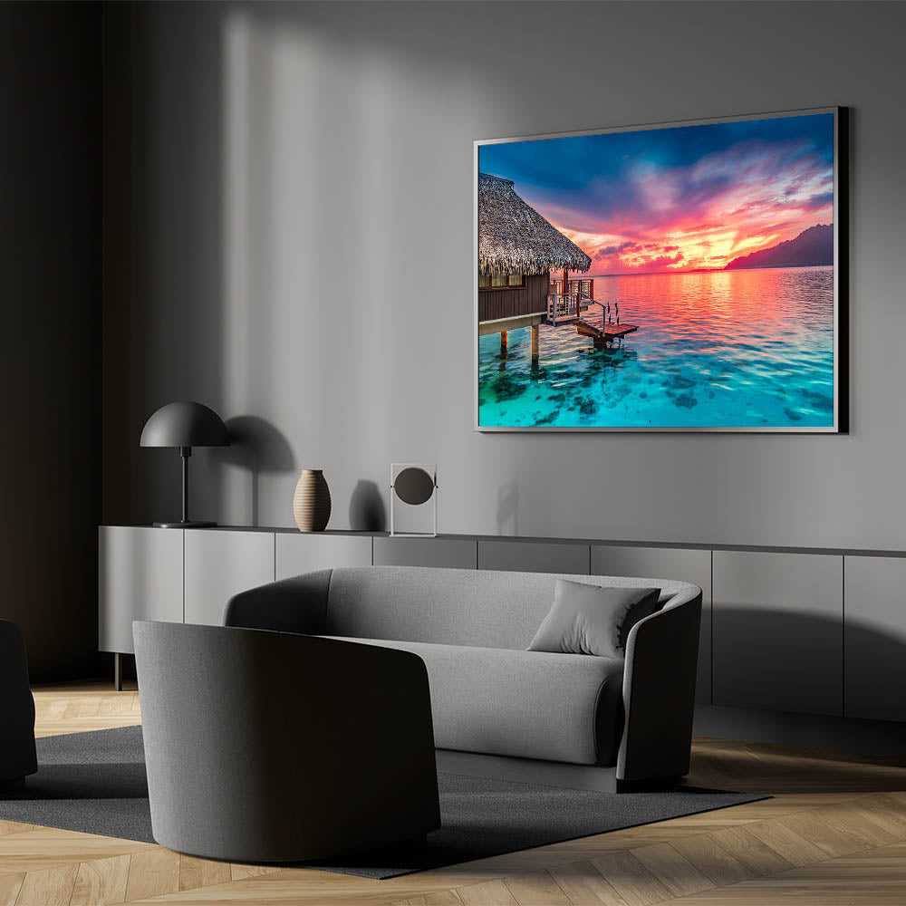 Embrace the serene beauty of a Tahitian sunset with our "Tahiti Sunset Bliss - Overwater Bungalow Canvas Art." This captivating print showcases an overwater bungalow bathed in the vibrant hues of a sunset, reflecting off the tranquil waters, with dramatic mountain silhouettes in the background.