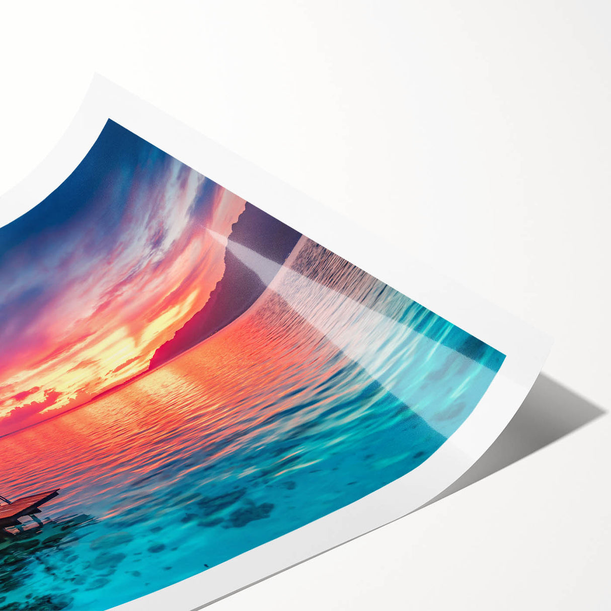 - Striking Colors: The artwork captures the intense reds, pinks, and blues of a tropical sunset, offering a vivid visual experience.