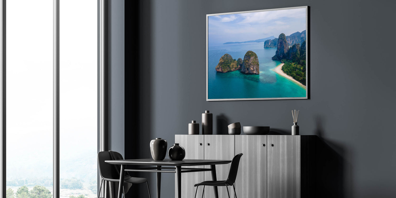 Elevate your decor with "Thailand’s Coastal Islands Aerial Canvas Art." This captivating artwork showcases a serene aerial perspective of Thailand’s lush coastal islands, highlighting their turquoise waters and rugged cliffs. It's an invitation to explore the untouched beauty of these remote paradises from the comfort of your home.