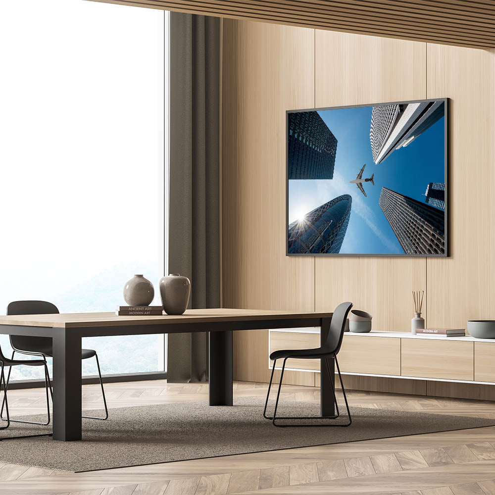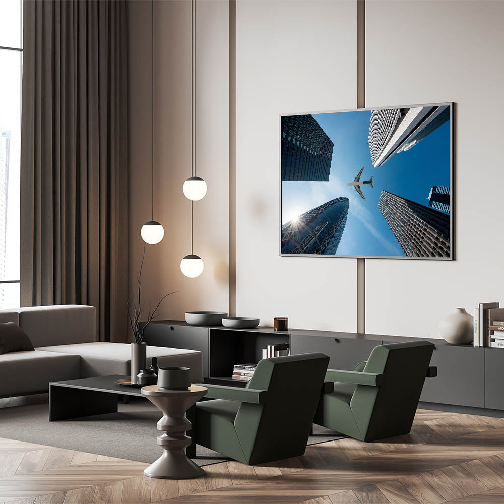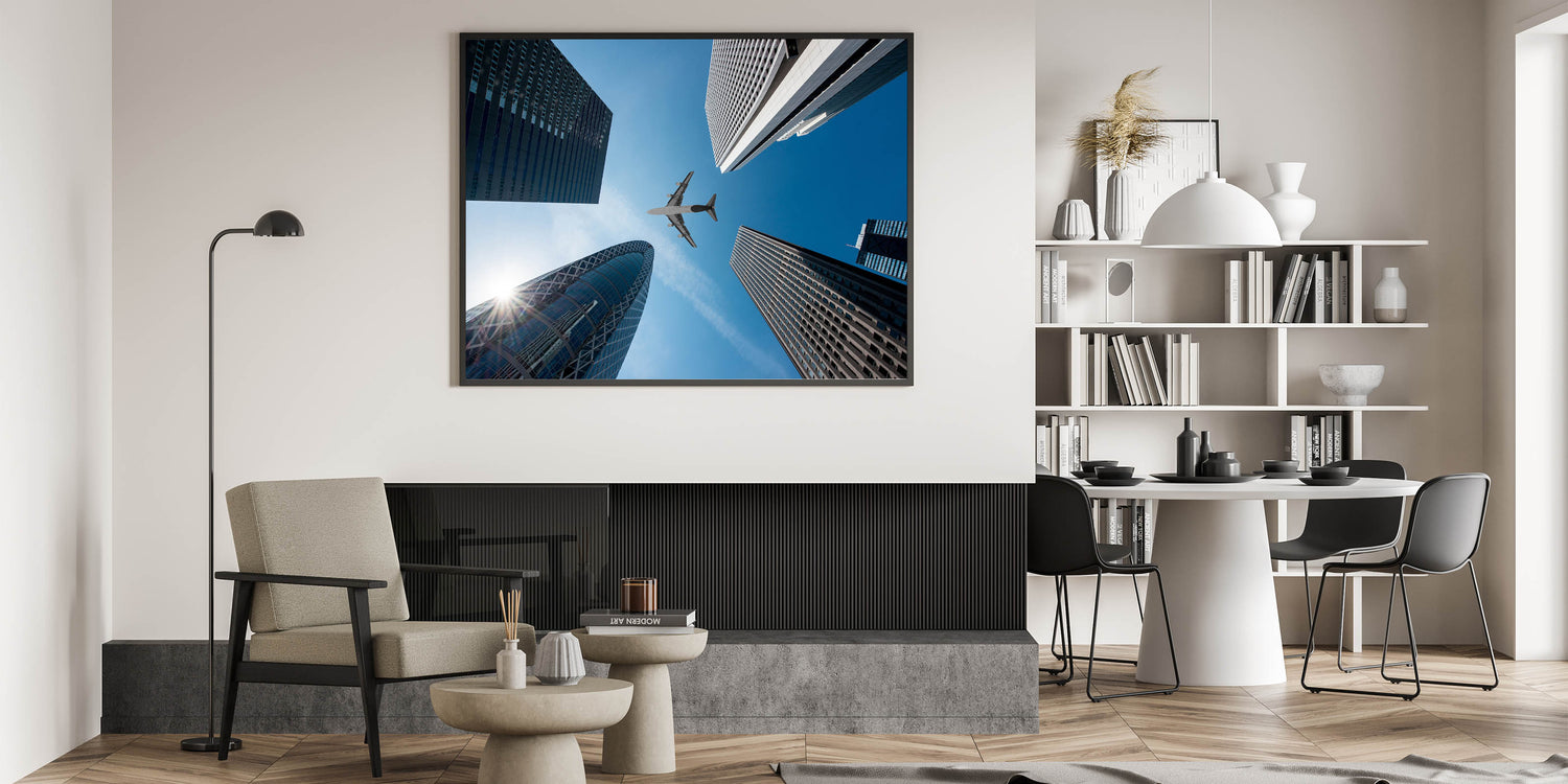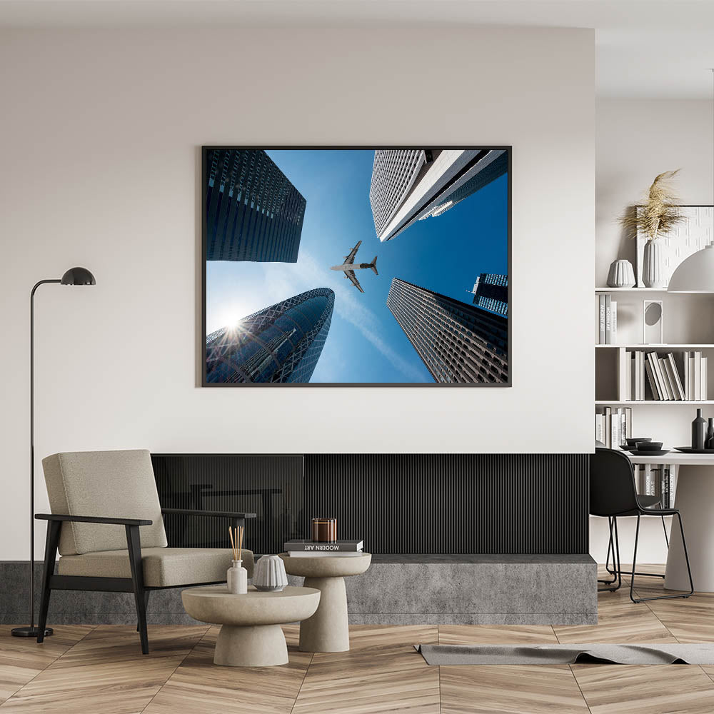 Capture the dynamic energy of Tokyo with this striking cityscape print featuring towering skyscrapers and a sleek airplane soaring through the sky. This piece of urban skyline art showcases the architectural beauty of modern Tokyo, perfectly blending the bustling urban environment with a touch of adventure. Ideal for fans of Japan wall decor and contemporary art, this Tokyo cityscape print will bring a touch of sophistication and movement to any room.
