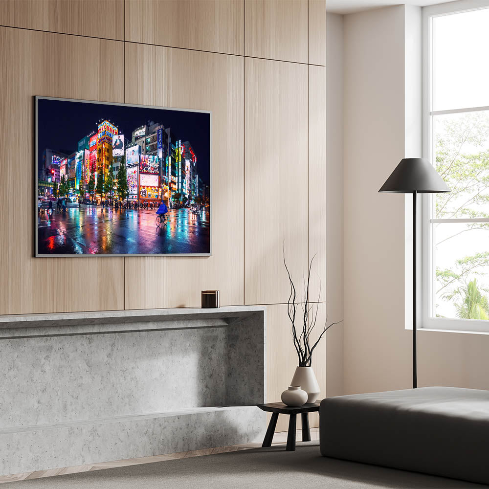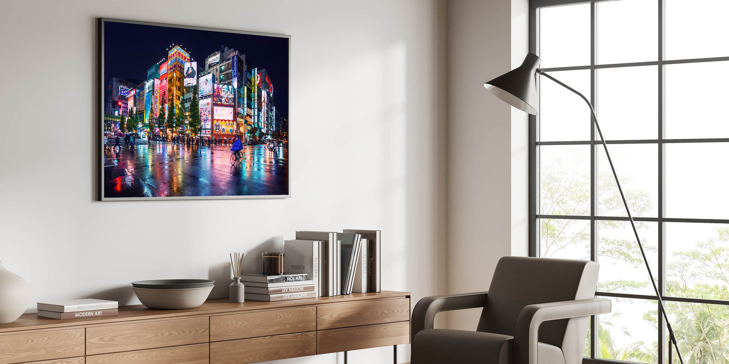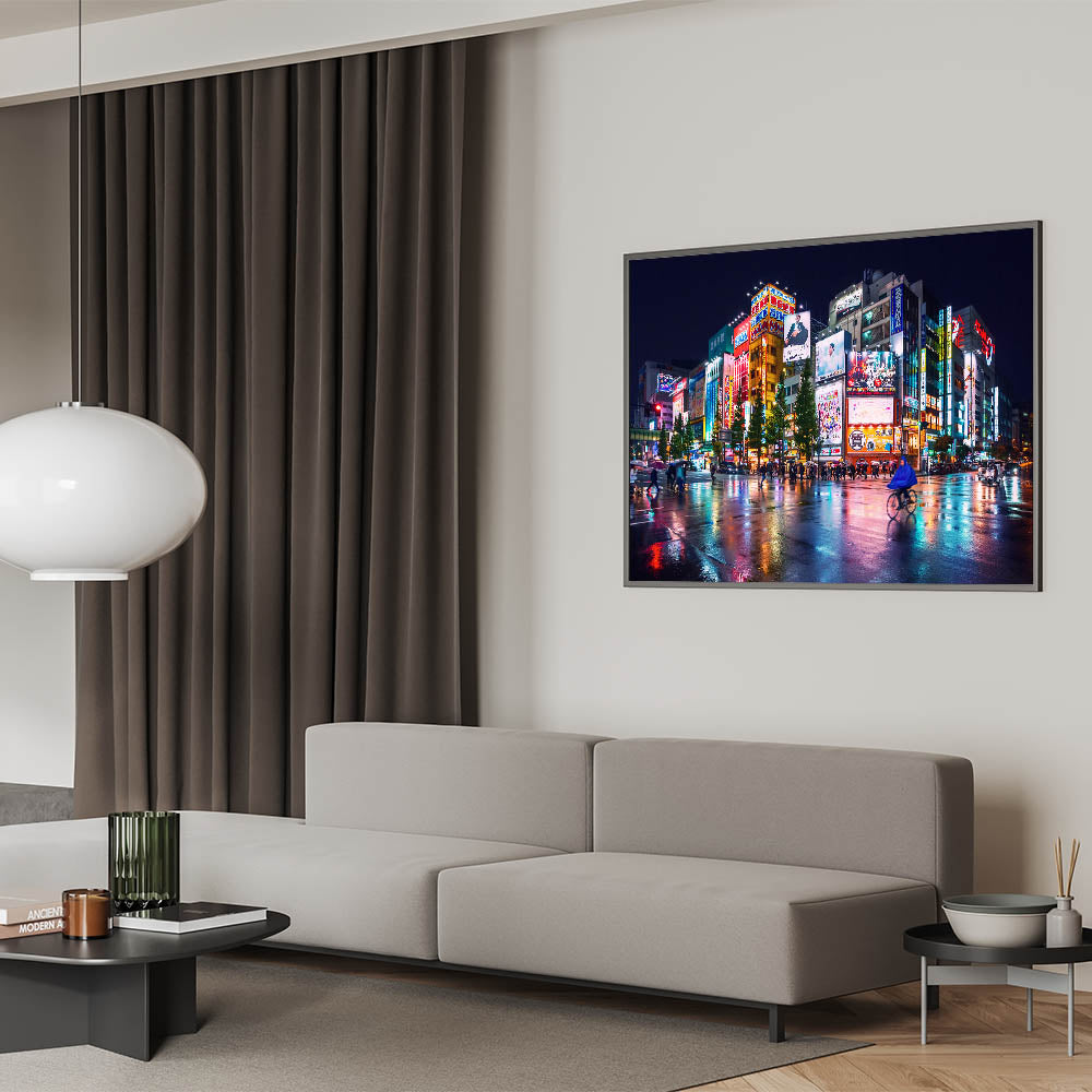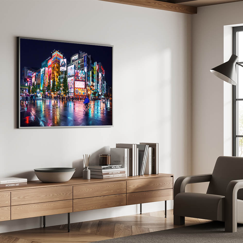 Experience the vibrant nightlife of Tokyo with this stunning cityscape print. Capturing the bustling streets, illuminated with neon lights reflecting off the wet pavement, this artwork brings the energy of the city right into your home. The glowing billboards, busy streets, and neon signs create a dynamic visual experience that perfectly encapsulates Tokyo's urban charm. This Tokyo nightlife art is ideal for anyone looking for bold and colorful decor that celebrates Japan's iconic city life.