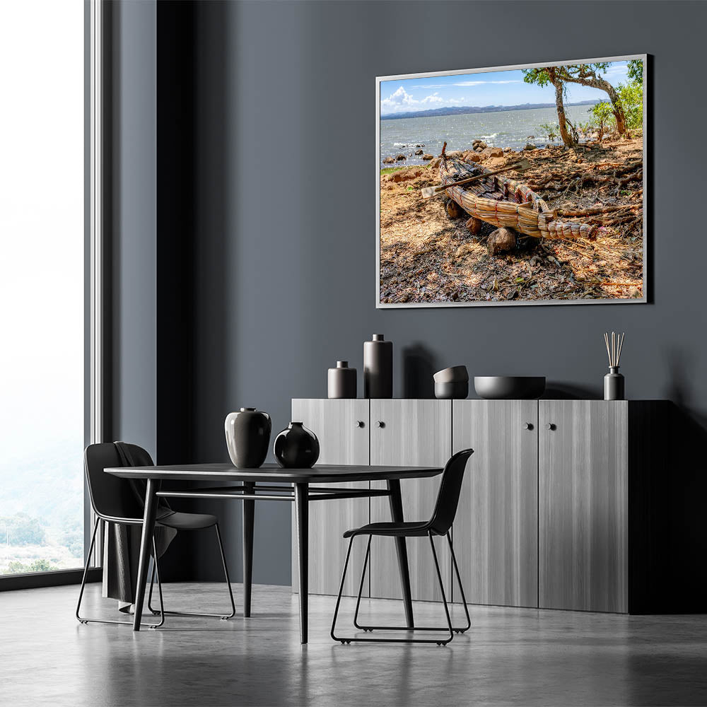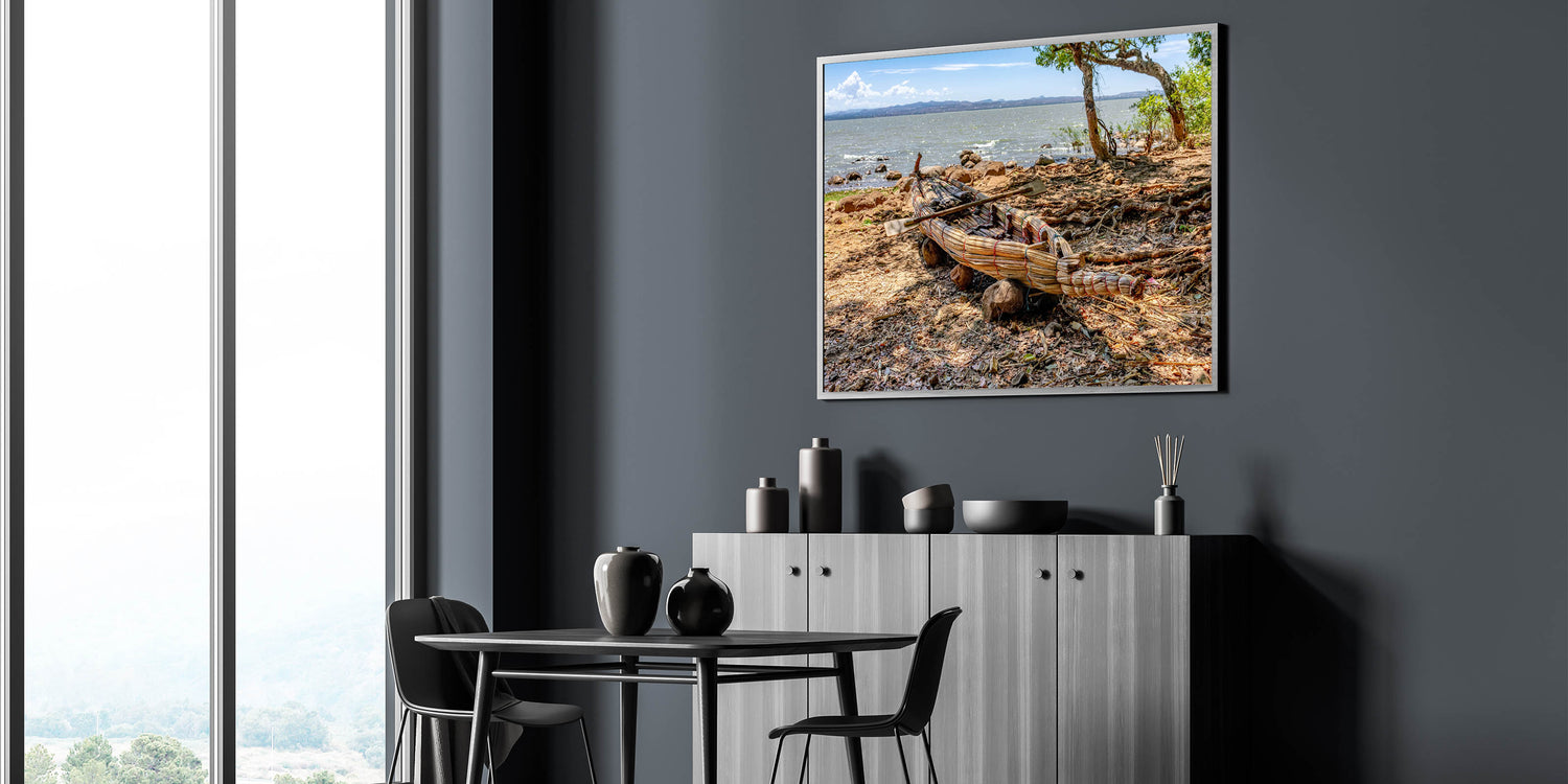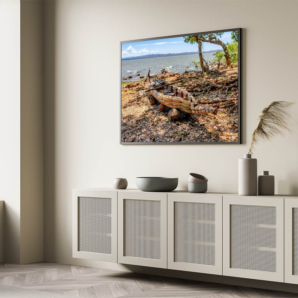 Embrace the serene beauty of Ethiopia’s lake regions with this captivating wall art featuring a traditional Ethiopian reed boat resting on the shore. This artwork offers a glimpse into the peaceful and rustic life along Ethiopia's lakesides, where handmade reed boats have been a staple for centuries. The calm waters and natural surroundings create a tranquil scene that brings the essence of Ethiopian heritage and African culture into your living space.