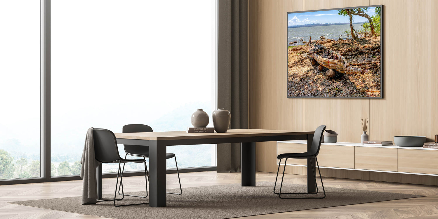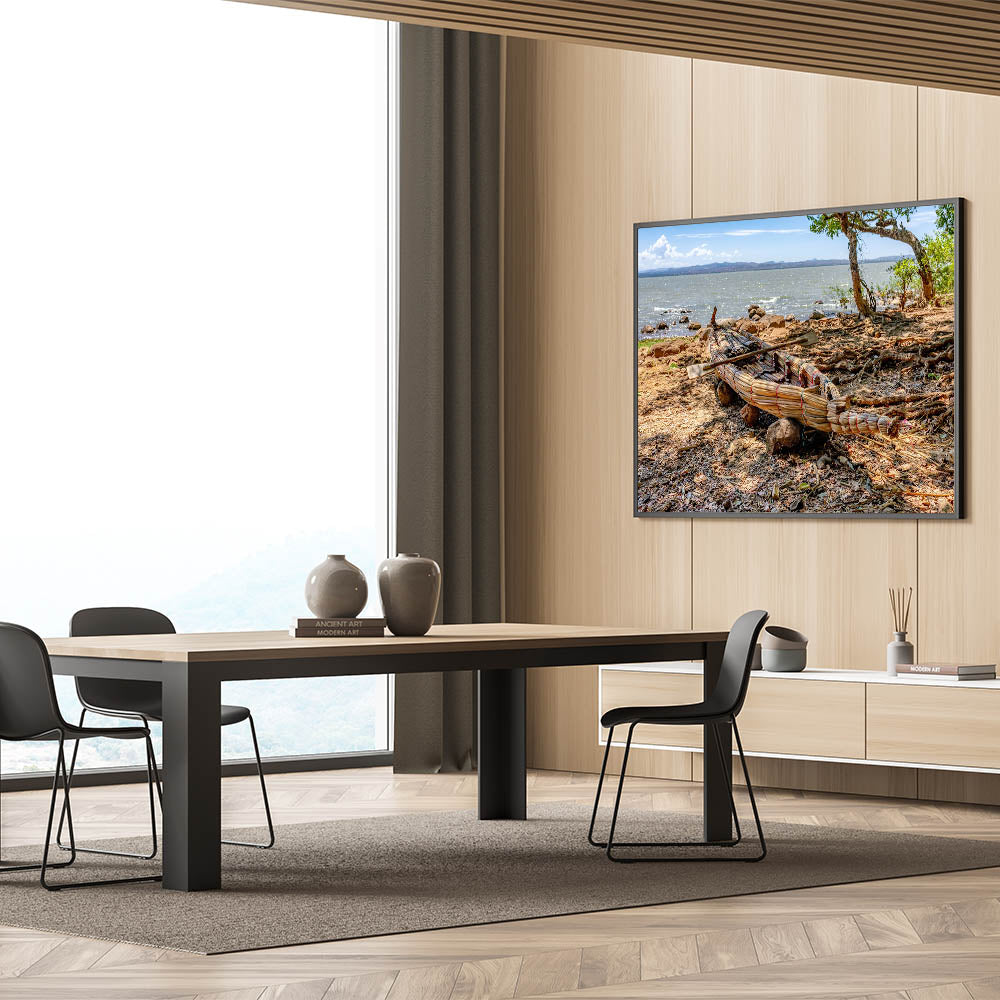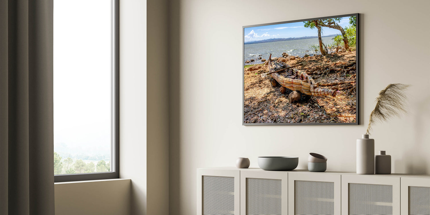 Embrace the serene beauty of Ethiopia’s lake regions with this captivating wall art featuring a traditional Ethiopian reed boat resting on the shore. This artwork offers a glimpse into the peaceful and rustic life along Ethiopia's lakesides, where handmade reed boats have been a staple for centuries. The calm waters and natural surroundings create a tranquil scene that brings the essence of Ethiopian heritage and African culture into your living space.
