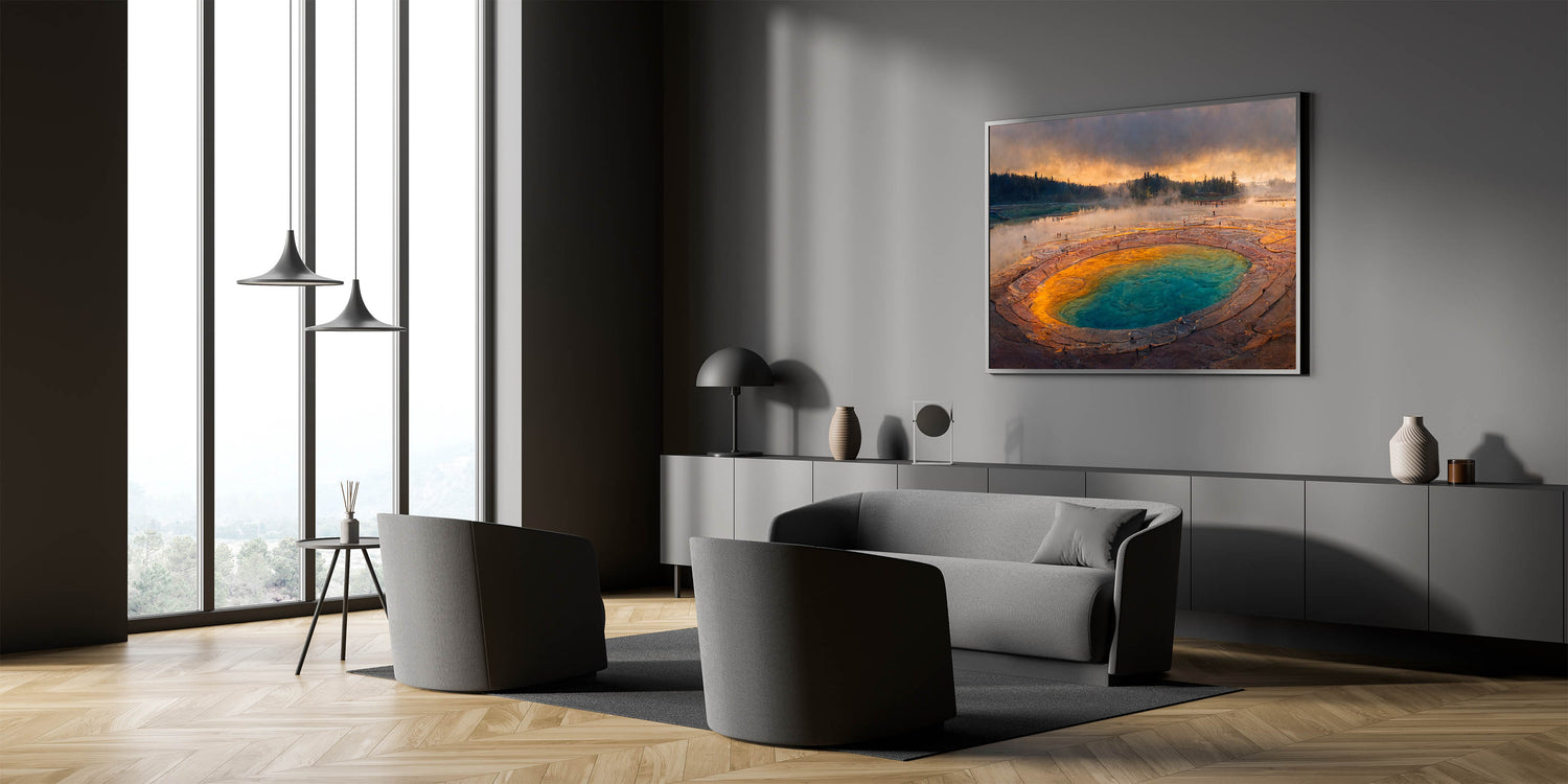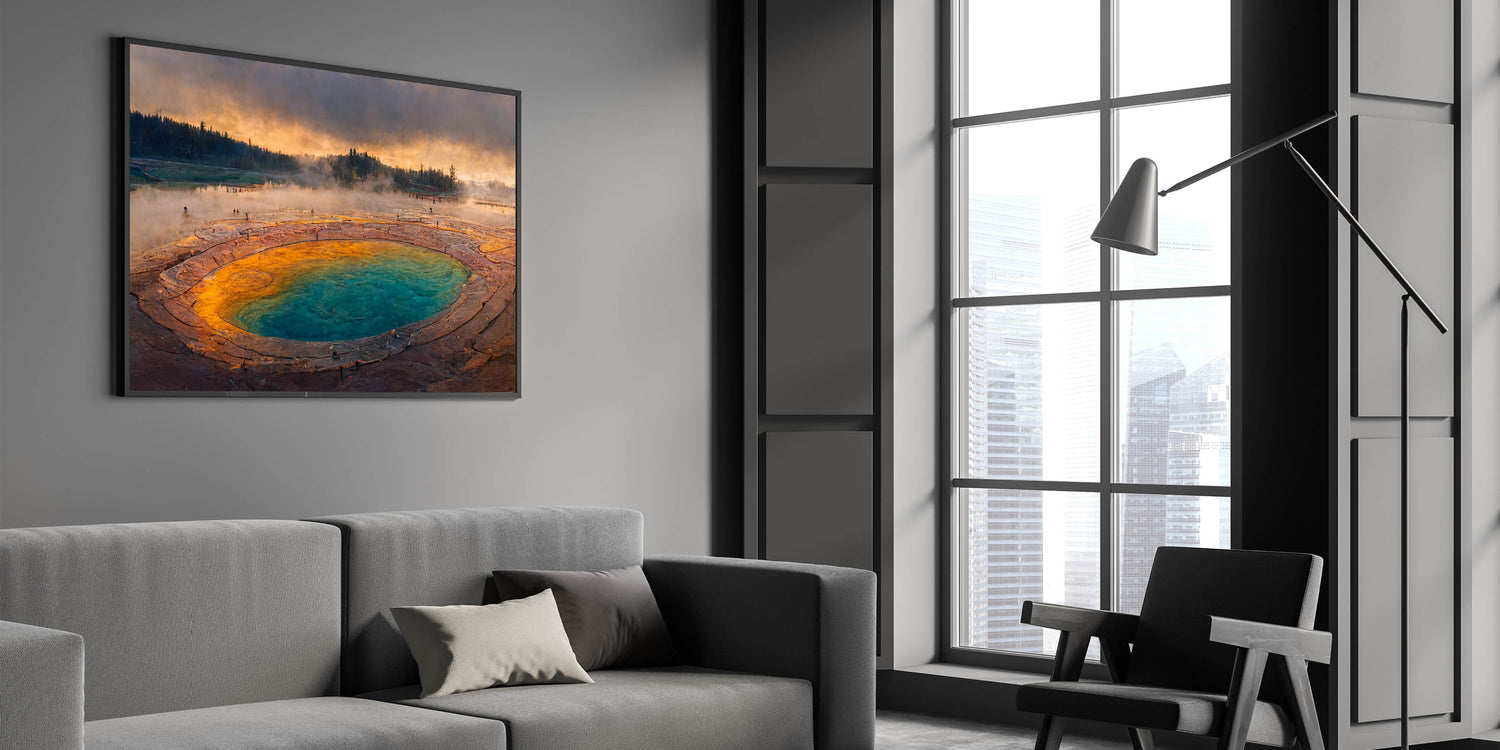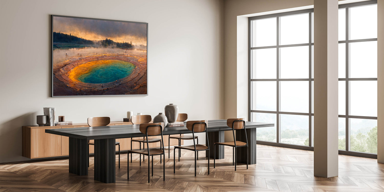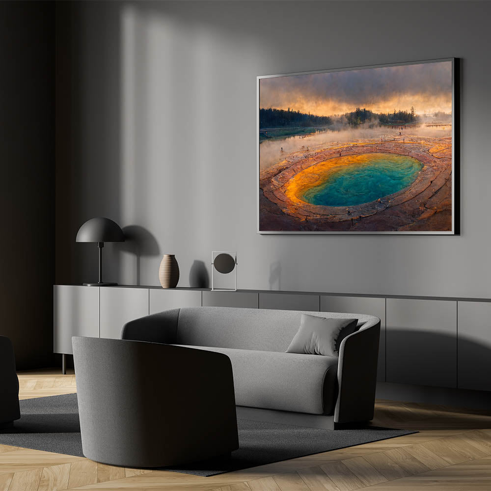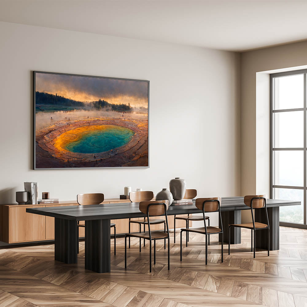 Bring a sense of calm and natural beauty into your space with this tranquil geyser wall art, featuring a misty morning over a vibrant thermal pool. The rich hues of turquoise, yellow, and earthy browns blend seamlessly with the misty atmosphere, creating a serene and captivating scene. This artwork is perfect for those who appreciate the quiet, reflective moments in nature and want to bring that peaceful energy into their home or office.