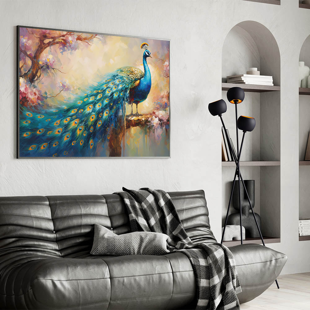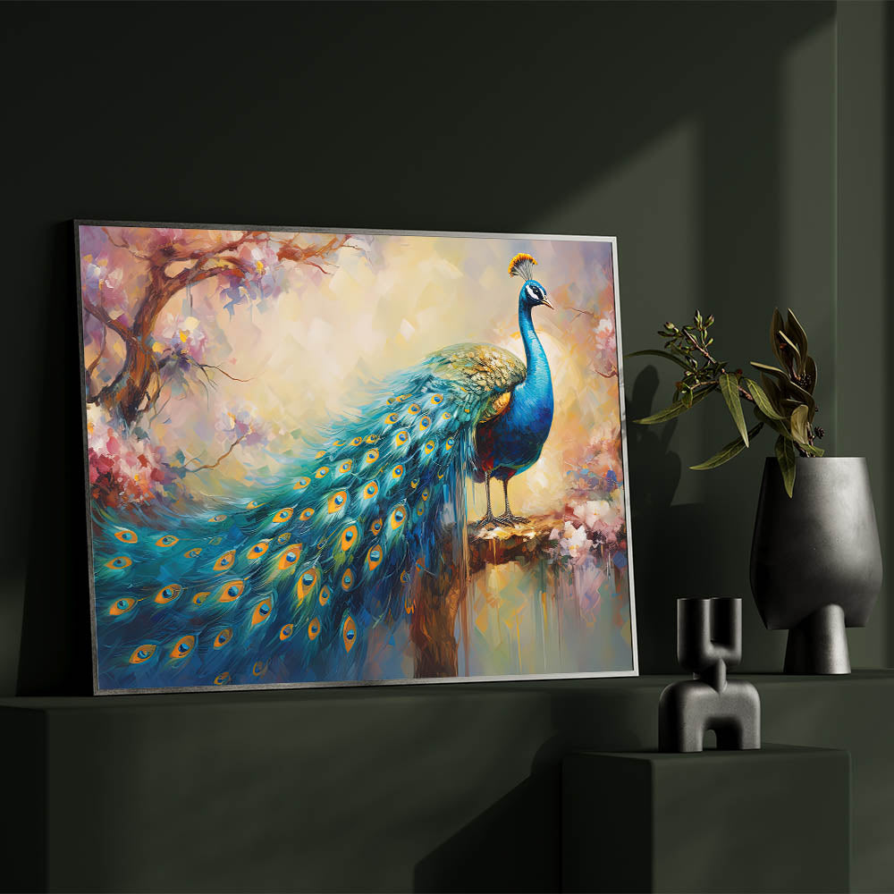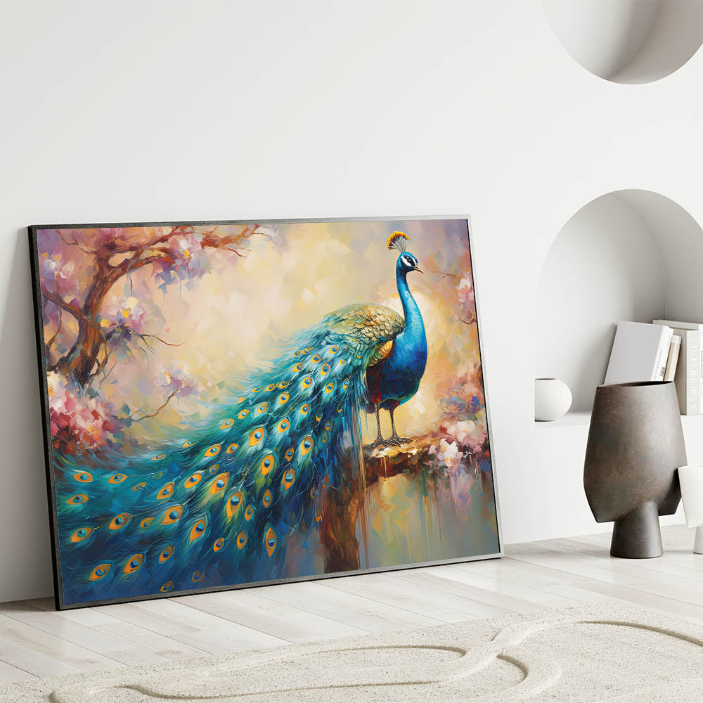 Tranquil Peacock and Blossoms Wall Art - Elegant Nature Canvas Print