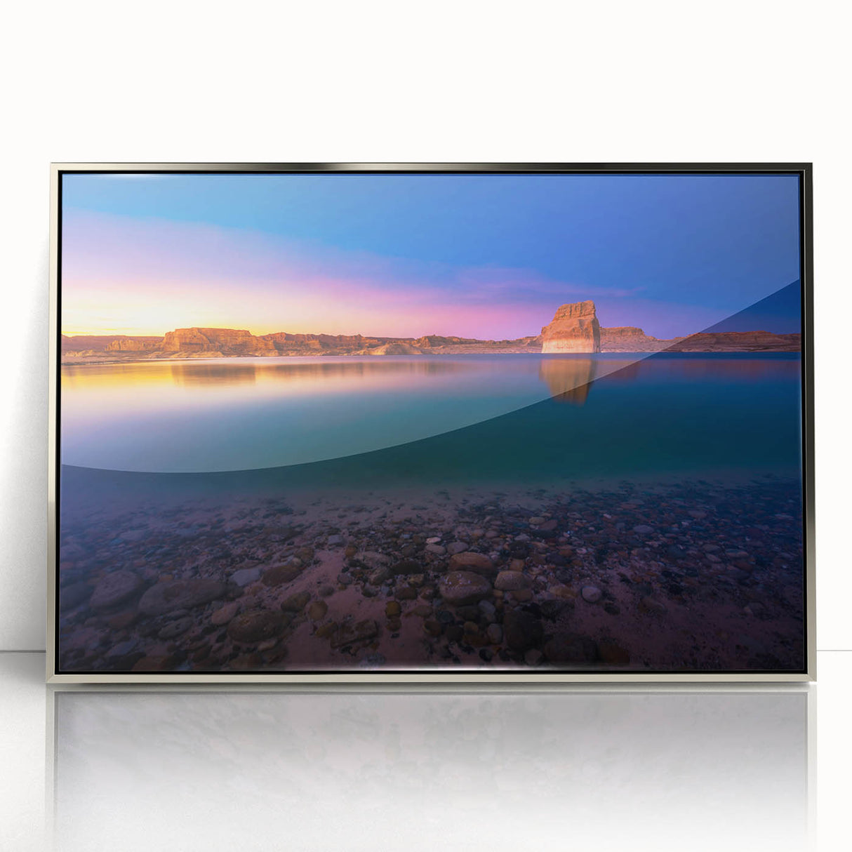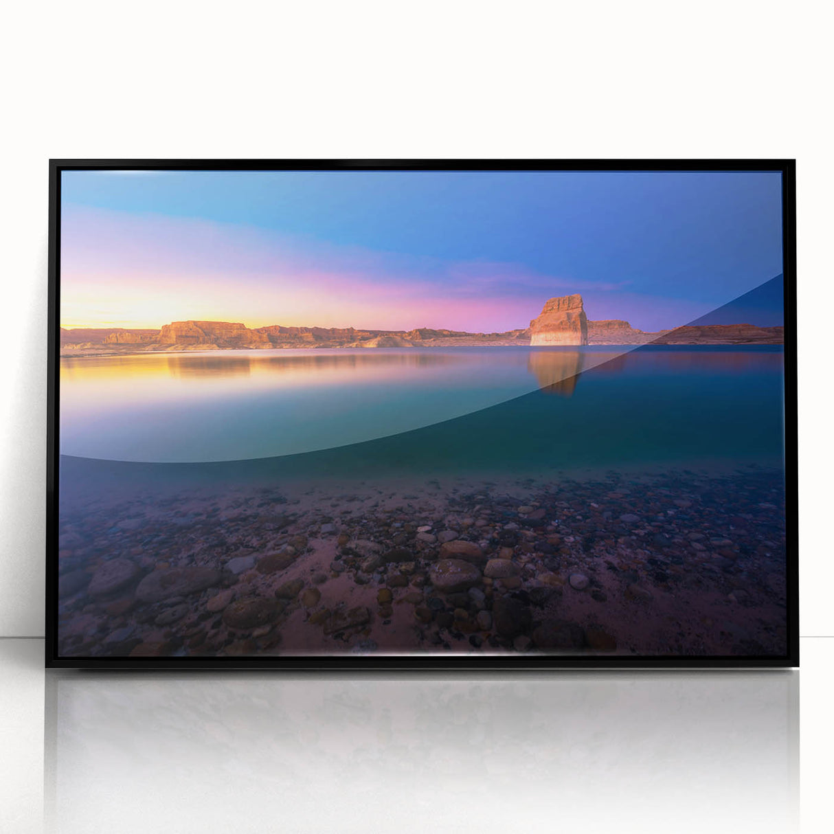 Whether you're looking for a calming accent for your decor or a bold statement piece, this Lake Powell landscape art will transform your space with the soothing colors of sunset and nature's majesty.