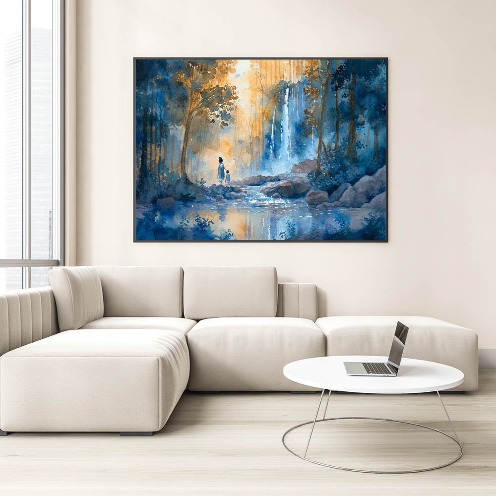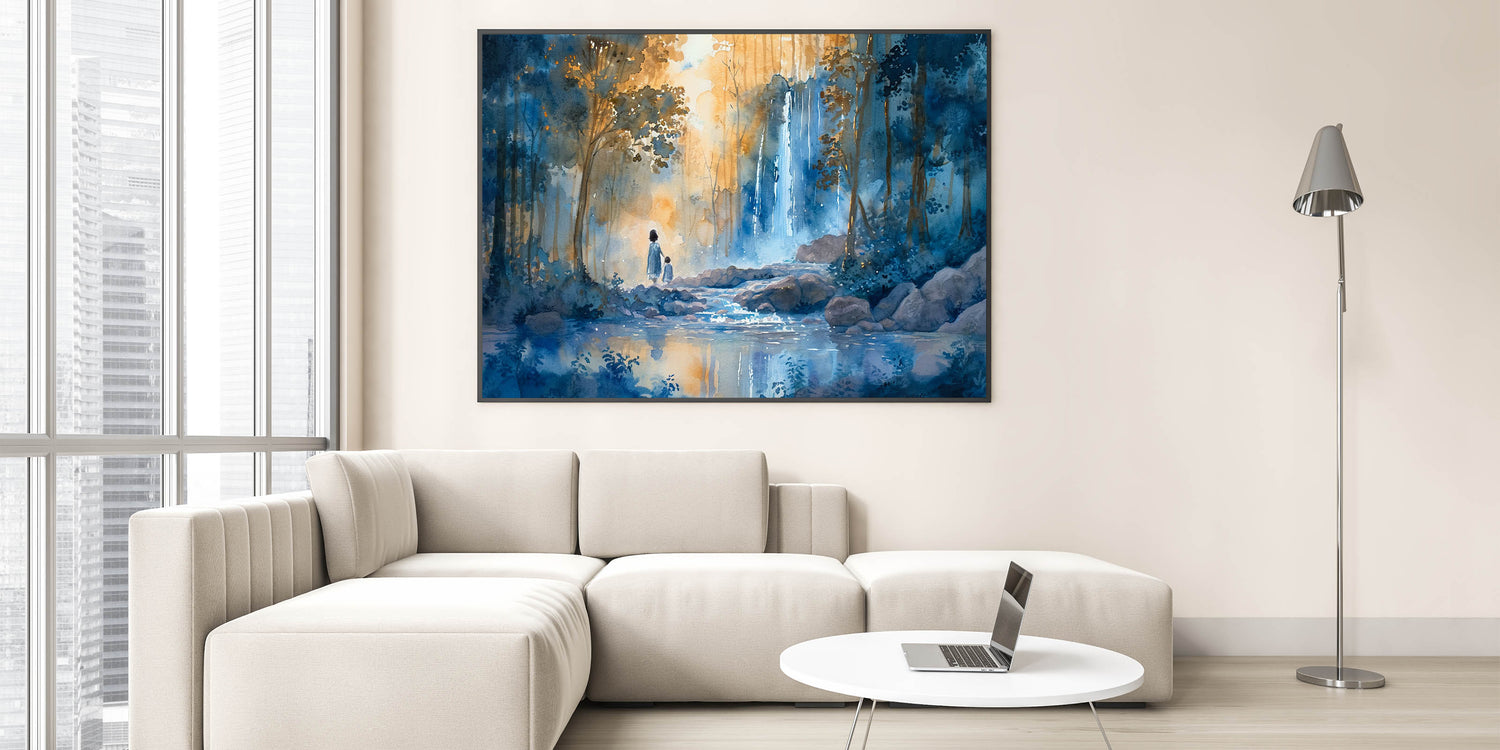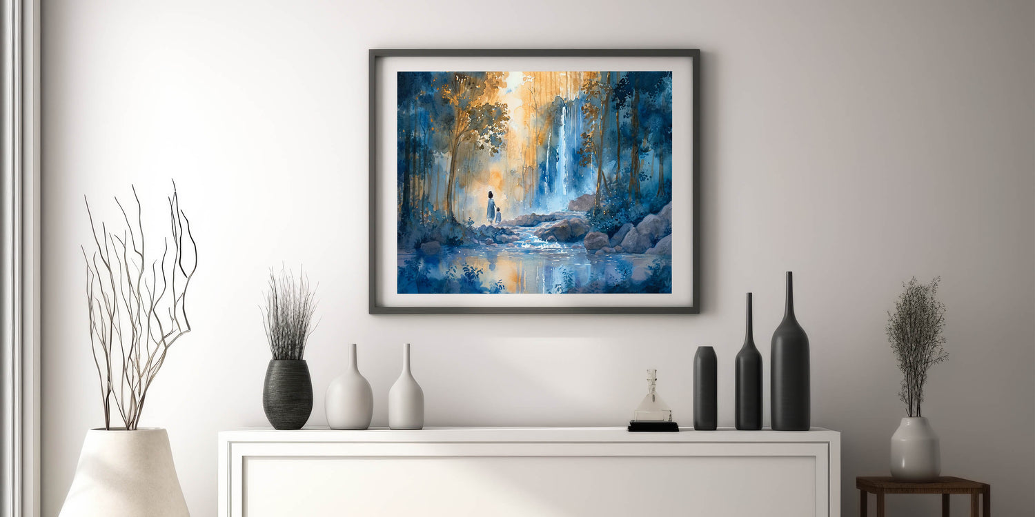 Experience the calming beauty of this Tranquil Watercolor Waterfall painting. This exquisite artwork captures a serene scene where a gentle waterfall cascades into a peaceful stream, surrounded by trees in soft shades of blue and gold. The subtle, soothing colors and delicate brushstrokes create a dreamy atmosphere, making this painting an ideal piece for any space that seeks to evoke feelings of peace and reflection.