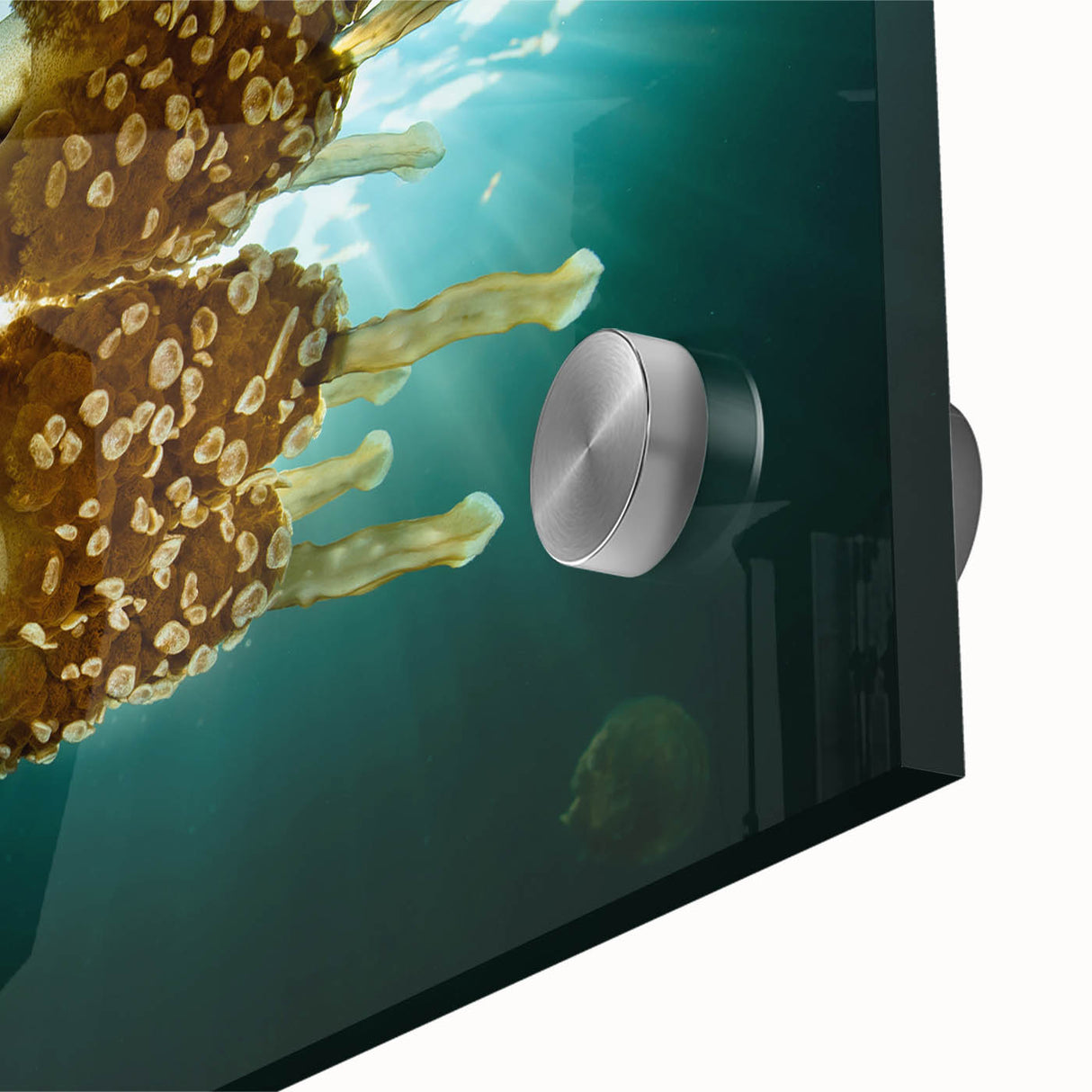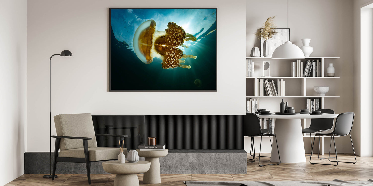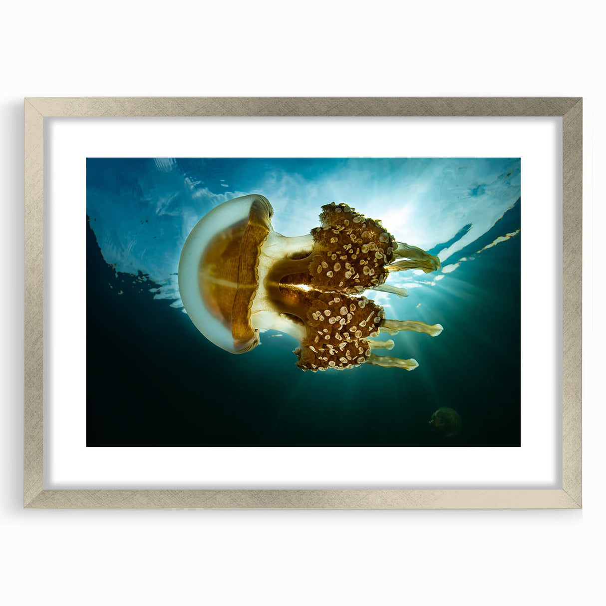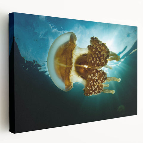 Discover the sublime beauty of the deep with our "Translucent Jellyfish Glow Art" from the Unique Pacific Ocean Art Pieces collection. This print captures a mesmerizing jellyfish, floating gracefully beneath the water's surface, illuminated by the natural light filtering through from above.
