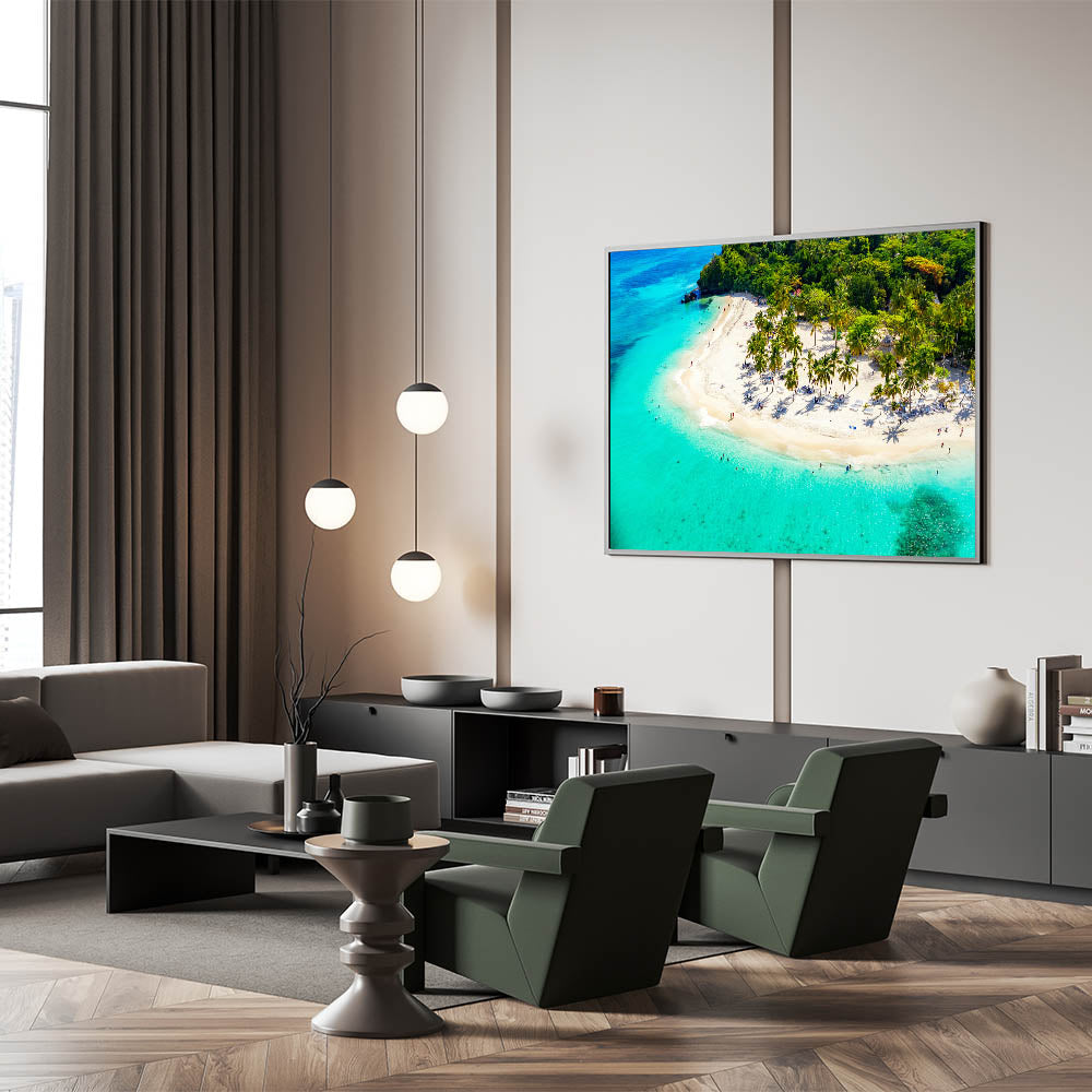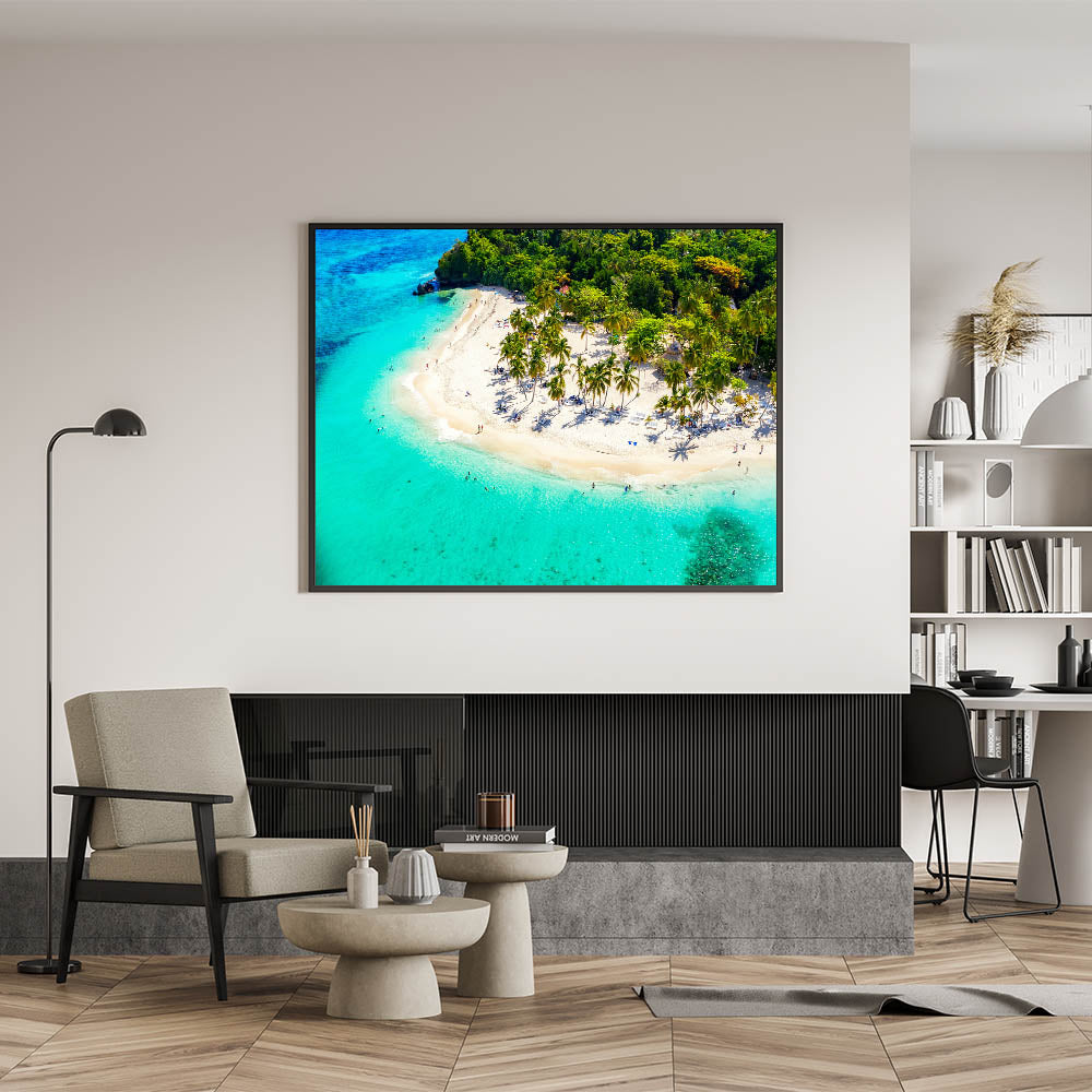 Elevate your interior with the vibrant beauty of this tropical beach aerial view wall art, showcasing a pristine shoreline dotted with swaying palm trees and surrounded by crystal-clear turquoise waters. Captured from above, this stunning scene offers a unique perspective on an idyllic island paradise, making it the perfect piece for anyone looking to bring the essence of the tropics into their home. Ideal for living rooms, bedrooms, or offices, this artwork adds a refreshing and lively touch to any space.