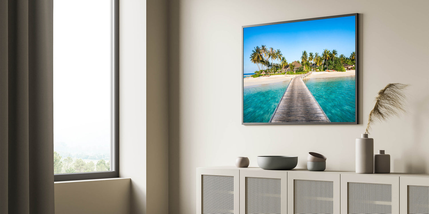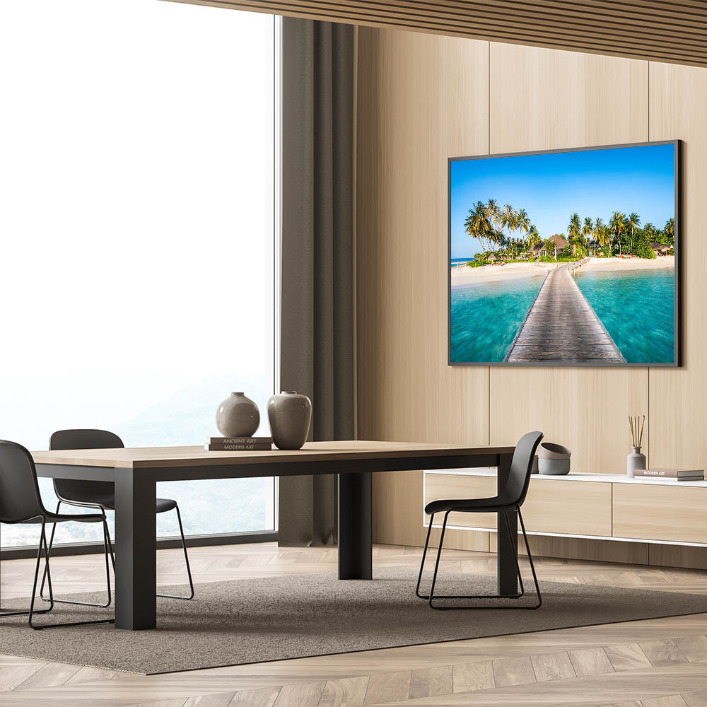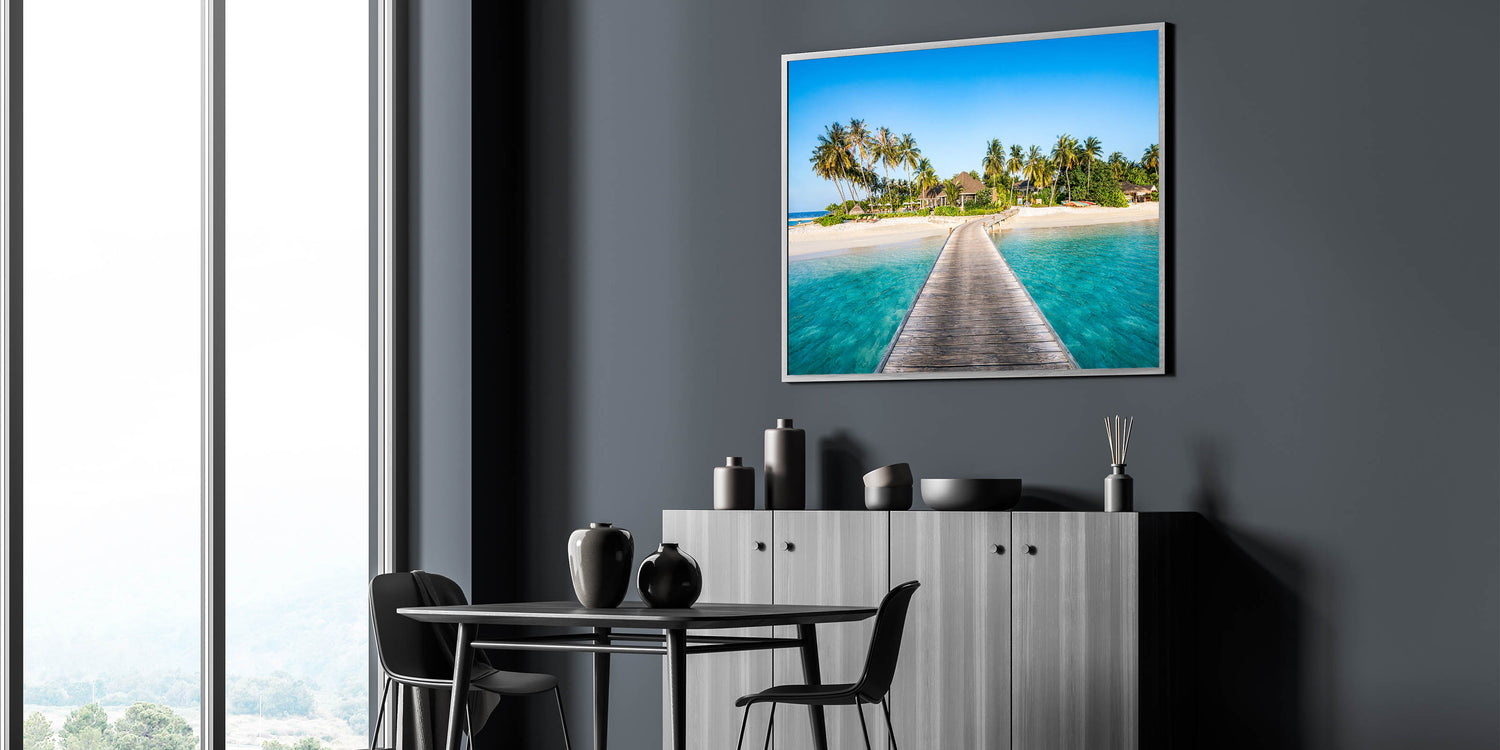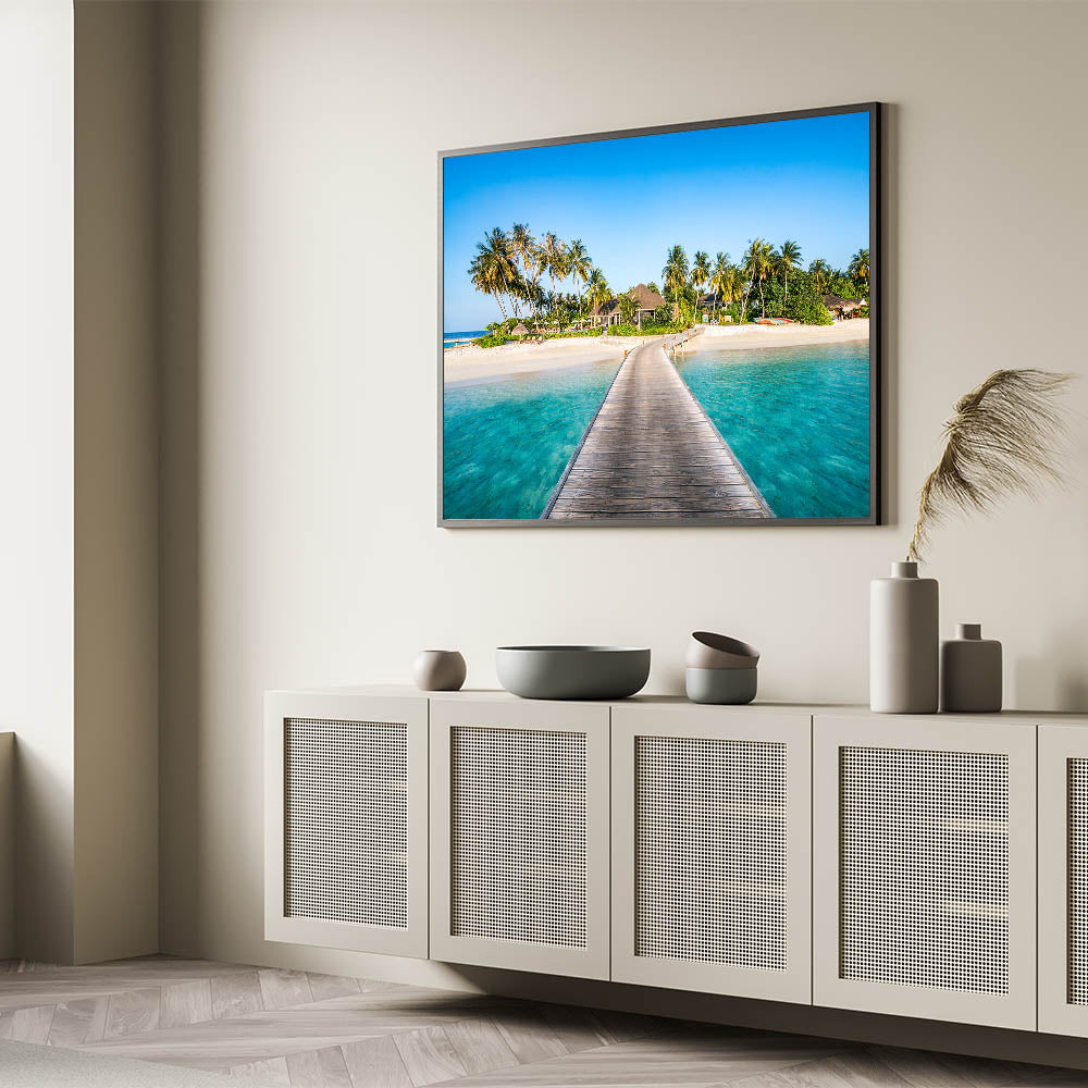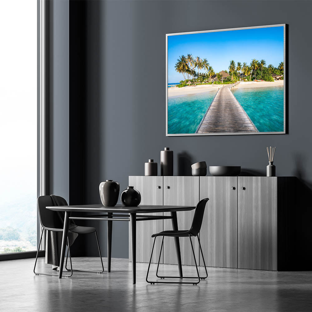 "Island Resort Wall Art" offers a daily retreat to the calming shores of Fiji, making it an excellent choice for anyone wishing to add a serene yet breathtaking element to their decor.
