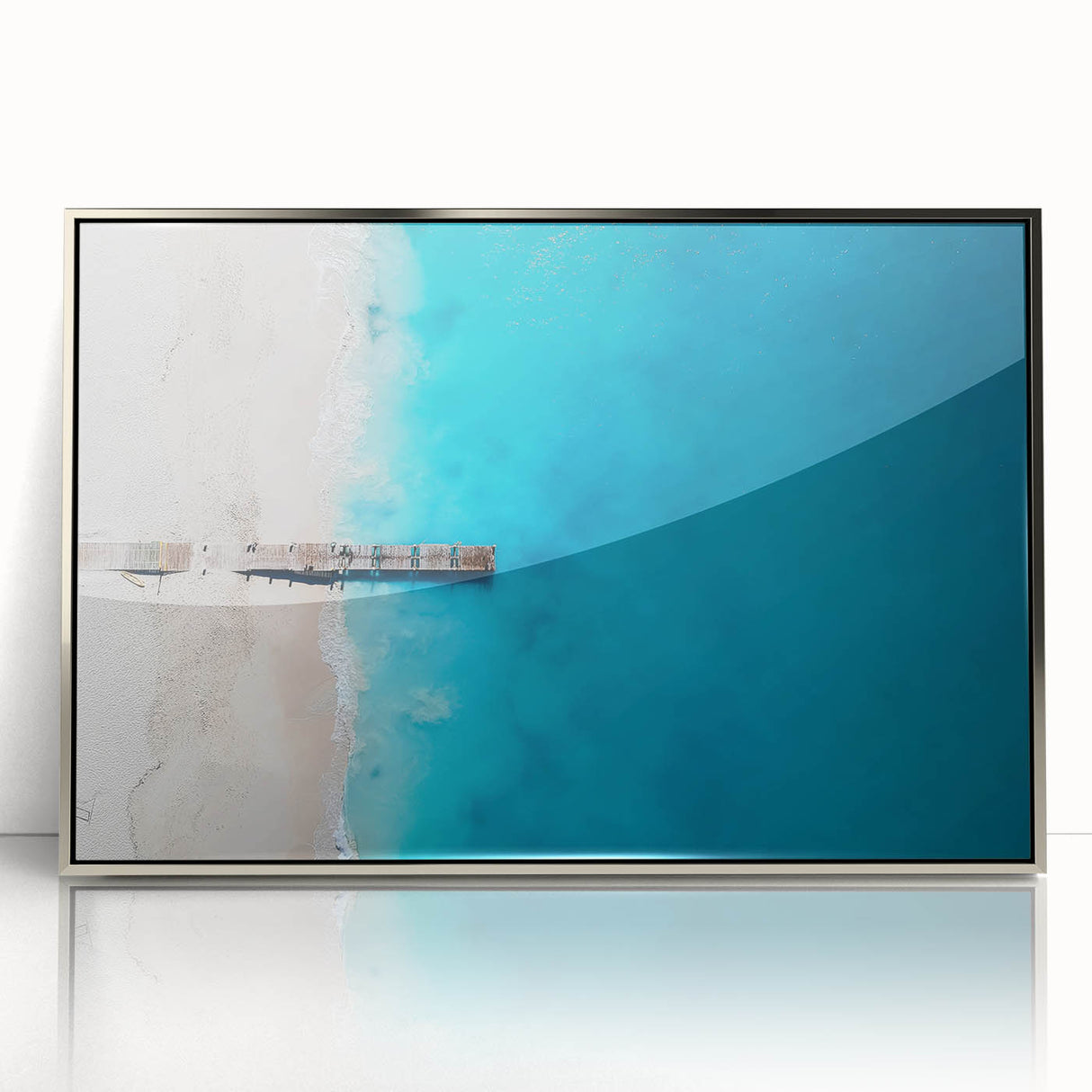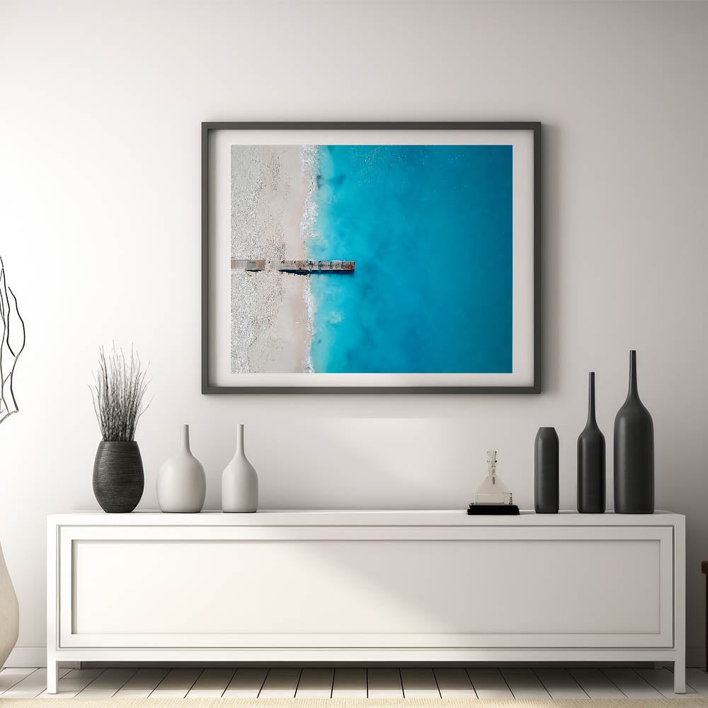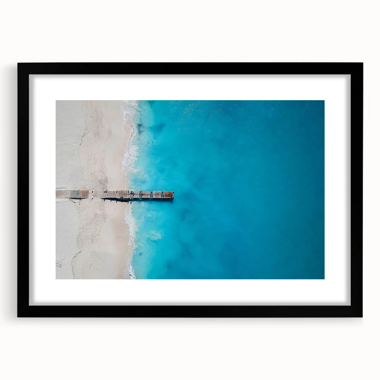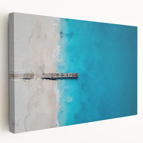 Step into the serene ambiance of Turks and Caicos with our "Tranquil Pier Panorama" wall art. Captured from an aerial perspective, this piece features a rustic wooden pier stretching into the vibrant, crystal-clear waters, surrounded by the soft sands of the Caribbean. It's an ideal choice for anyone looking to add a peaceful yet stunning element to their tropical decor.