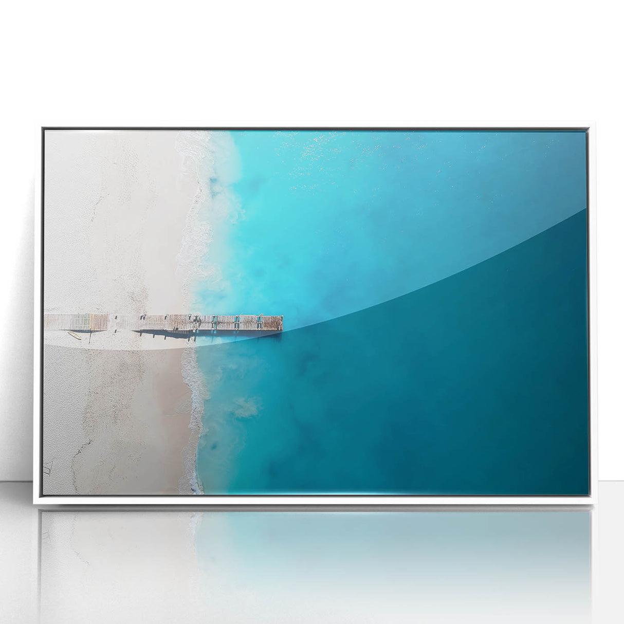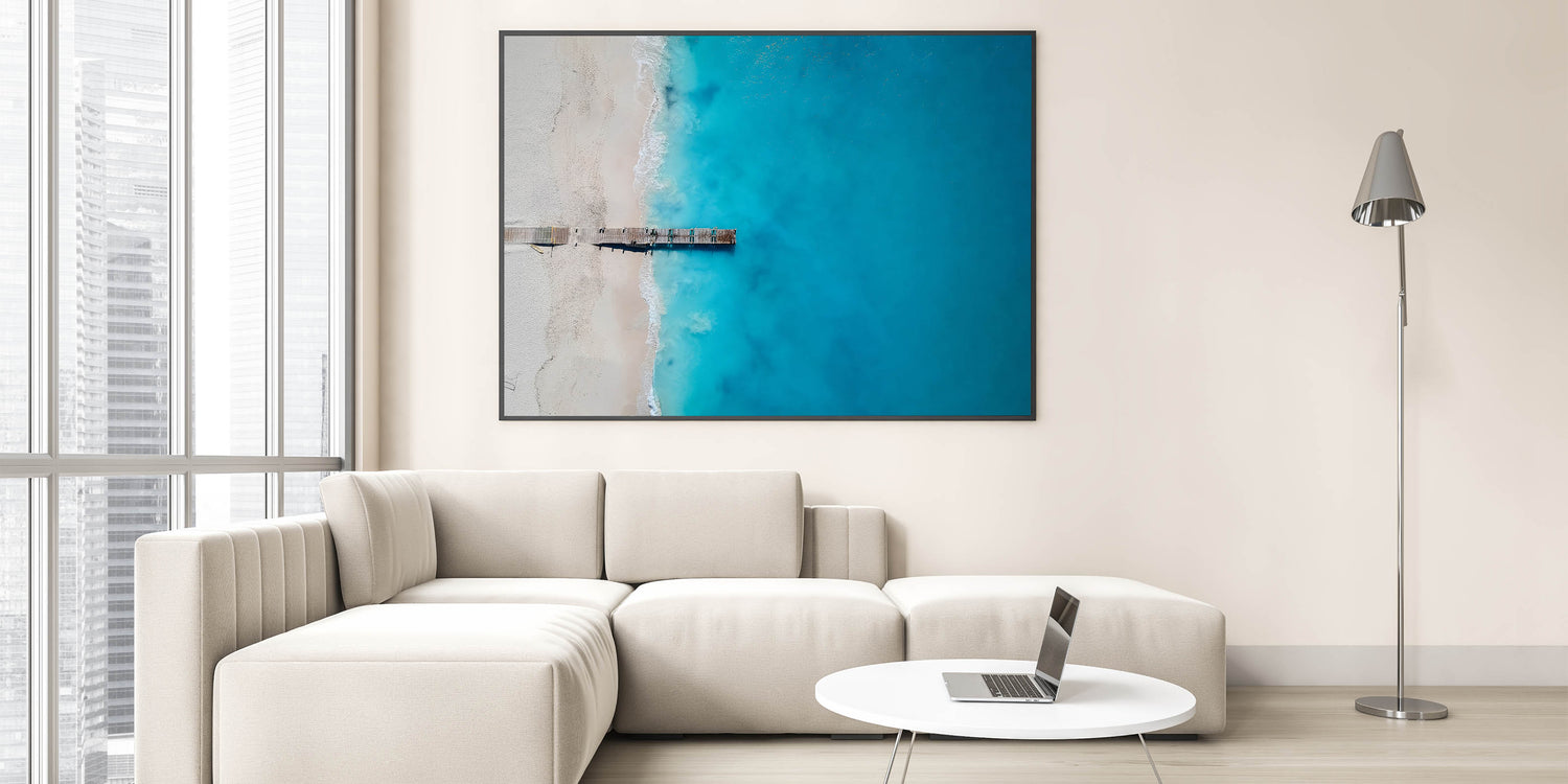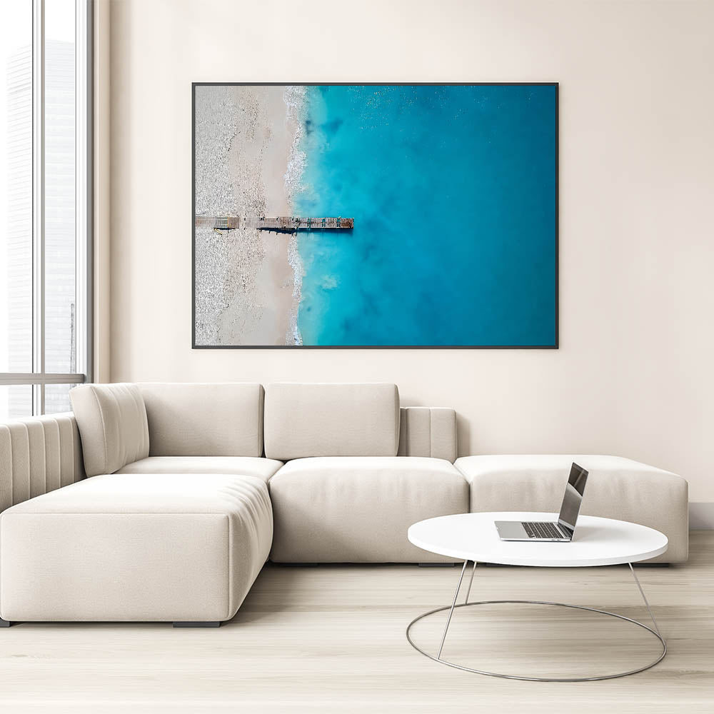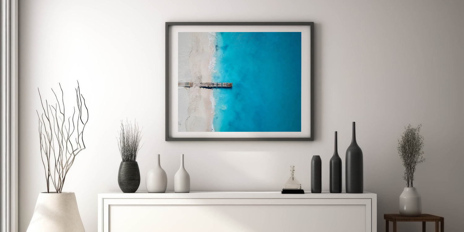 Step into the serene ambiance of Turks and Caicos with our "Tranquil Pier Panorama" wall art. Captured from an aerial perspective, this piece features a rustic wooden pier stretching into the vibrant, crystal-clear waters, surrounded by the soft sands of the Caribbean. It's an ideal choice for anyone looking to add a peaceful yet stunning element to their tropical decor.