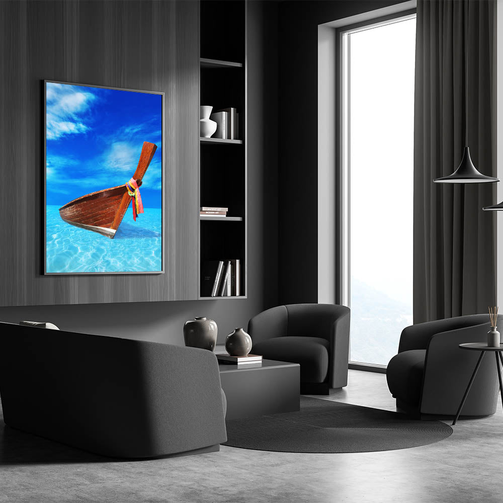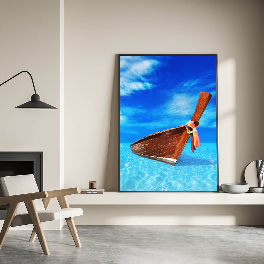 Bring the vibrant charm of the Caribbean to your home with this stunning Barbados wall art, featuring a wooden boat resting in crystal-clear turquoise waters under a brilliant blue sky. This captivating tropical scene perfectly embodies the beauty and serenity of island life, making it an ideal addition to any coastal or nautical-themed decor. The sharp contrast between the rustic boat and the serene water creates a visually stunning piece that will captivate attention in any space.