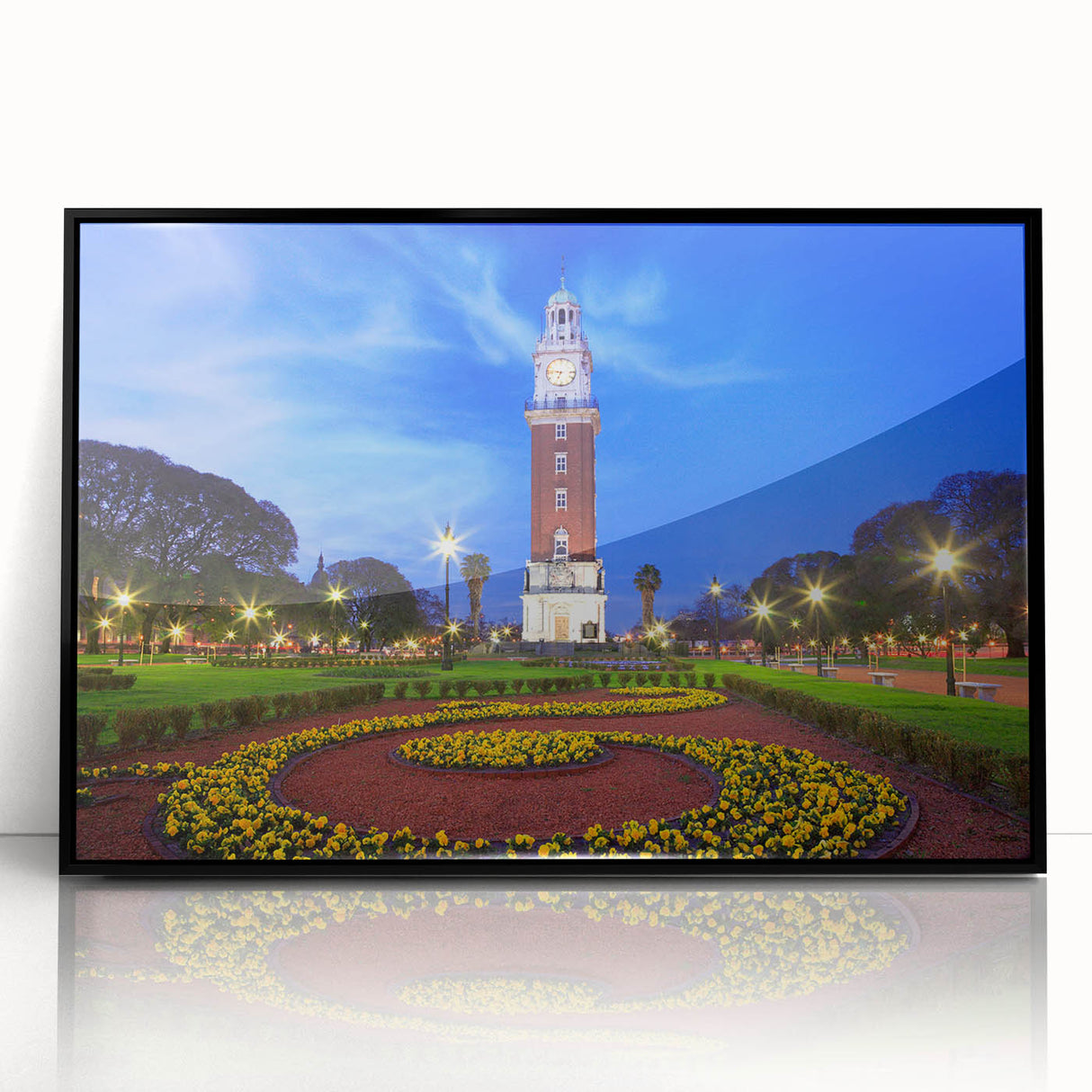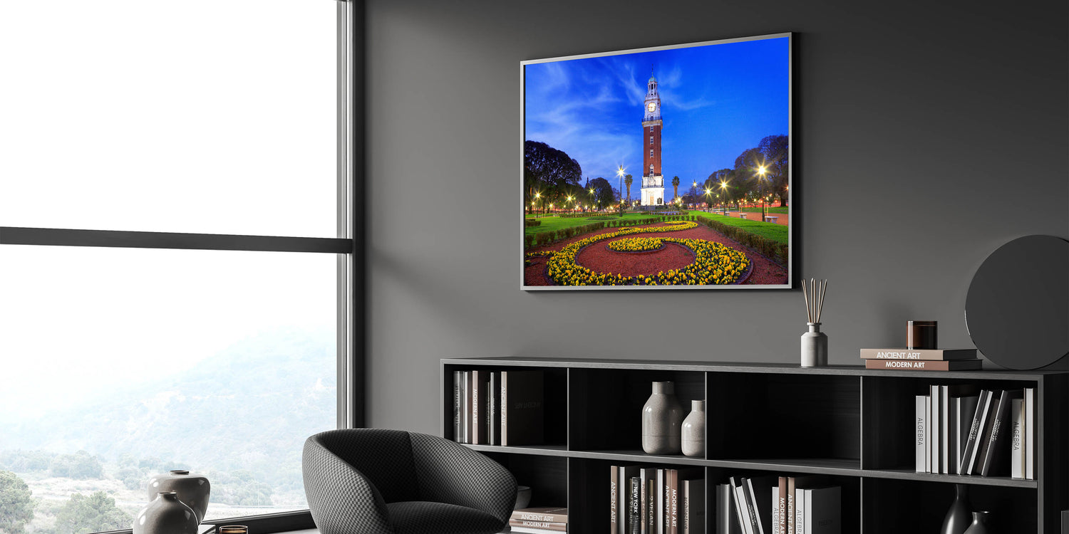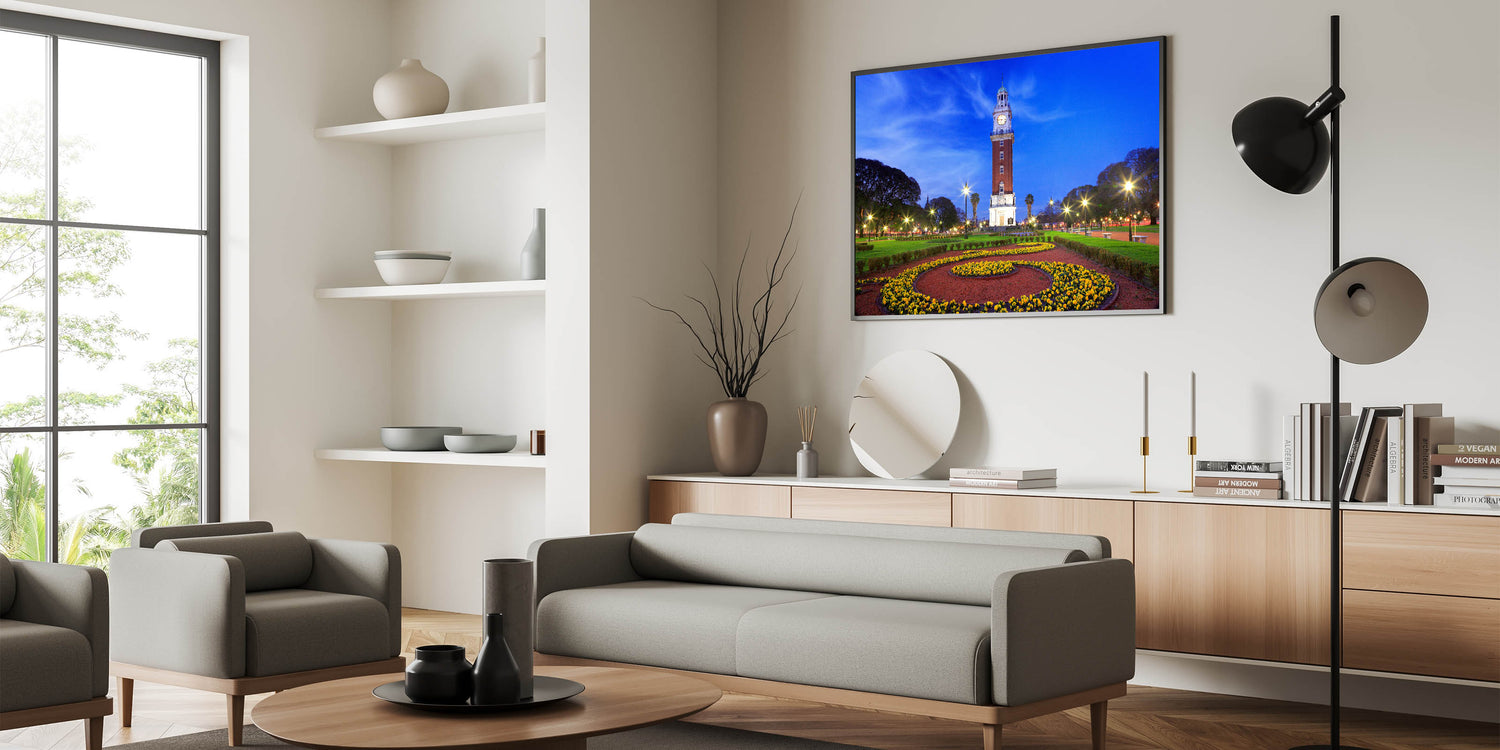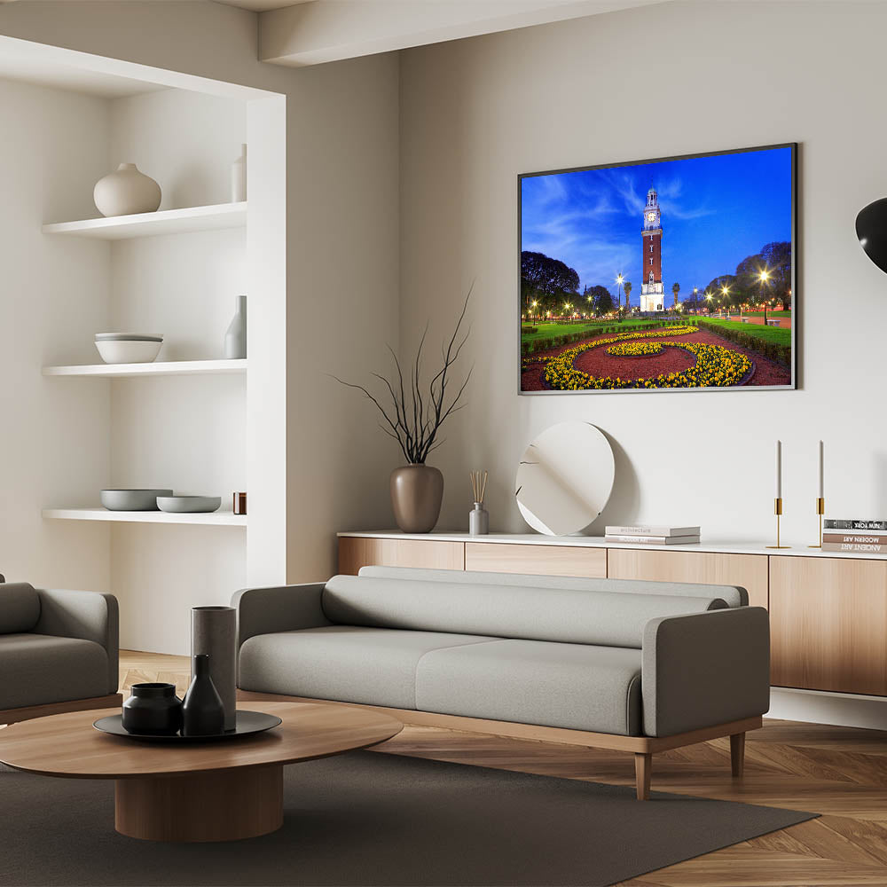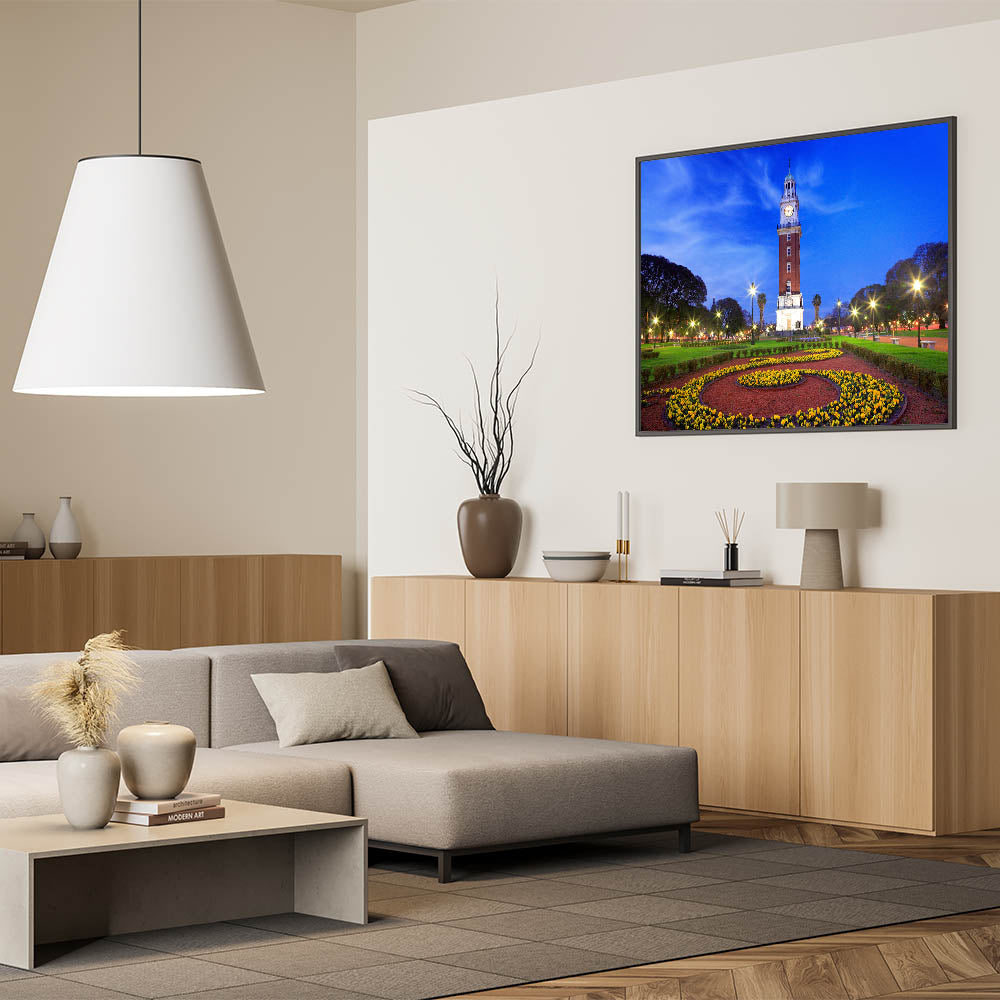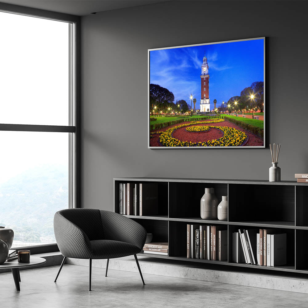 Marvel at the iconic beauty of Buenos Aires with our "Iconic Buenos Aires Tower - Twilight Canvas Art." This canvas art captures the majestic clock tower at twilight, its lights casting a warm glow against the deepening blue sky, surrounded by the lush greenery and vibrant flower beds of the city park.