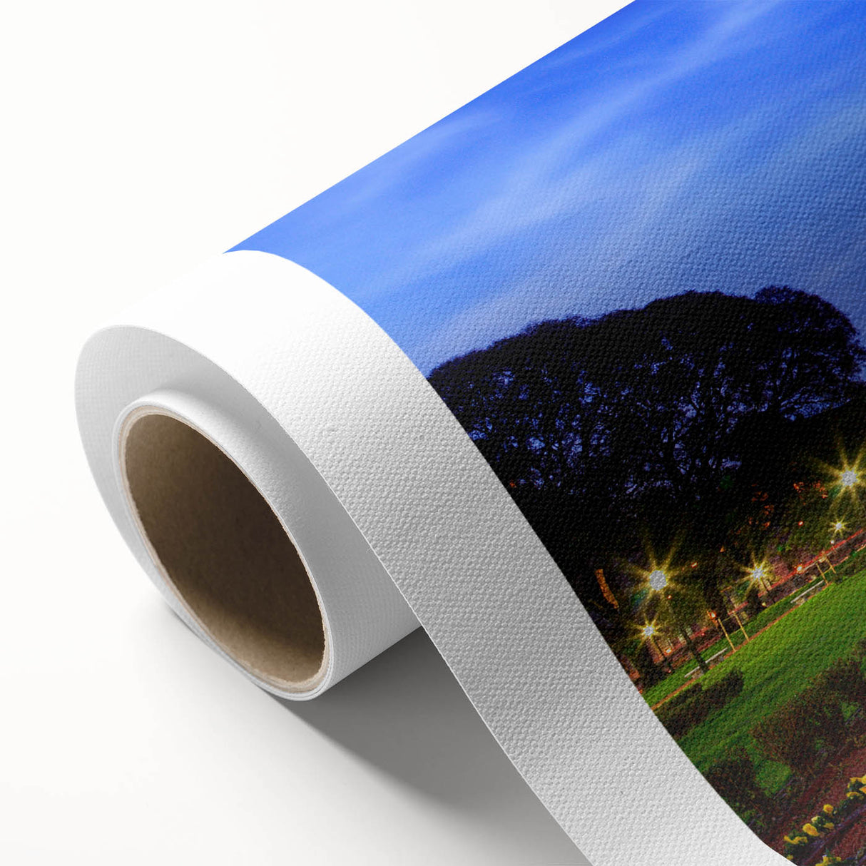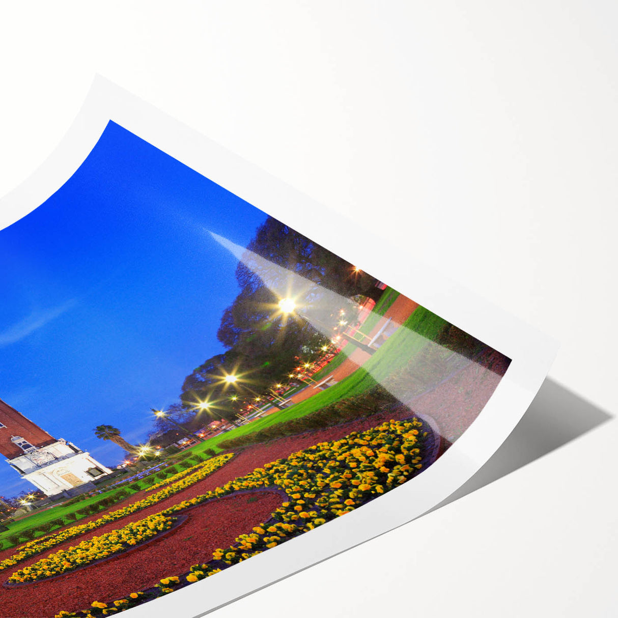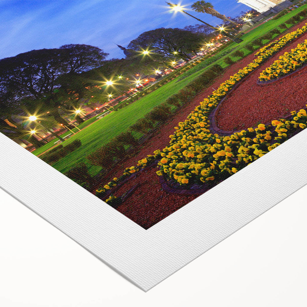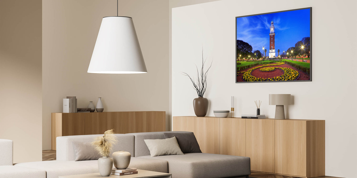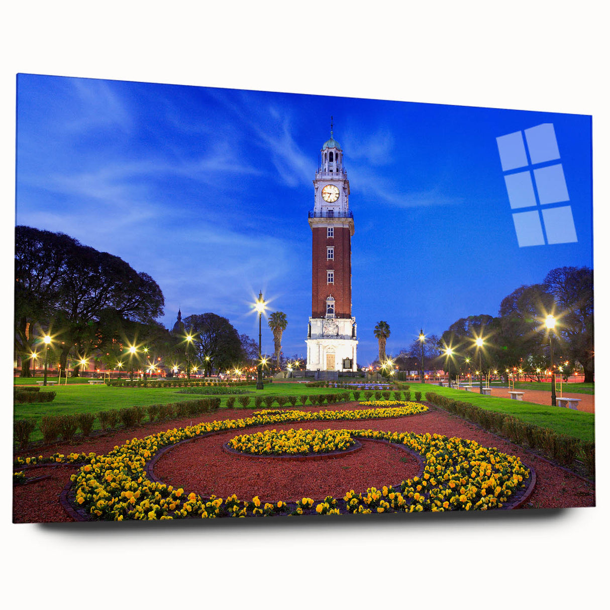 Marvel at the iconic beauty of Buenos Aires with our "Iconic Buenos Aires Tower - Twilight Canvas Art." This canvas art captures the majestic clock tower at twilight, its lights casting a warm glow against the deepening blue sky, surrounded by the lush greenery and vibrant flower beds of the city park.