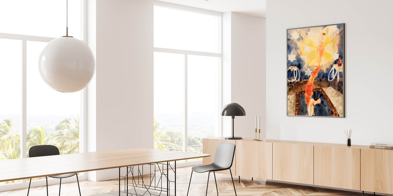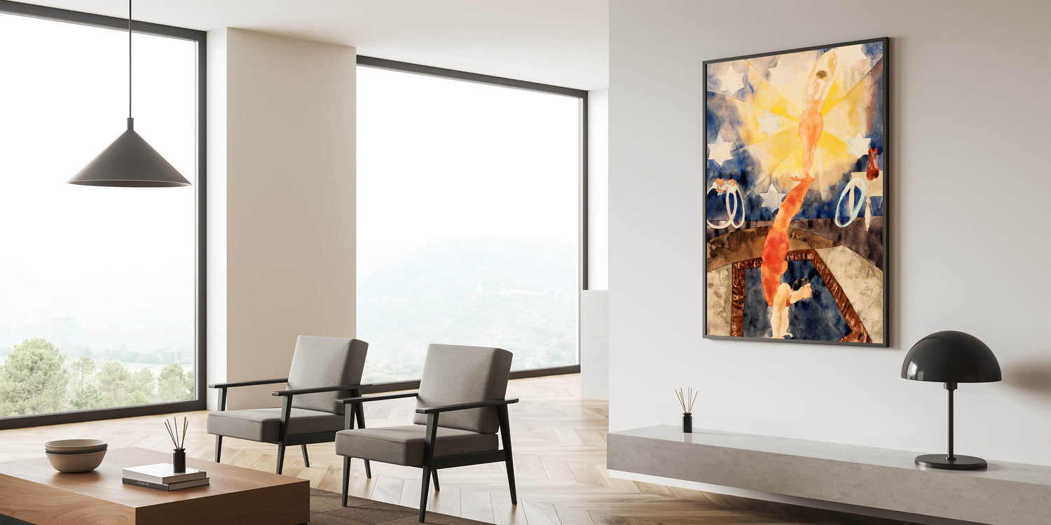 Bring dynamic energy and elegance to your walls with Charles Demuth’s "Two Acrobats in Red Tights" (1917), a stunning work of abstract modern art. This captivating piece features acrobatic figures in vivid red, highlighted by radiant yellows and deep blues, creating a sense of movement and theatricality. Ideal for trendy home decor, it beautifully blends modern design elements with timeless artistry.