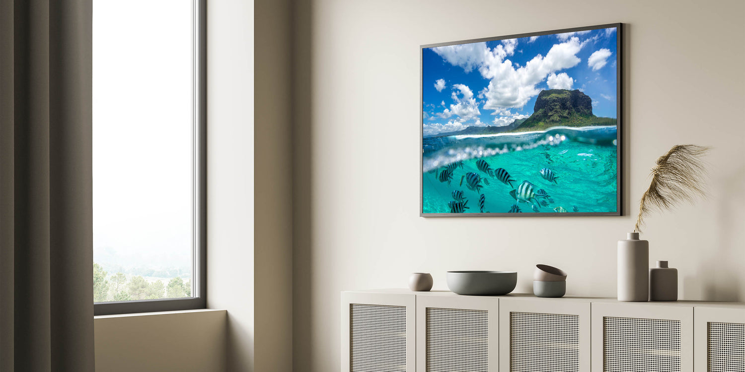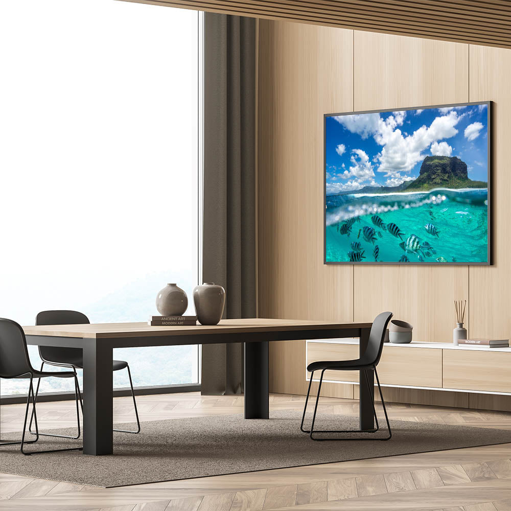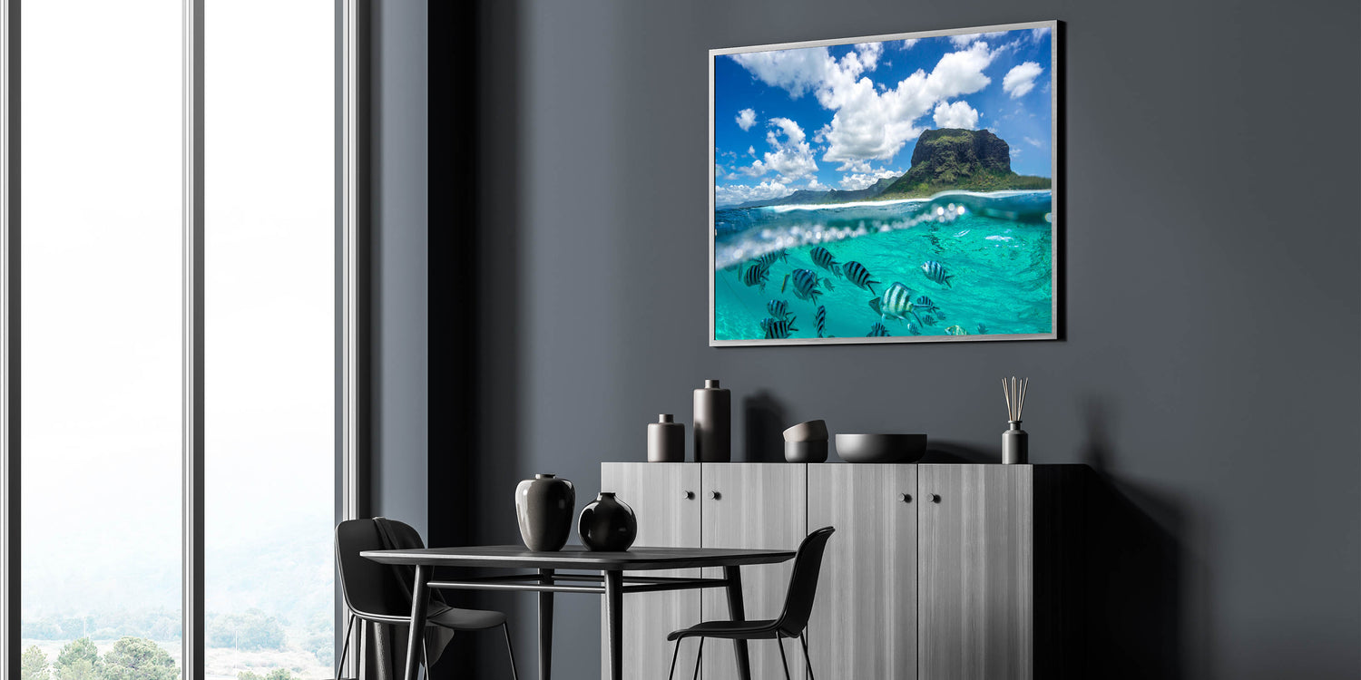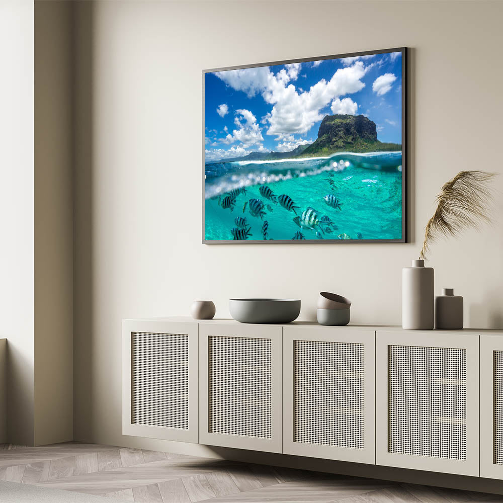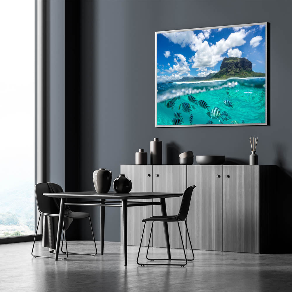 Dive into the stunning underwater world of Mauritius with this breathtaking wall art, capturing the vibrant marine life beneath the crystal-clear waters of Le Morne Beach. This piece from our Mauritius Art Collection beautifully combines the striking landscape of Le Morne Brabant mountain with the lively underwater scene, offering a unique perspective that brings both land and sea to life.