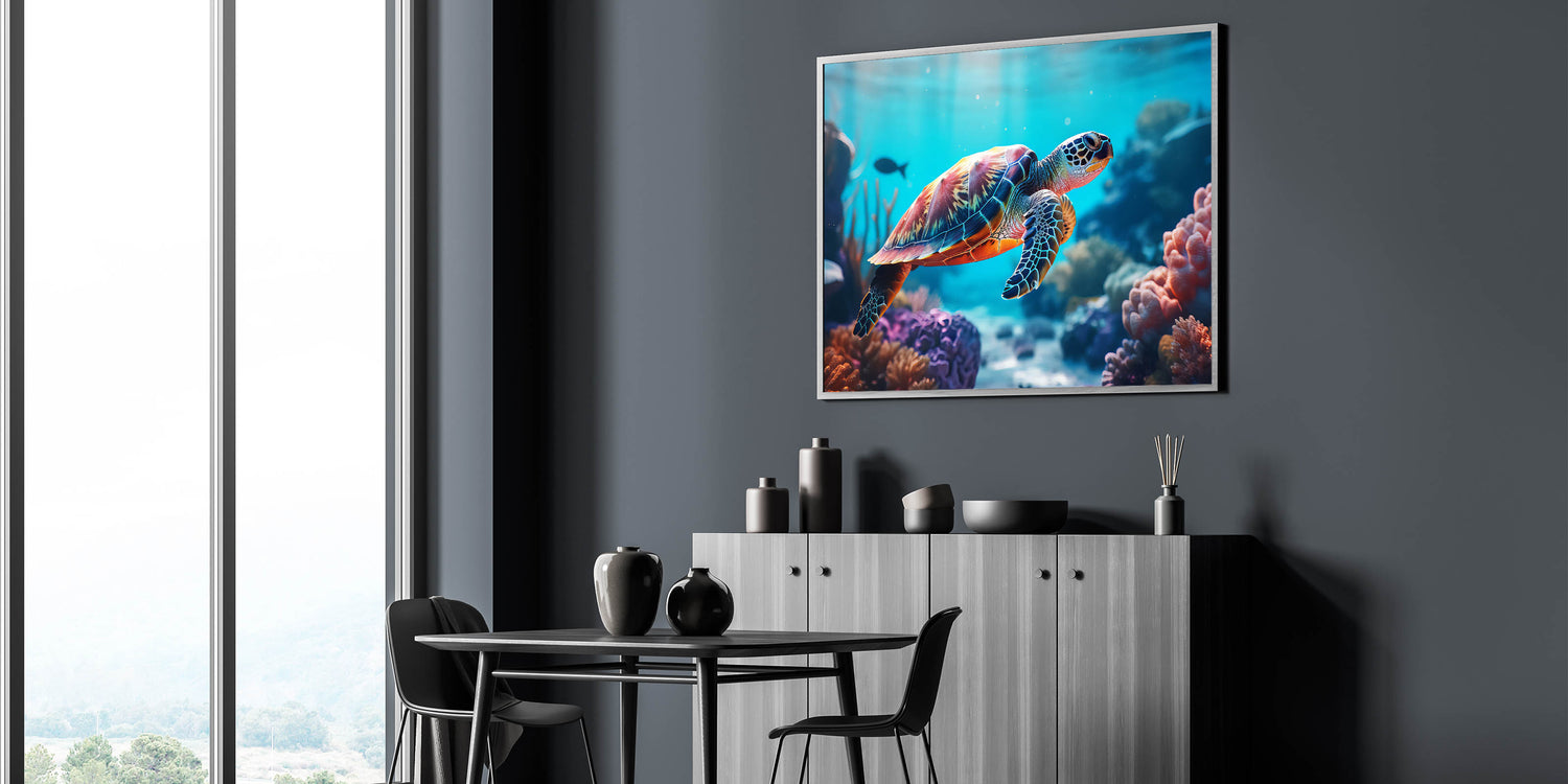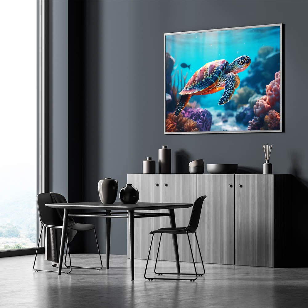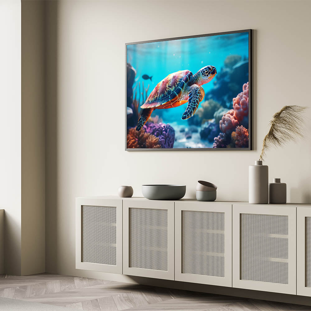 Dive into the beauty of the ocean with this stunning sea turtle wall art. Capturing the vibrant colors of underwater life, this artwork features a majestic sea turtle swimming gracefully among coral reefs. Perfect for ocean lovers, this print adds a splash of marine life to any room, bringing the serenity of the sea indoors.