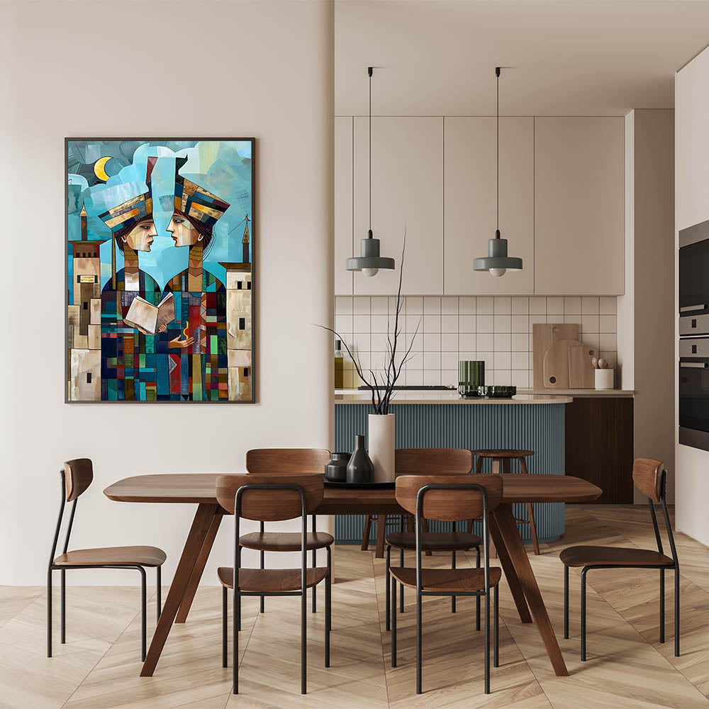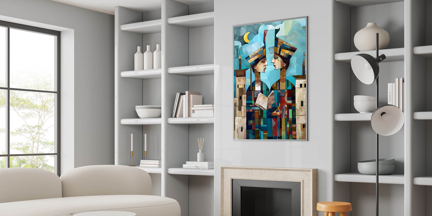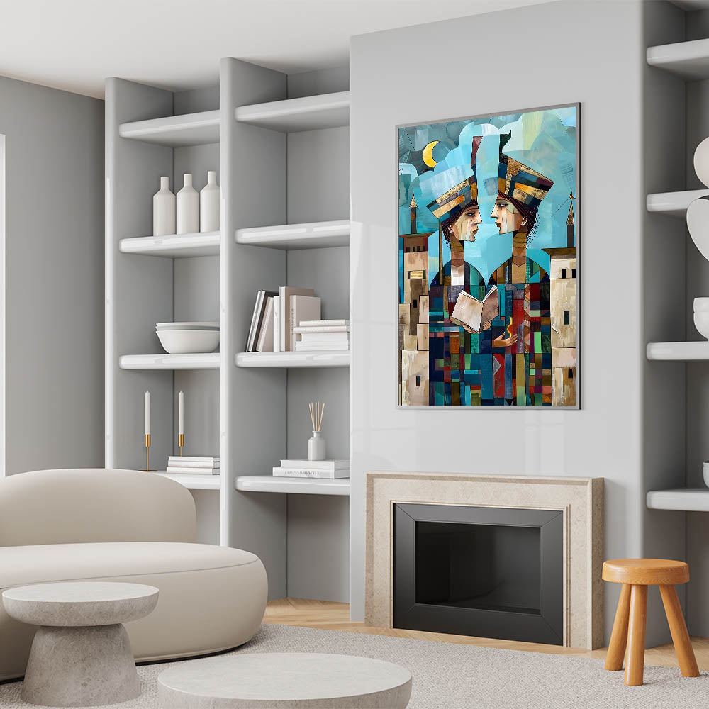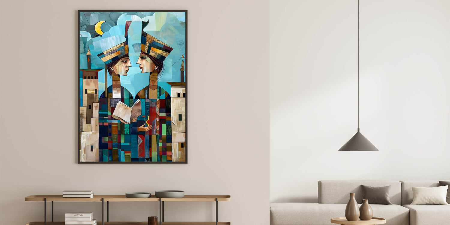 Explore the rich cultural history of Mesopotamia through this captivating Abstract Mesopotamian Scholars wall art. The two figures, depicted in a modern, geometric style, are shown holding a book and a symbol of light, symbolizing knowledge and wisdom. The layered shapes and vibrant colors add depth to the artwork, while the background features soft blue skies and architectural elements that reflect the ancient Middle Eastern landscape. This piece beautifully merges history and contemporary design, offering a unique blend of cultural significance and artistic expression.