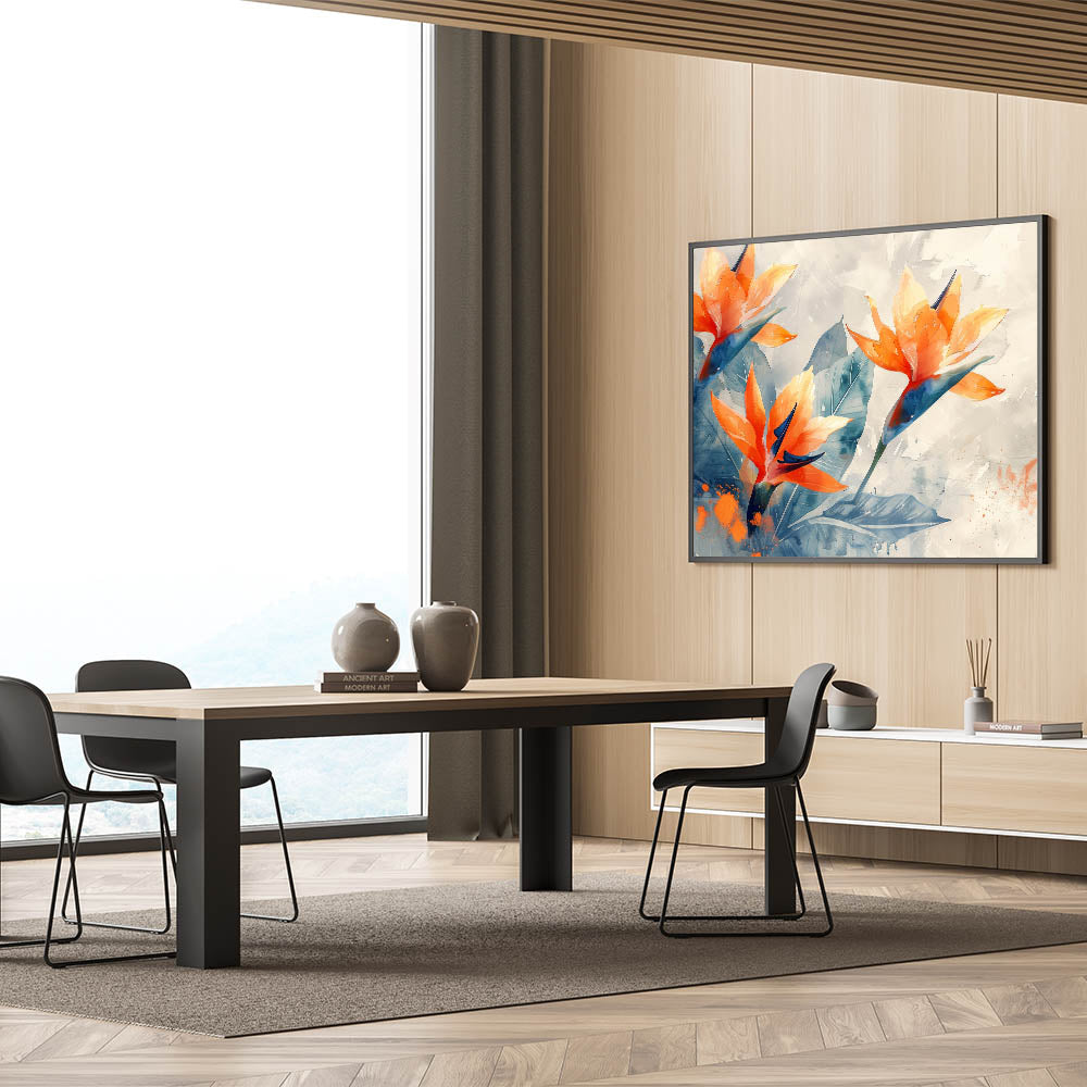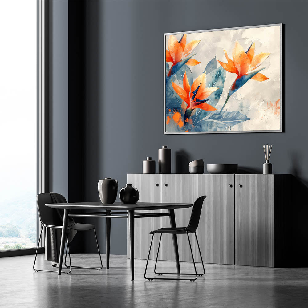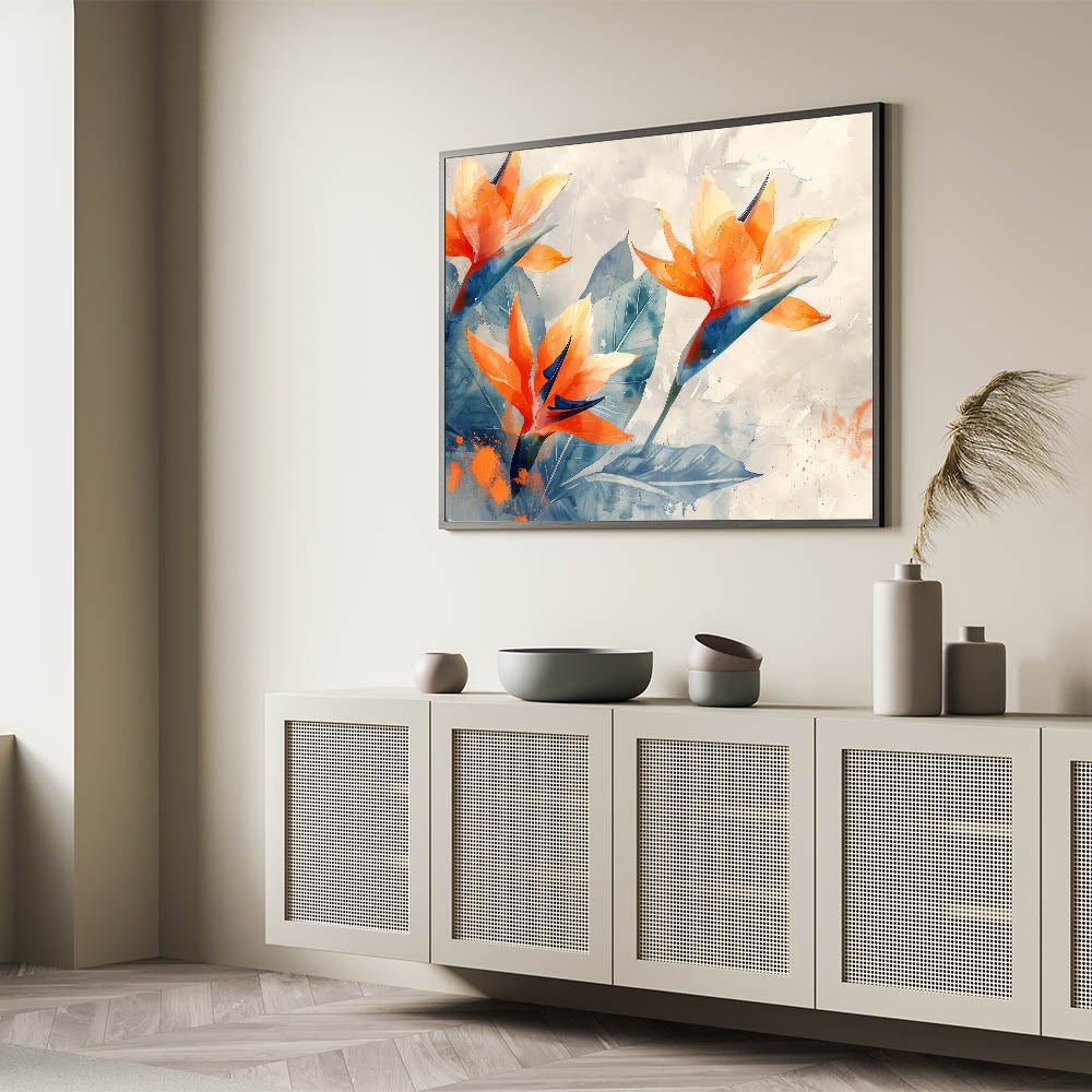 Brighten your space with this Bird of Paradise Canvas Art, featuring an artistic watercolor interpretation of the stunning tropical flower. The warm orange petals contrast beautifully with cool blue tones, giving this piece a lively yet balanced look. Perfect for those who love colorful flower wall decor with a modern twist, this artwork is designed to bring a splash of exotic elegance to any room.