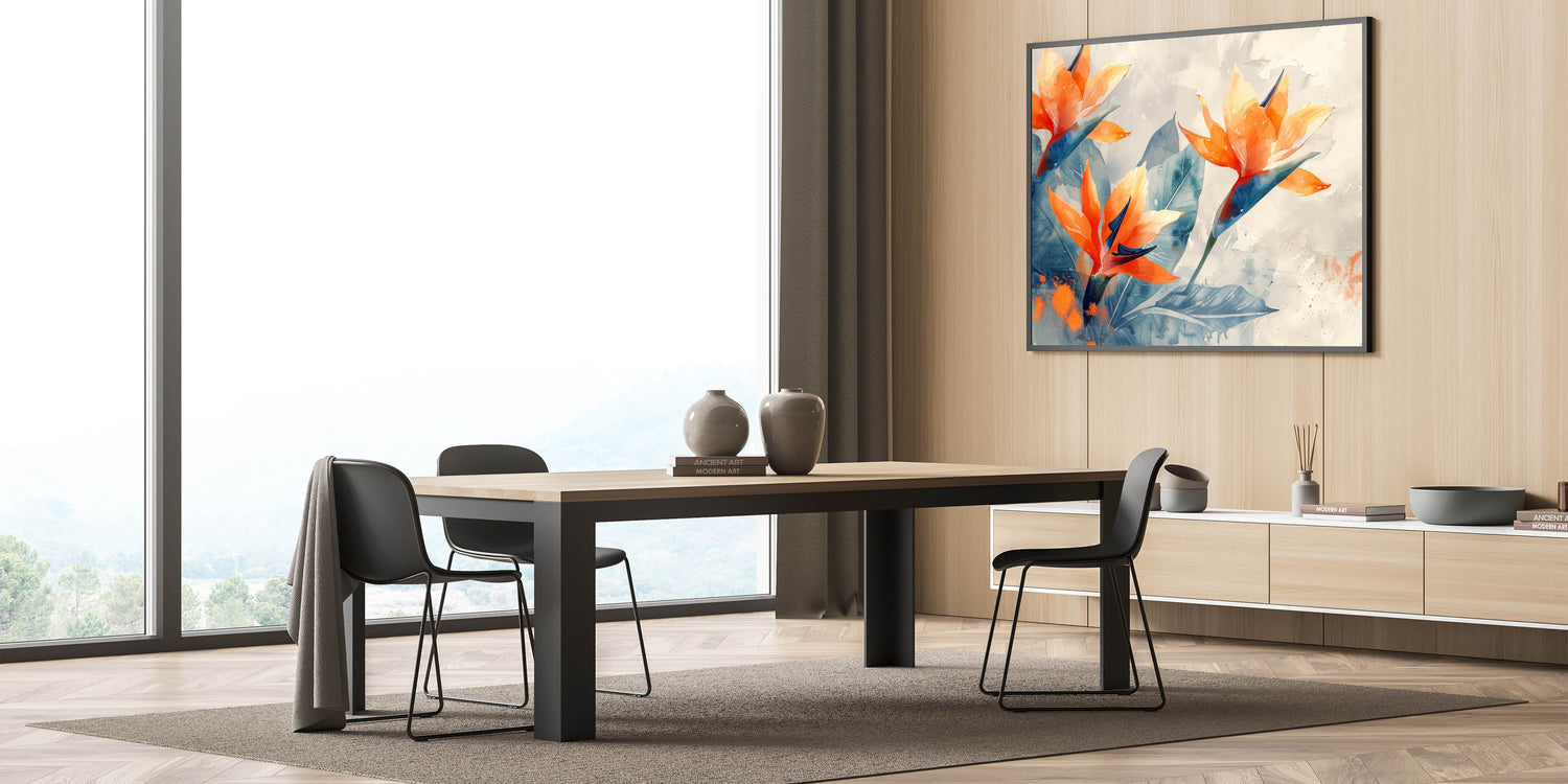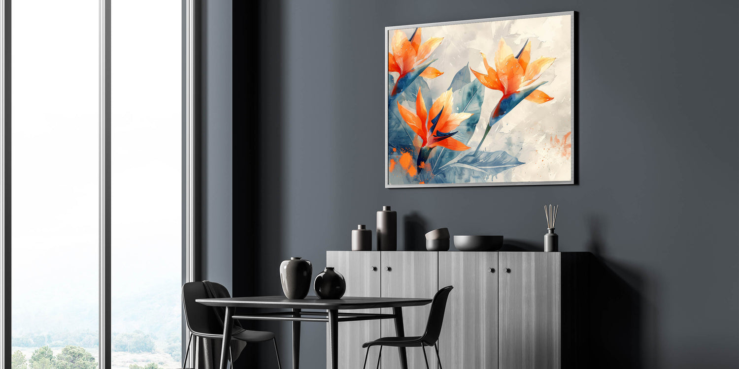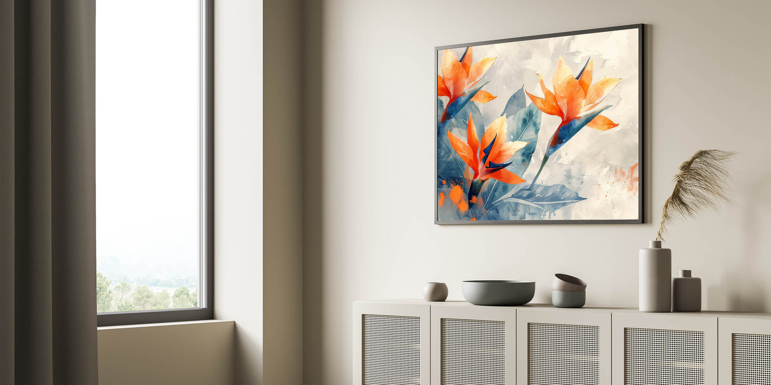 Brighten your space with this Bird of Paradise Canvas Art, featuring an artistic watercolor interpretation of the stunning tropical flower. The warm orange petals contrast beautifully with cool blue tones, giving this piece a lively yet balanced look. Perfect for those who love colorful flower wall decor with a modern twist, this artwork is designed to bring a splash of exotic elegance to any room.