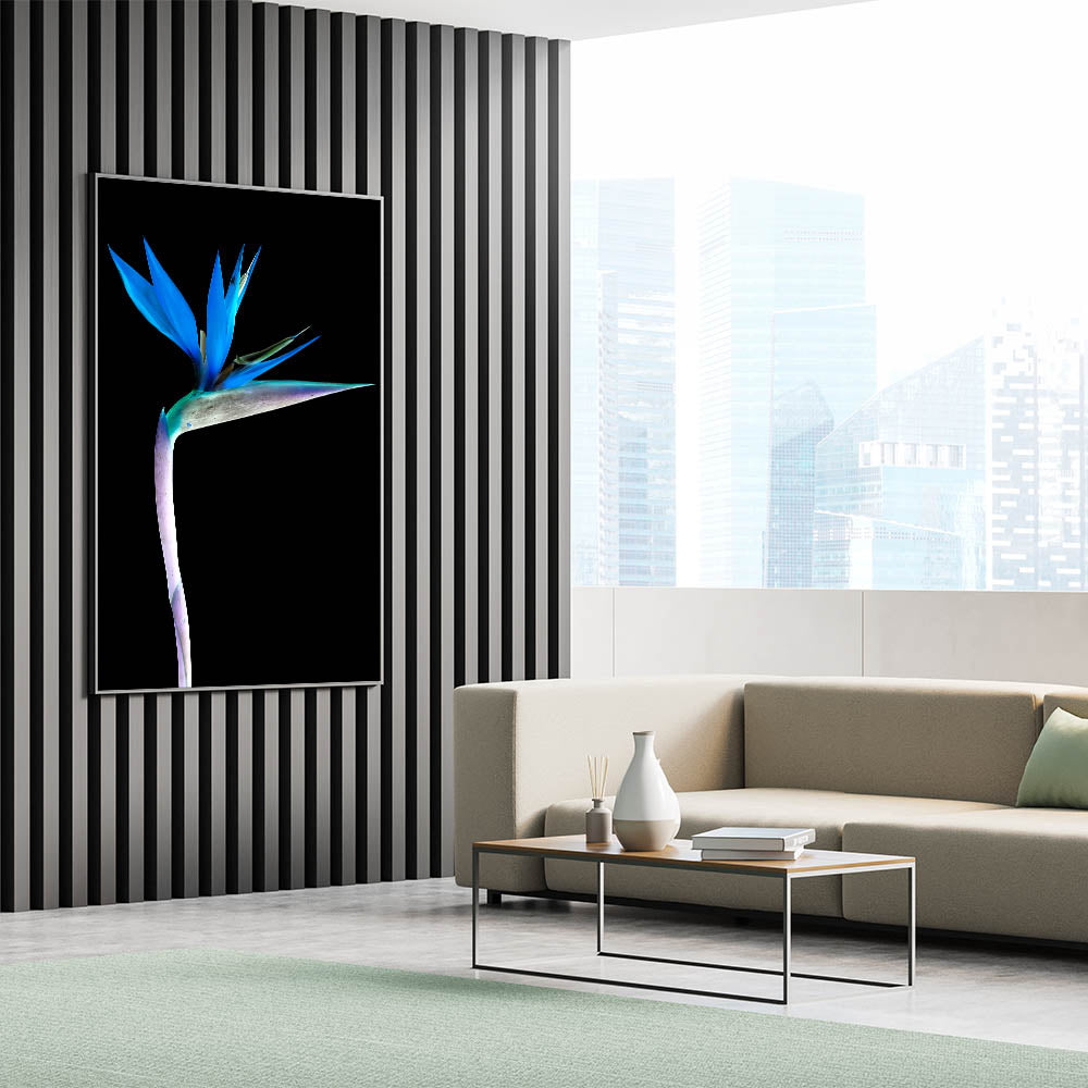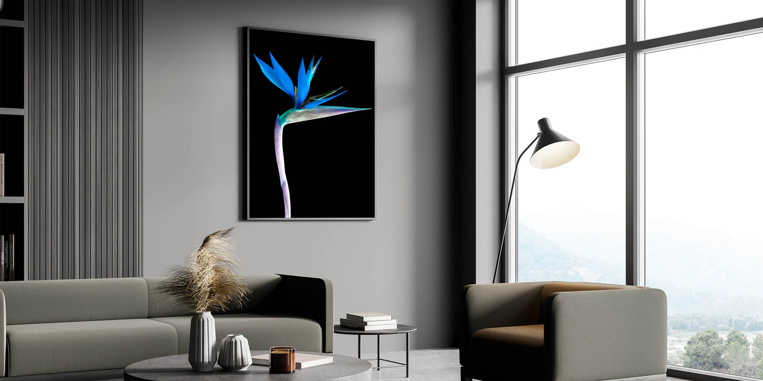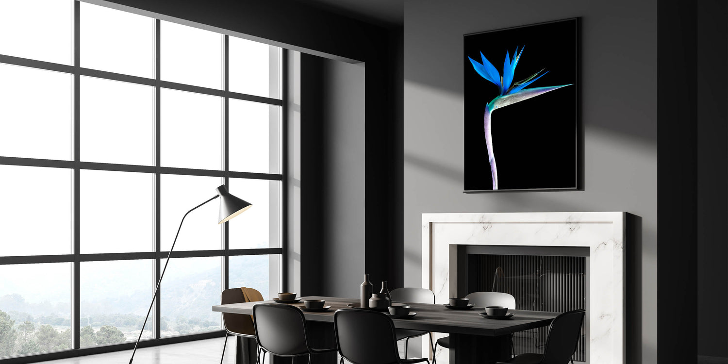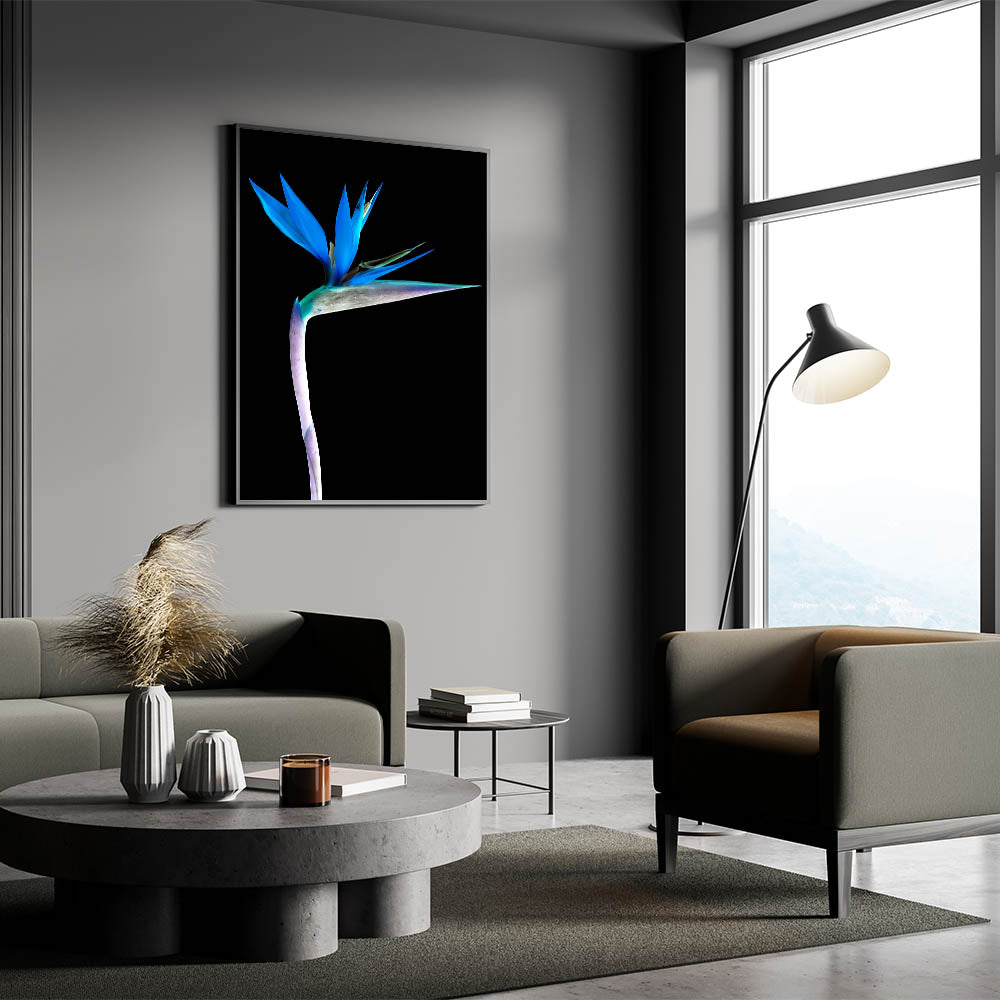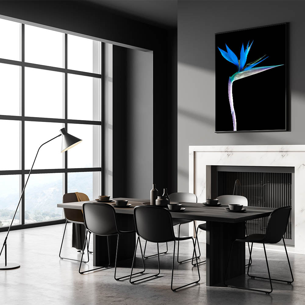 Bring the vibrant essence of the tropics into your home with this stunning Bird of Paradise wall art. Perfectly capturing the exotic beauty of the Strelitzia flower, this piece of botanical artwork is ideal for nature lovers and those who appreciate striking floral designs. The vivid blue tones of the petals, set against a dark background, make this art print a captivating addition to any space, whether it's a living room, office, or bedroom.