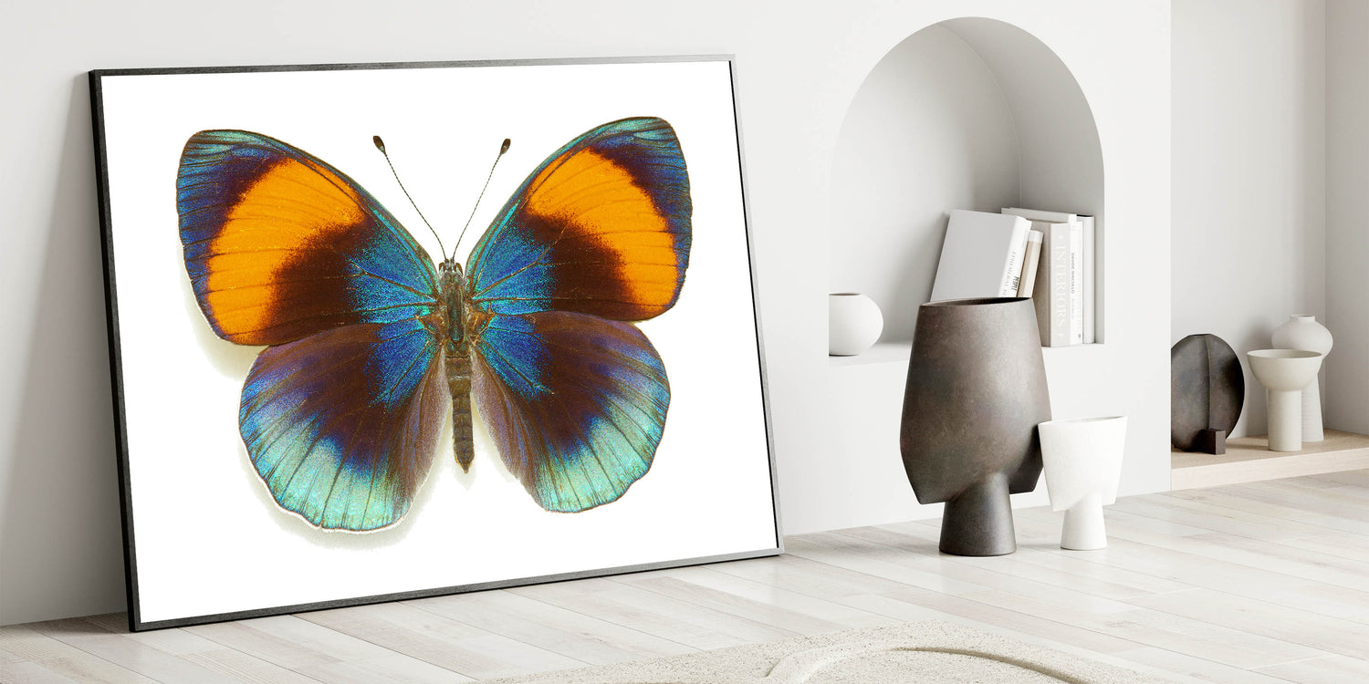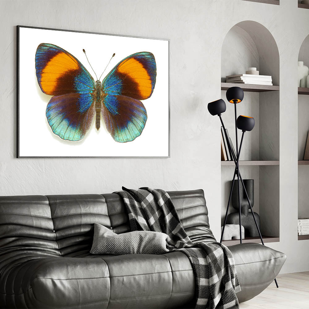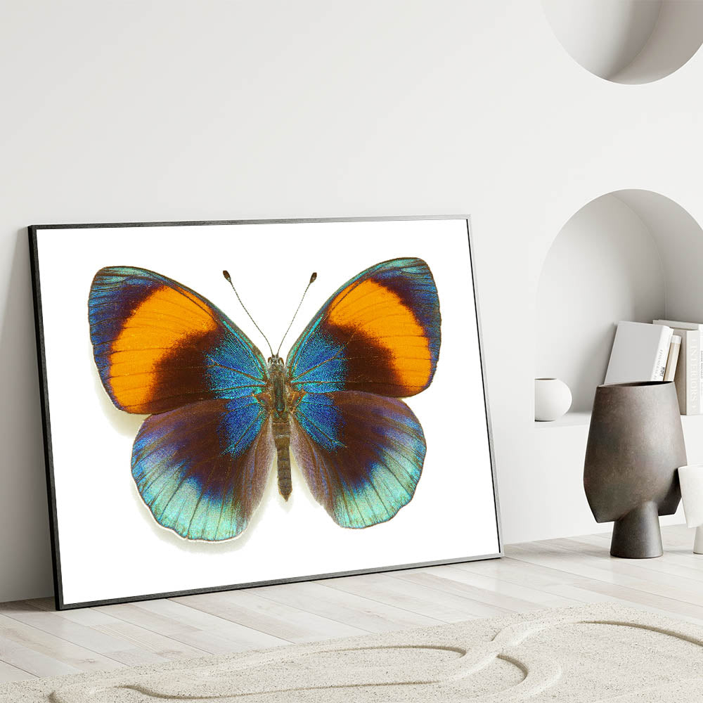 Add a burst of color to your space with this stunning Vibrant Blue & Orange Butterfly Wall Art. Featuring a butterfly with brilliantly iridescent blue wings contrasted by warm orange tips, this artwork captures the beauty and vibrancy of nature. Perfect for bringing a lively, energetic feel to any room, this Butterfly Canvas Print is ideal for those who love bold, striking designs in their décor.