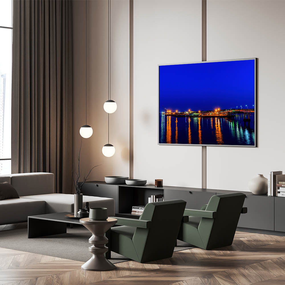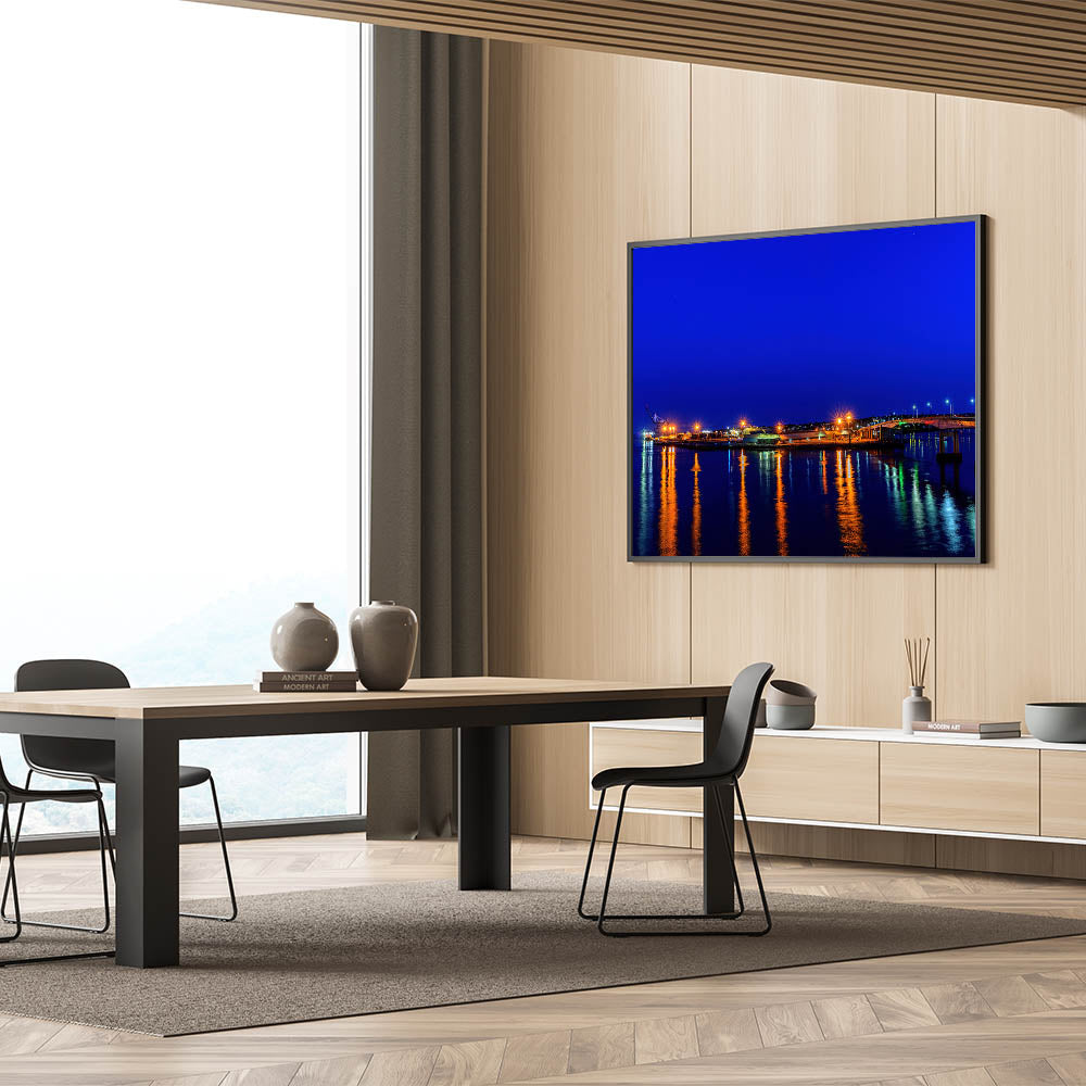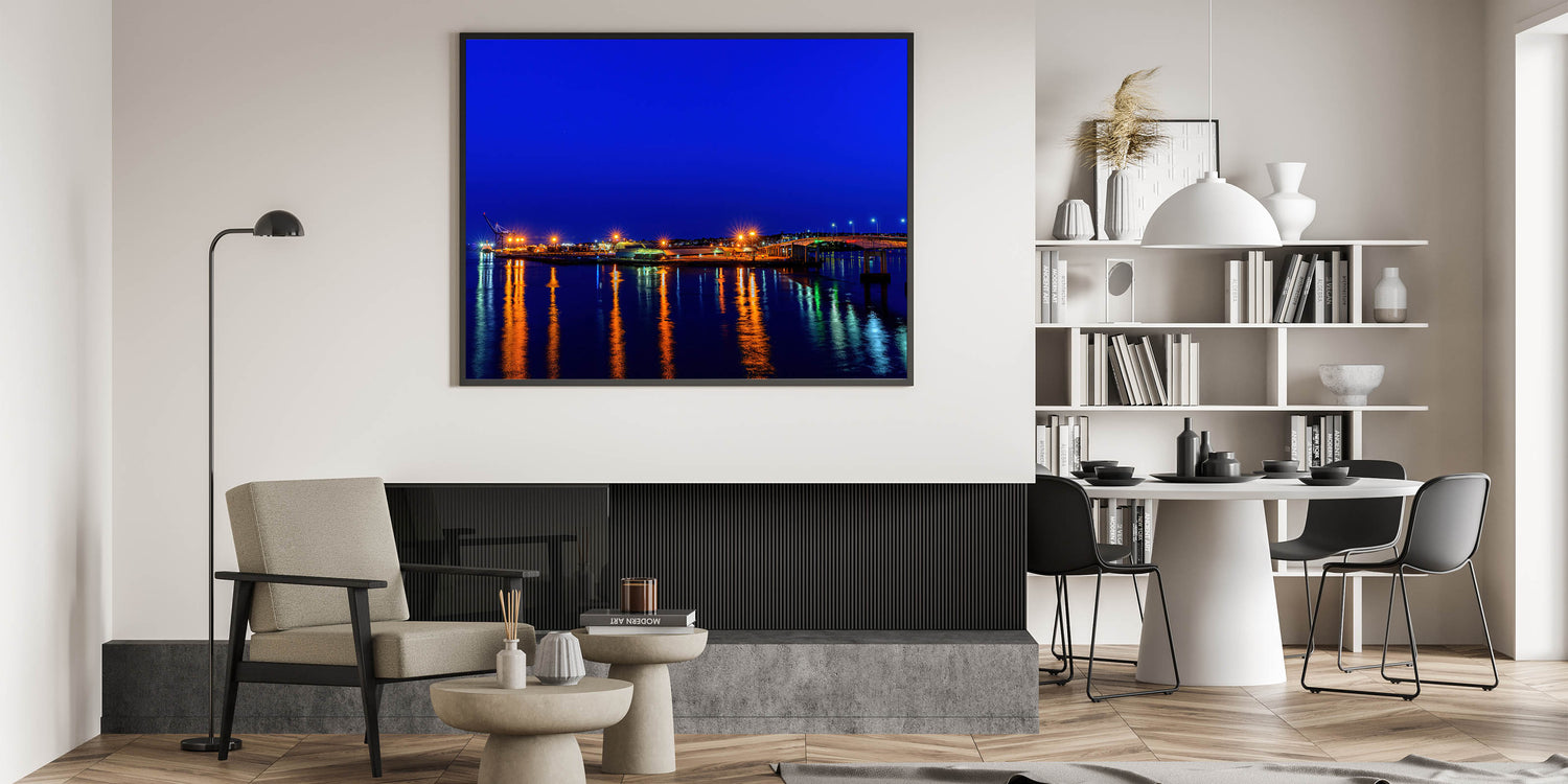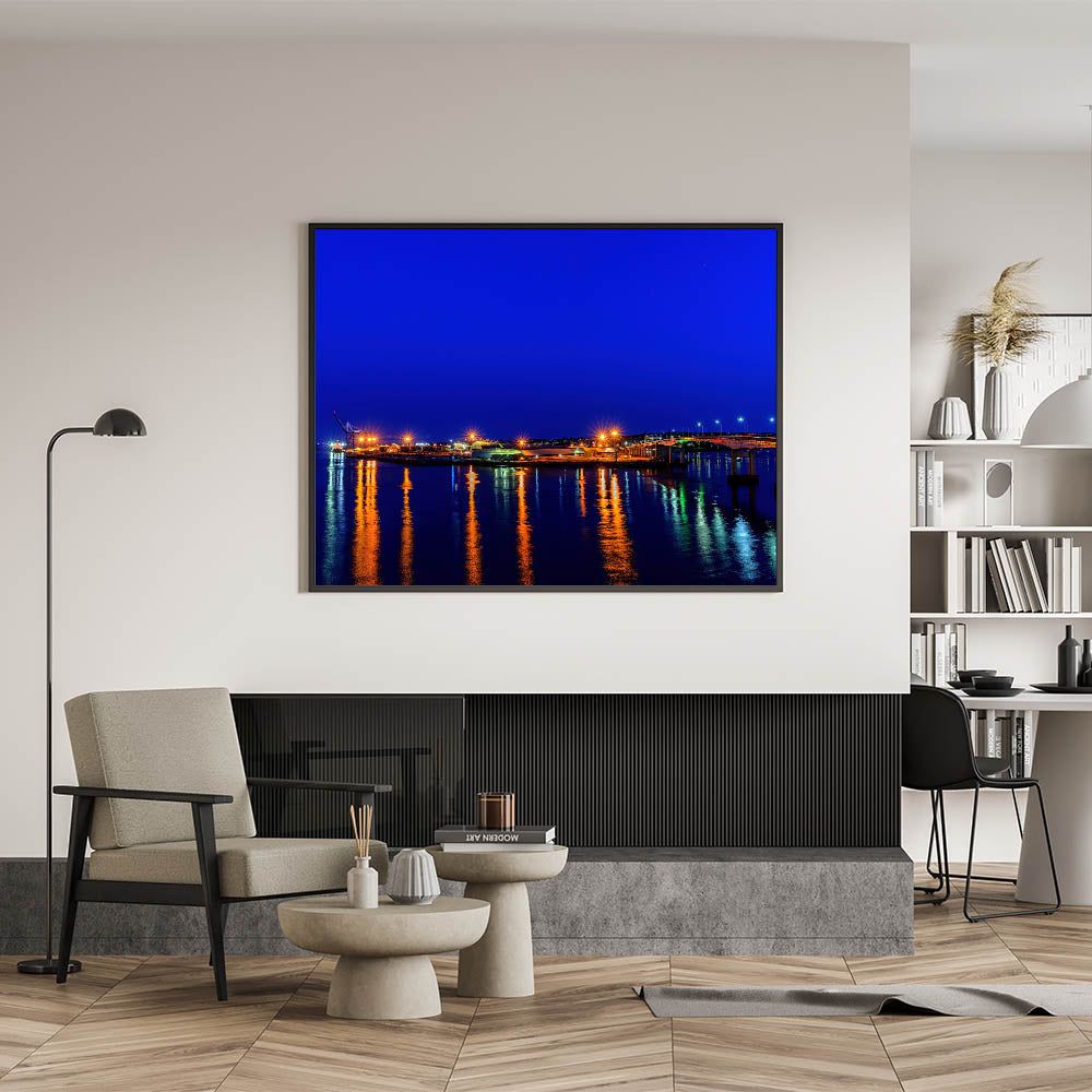 Experience the vibrant energy of city lights reflected on calm waters with this stunning night scene wall art. Capturing the illuminated waterfront of a New Brunswick harbor, this piece blends bright city lights with deep blue night skies, creating a striking contrast. Perfect for those who enjoy urban landscapes and coastal beauty, this artwork adds a touch of modern elegance to any space.