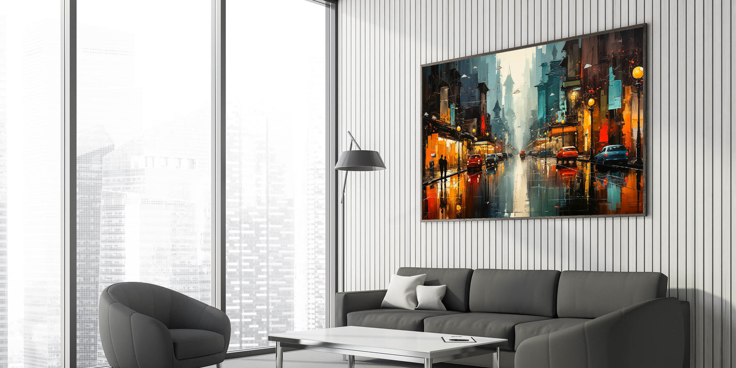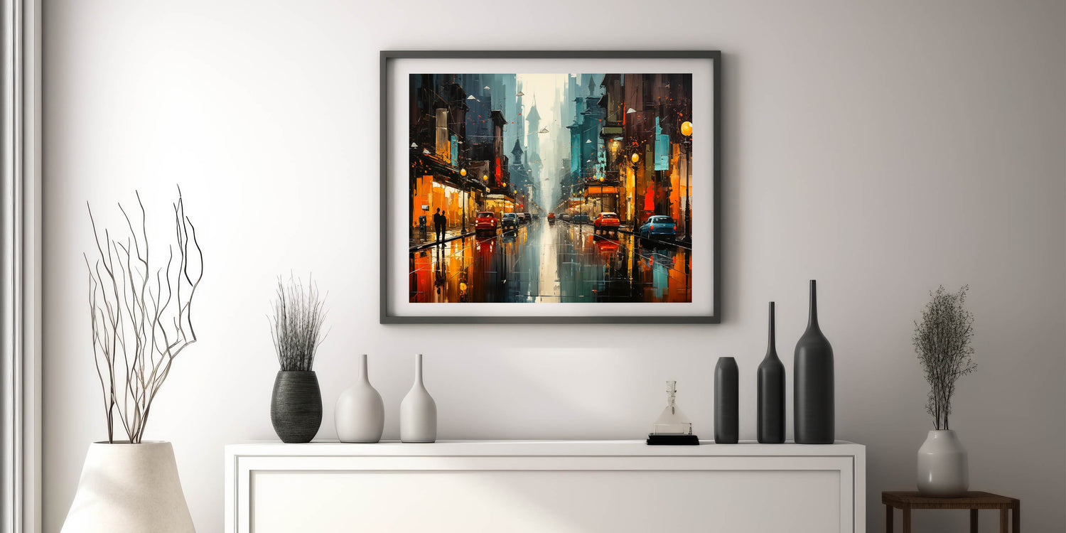 Vibrant City Nightscape Wall Art - Colorful Reflections on Wet Streets