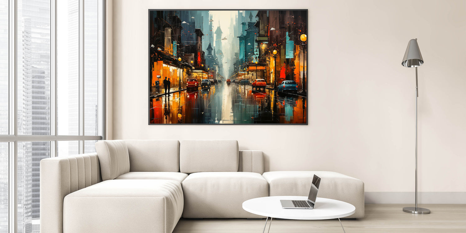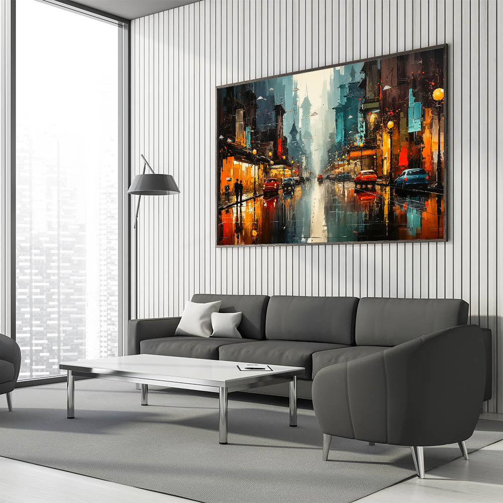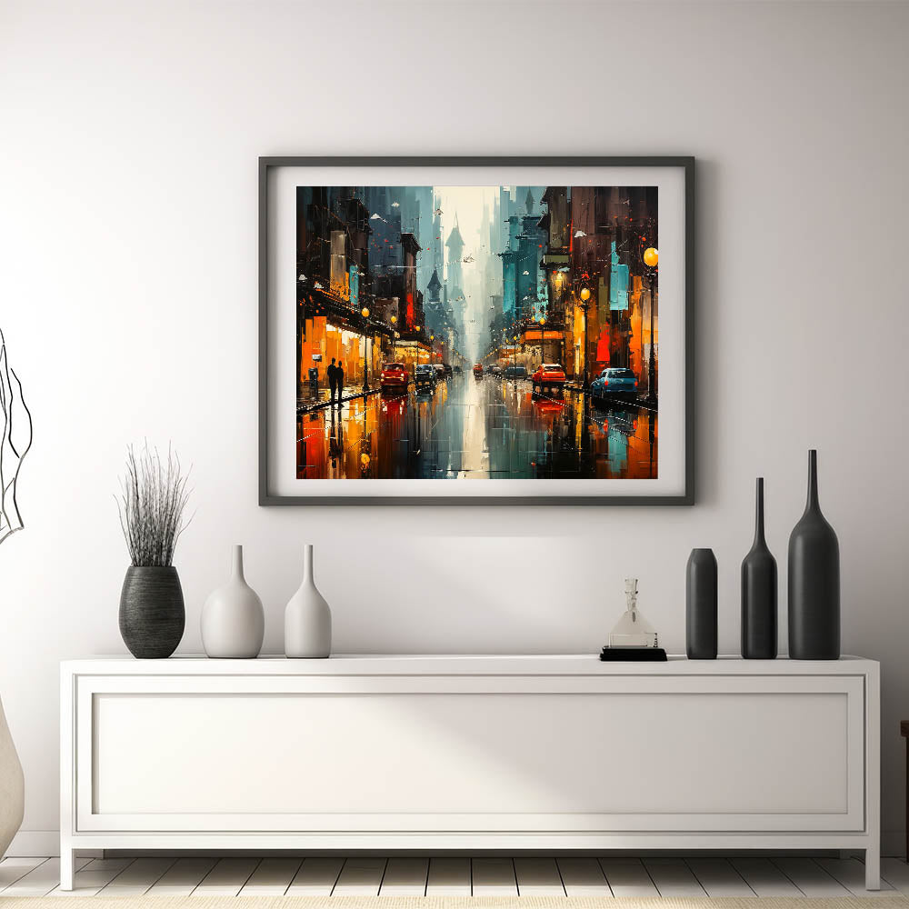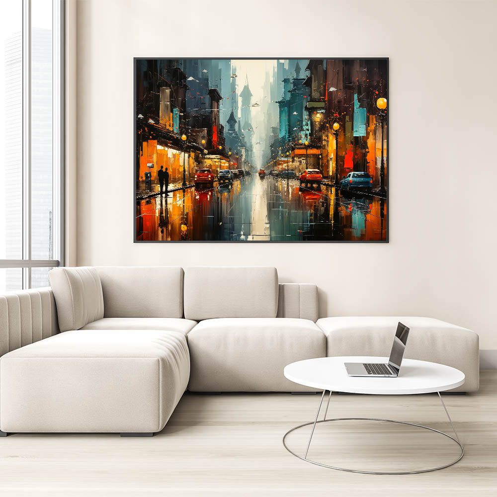 Immerse yourself in the vibrant energy of urban life with this stunning city nightscape wall art. The image captures a bustling city street at night, where glowing lights from buildings and cars reflect off wet pavement, creating a dynamic play of colors. The deep blues and bright oranges contrast beautifully, bringing a sense of movement and excitement to the scene. Perfect for those who appreciate the lively atmosphere of city nights, this artwork will add a modern and energetic touch to your home decor.