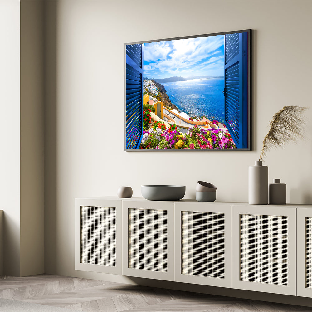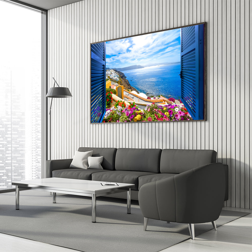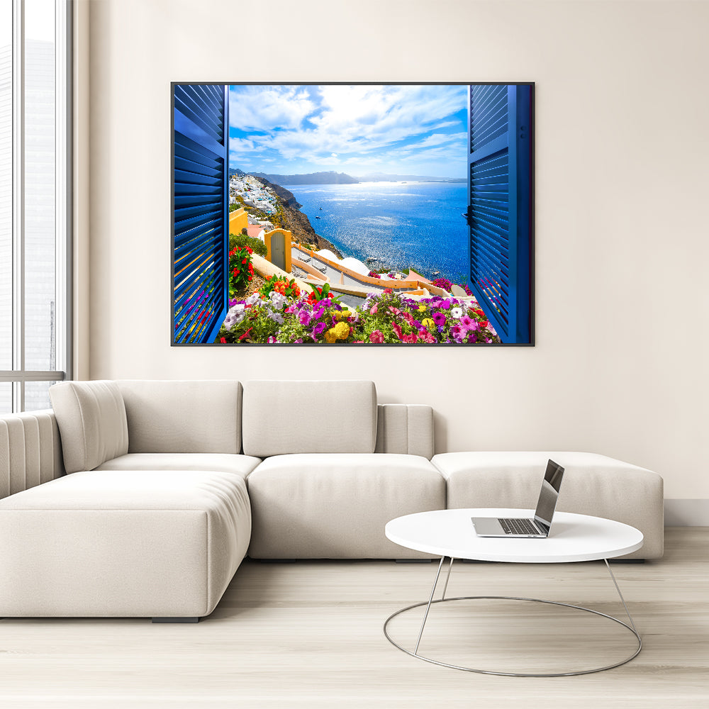 Bring the charm of a Mediterranean coastal town into your space with this stunning Vibrant Coastal Town Window Wall Art. Featuring a bright and colorful view through an open window with blue shutters, this artwork captures the essence of seaside living. The combination of vivid flowers, blue skies, and sparkling waters creates a lively yet peaceful atmosphere, perfect for any home or office decor.